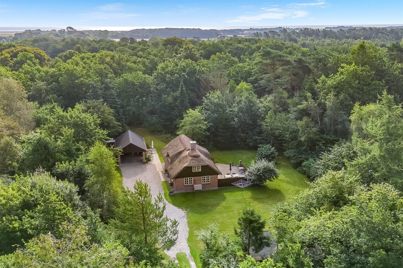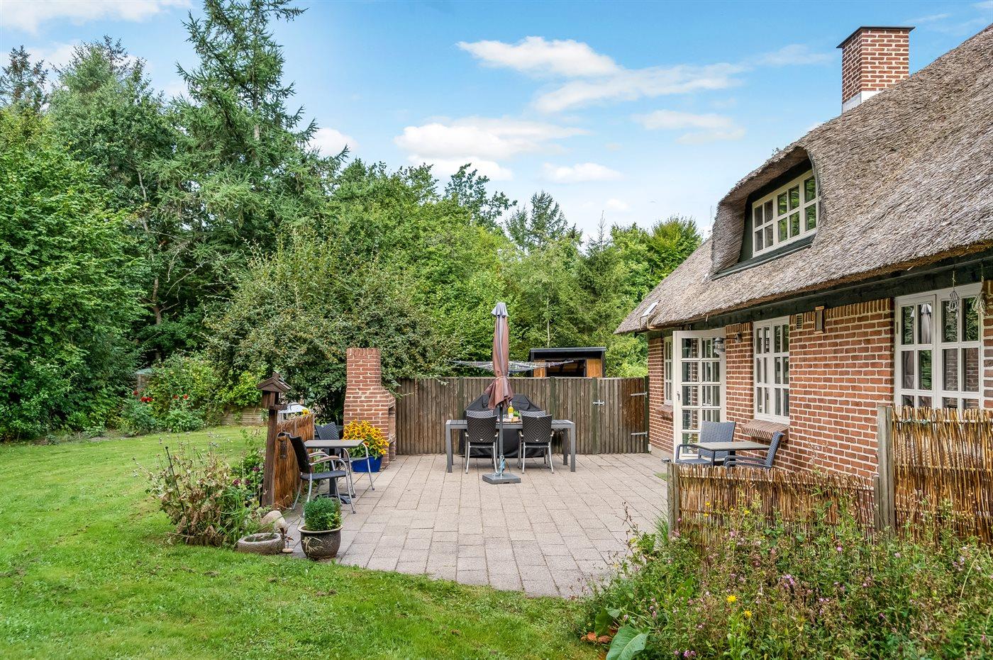 Hyggeligt stråtækt sommerhus i smuk natur med terrasse, grill og shelter til naturoplevelser tæt på havet.