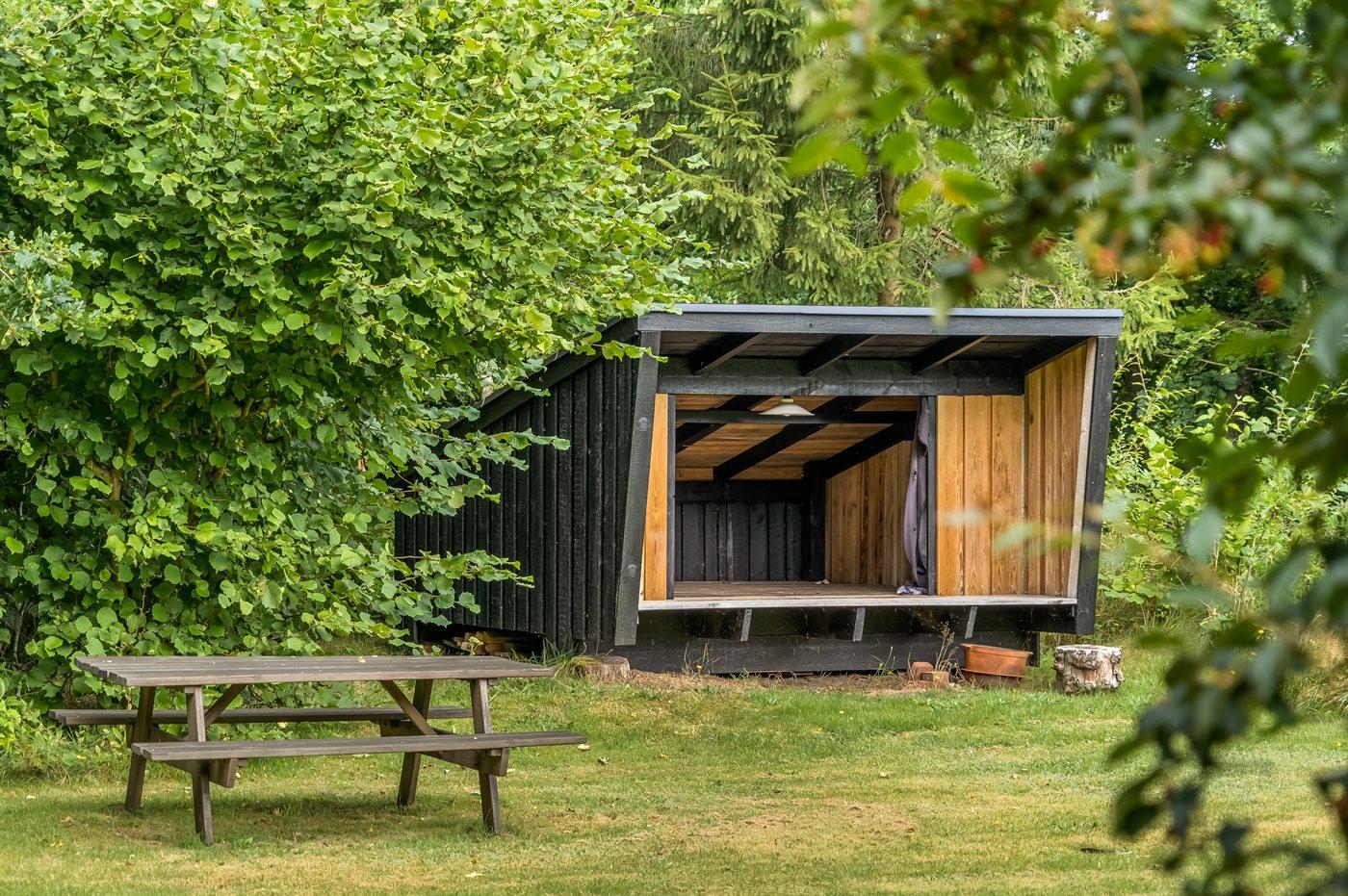 Huset har en dejlig terrasse med grill, hvor du kan nyde måltider i det fri. I haven finder du også et shelter – perfekt til en nat under åben himmel og en helt særlig oplevelse for både børn og voksne.
