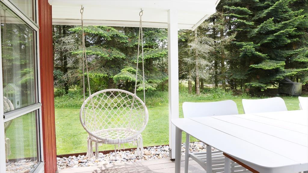 Udendørs kan du nyde livet på den delvist overdækkede terrasse mens solen går ned og aftenen falder på. Måske du hellere vil mærke solens stråler og nyde at slikke sol på terrassen eller bare tage en middagslur i skyggen under et træ. Hvis du har brug for action, kan du udfordre de andre i en dyst i haven med et spil petanque, badminton eller fodbold. Her er der muligheder for det hele.