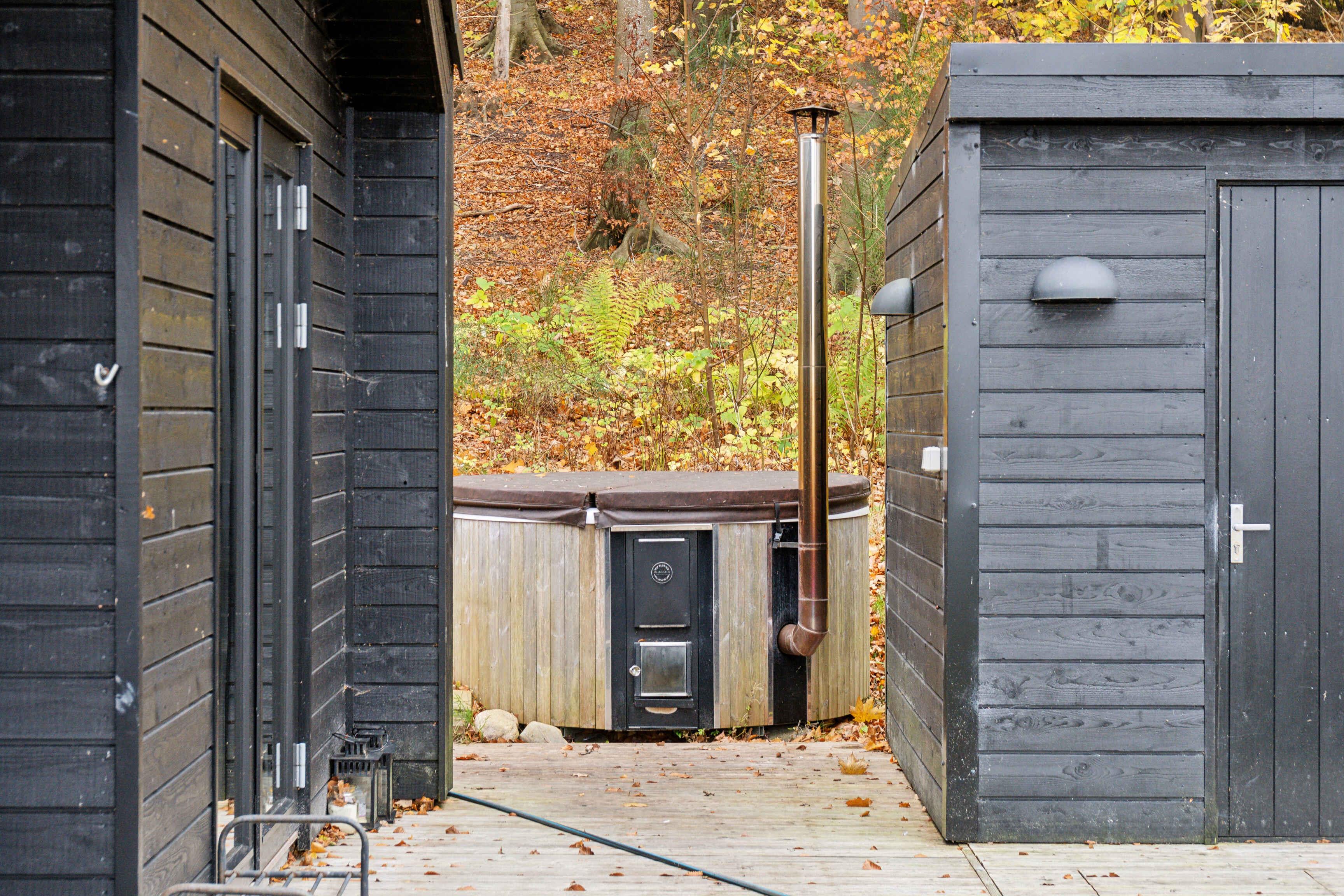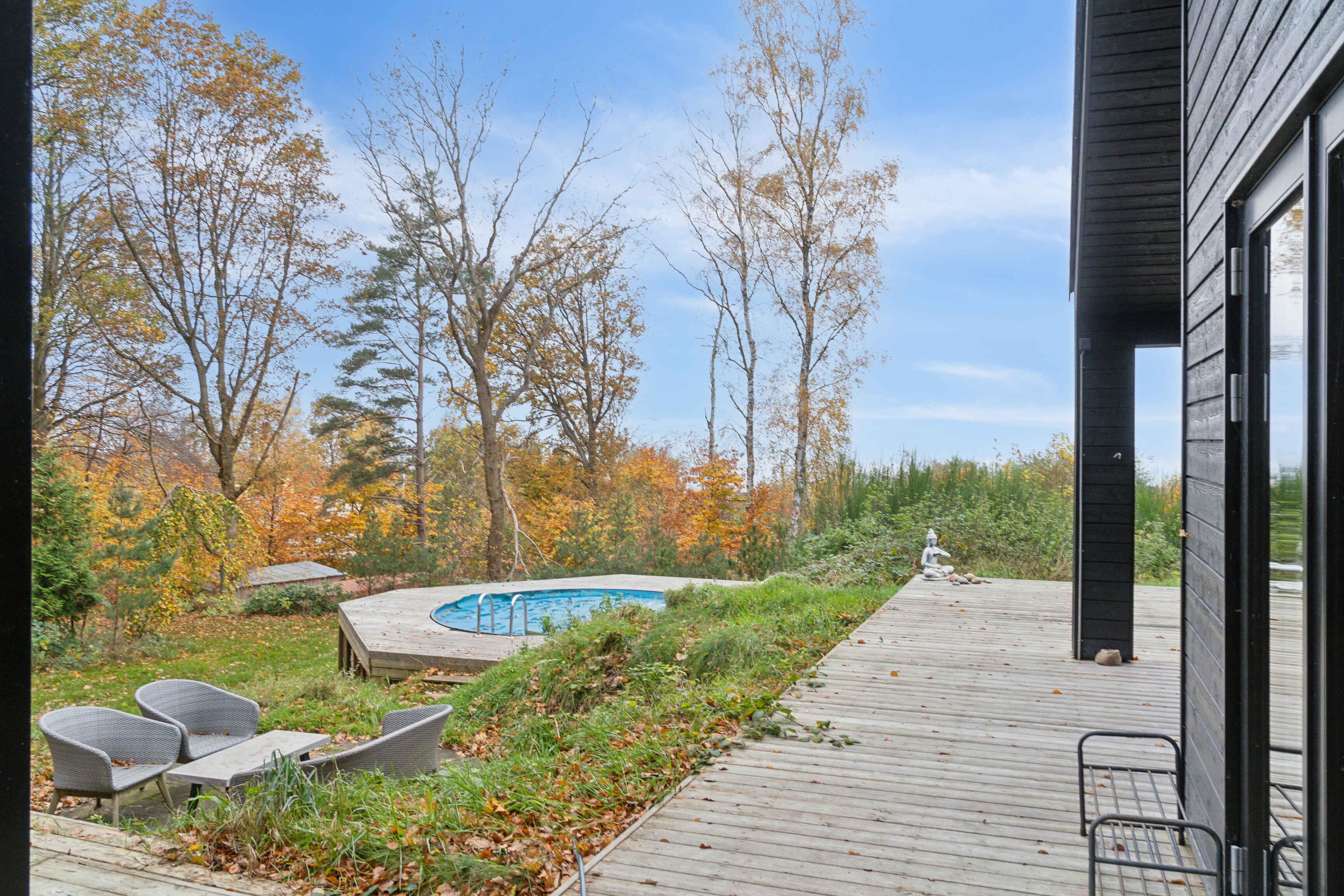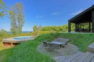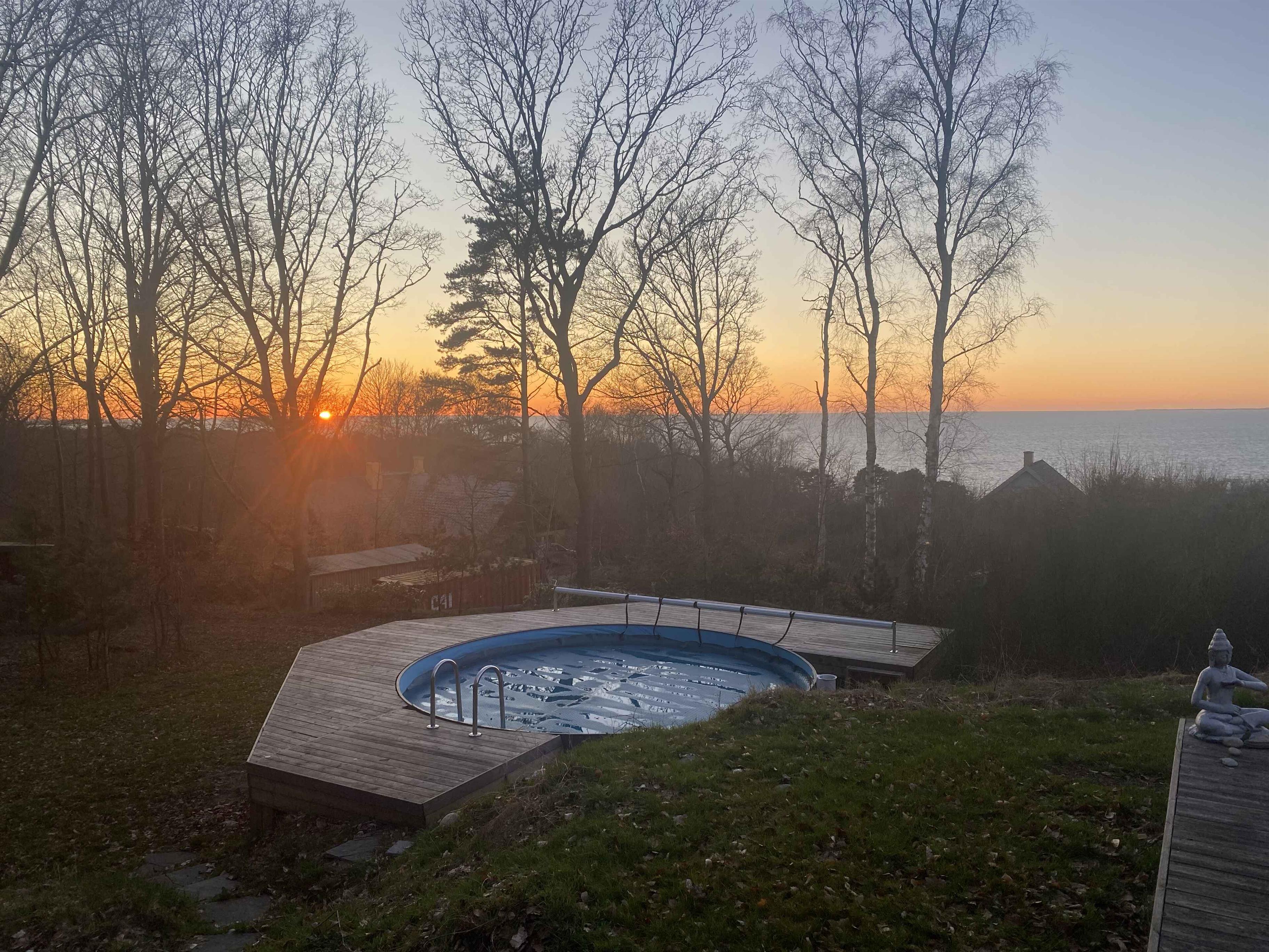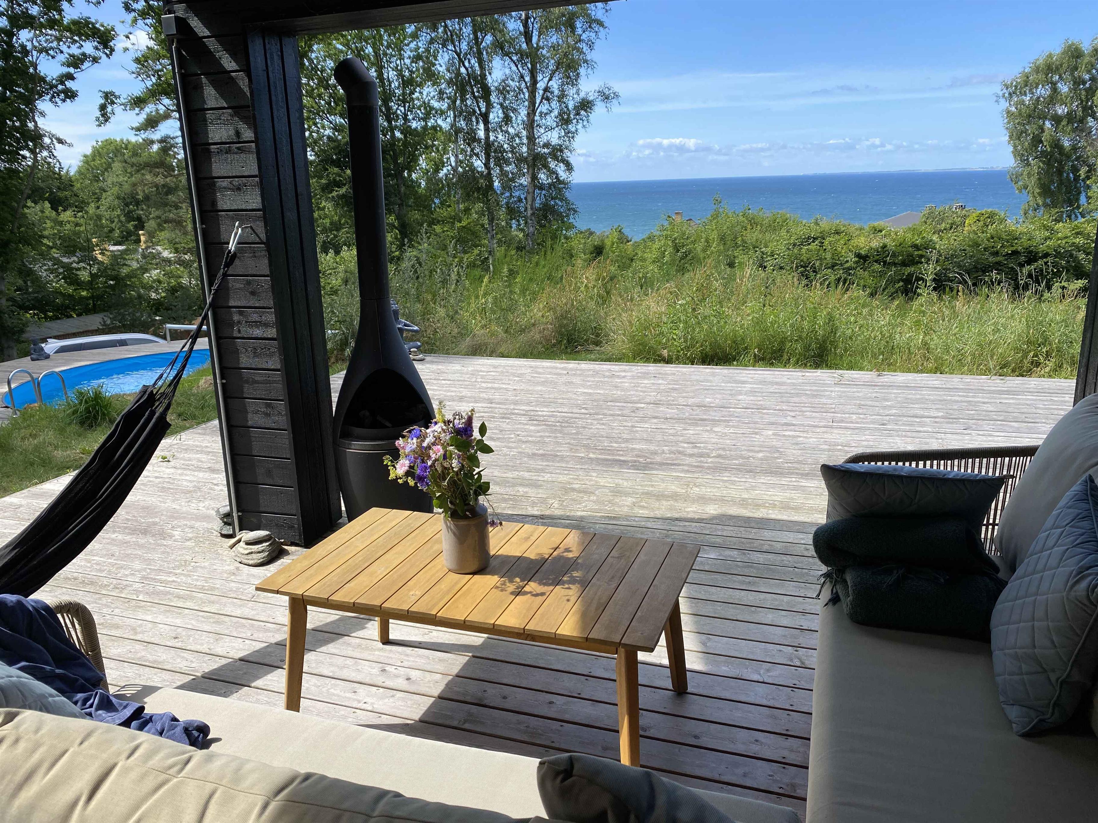 Stort og lyst sommerhus fra 2018 med udsigt over Sejrøbugten omgivet af skov og træer, trukket tilbage fra naboer, udendørs opvarmet pool (26-28 grader), vildmarksbad, shelter, sauna og spa inde , internet, brændeovn, varmepumpe, gratis træ
