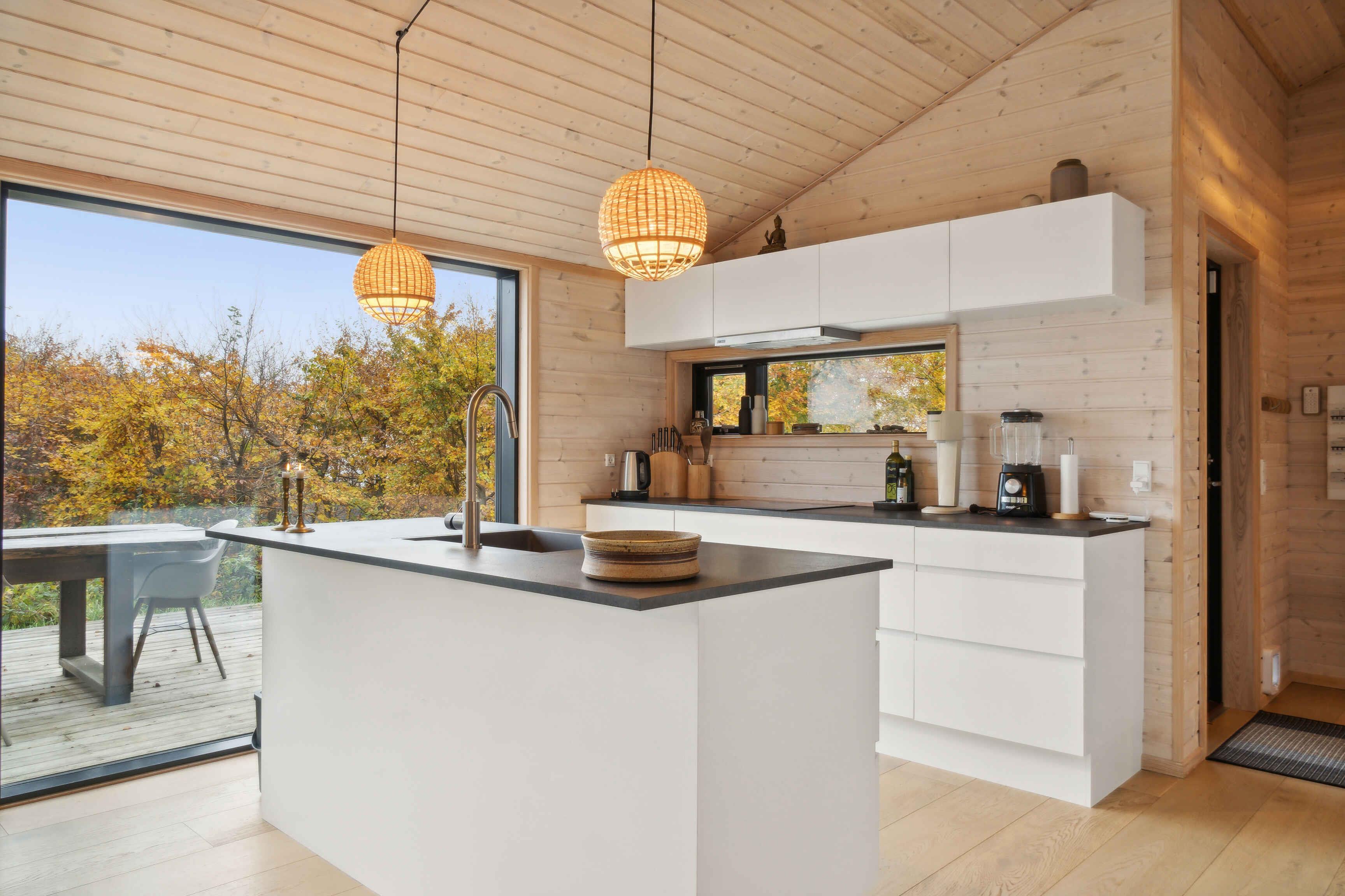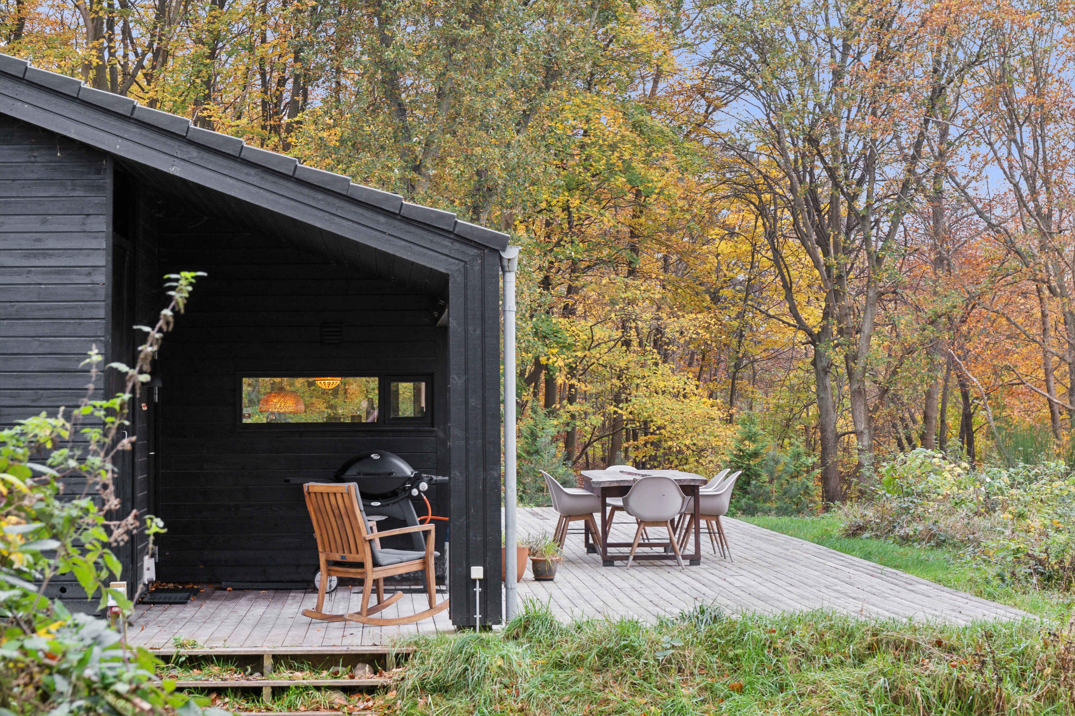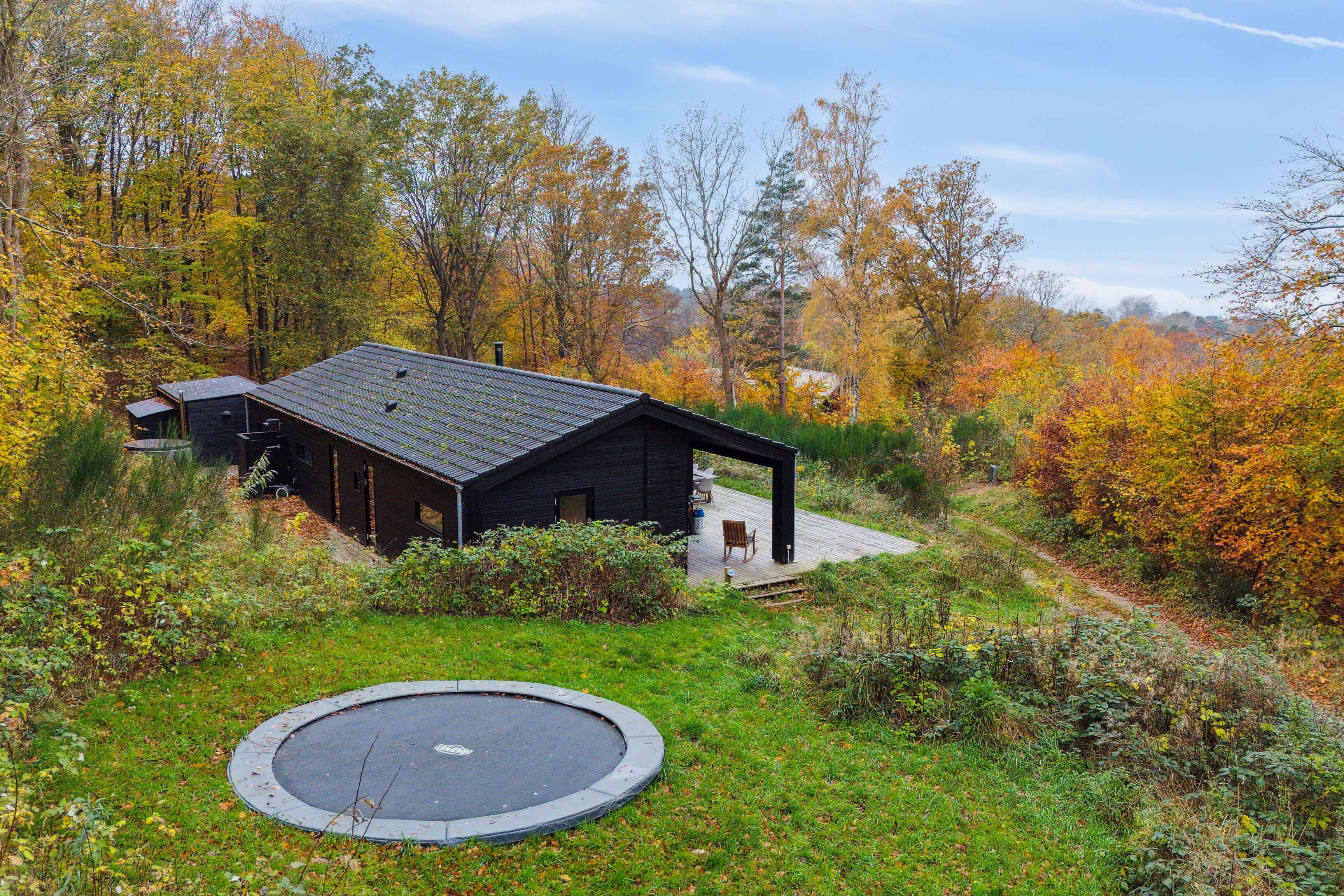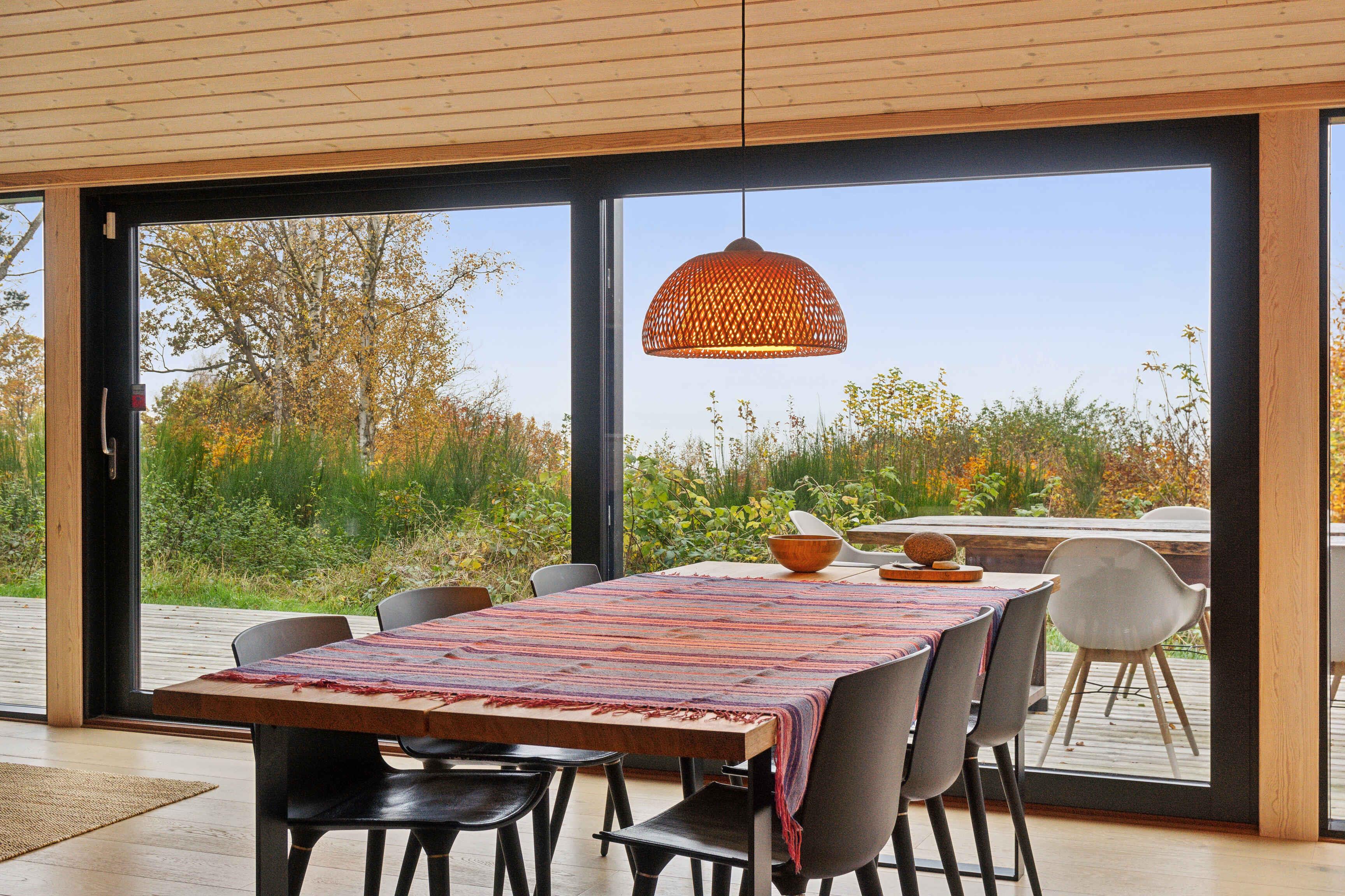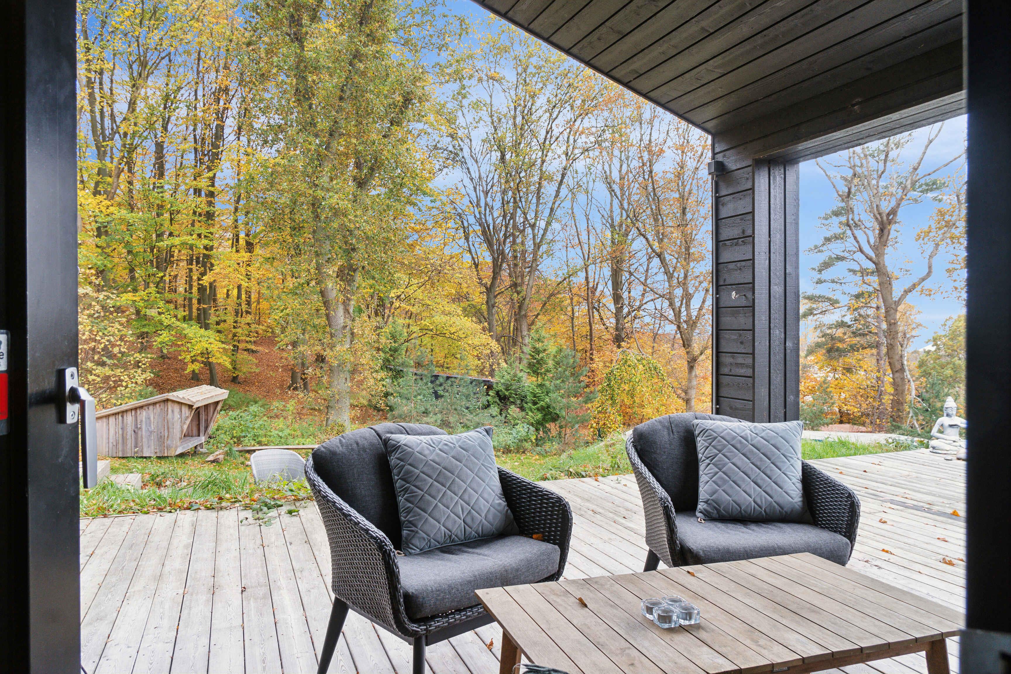 Stort og lyst sommerhus fra 2018 med udsigt over Sejrøbugten omgivet af skov og træer, trukket tilbage fra naboer, udendørs opvarmet pool (26-28 grader), vildmarksbad, shelter, sauna og spa inde , internet, brændeovn, varmepumpe, gratis træ