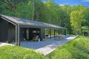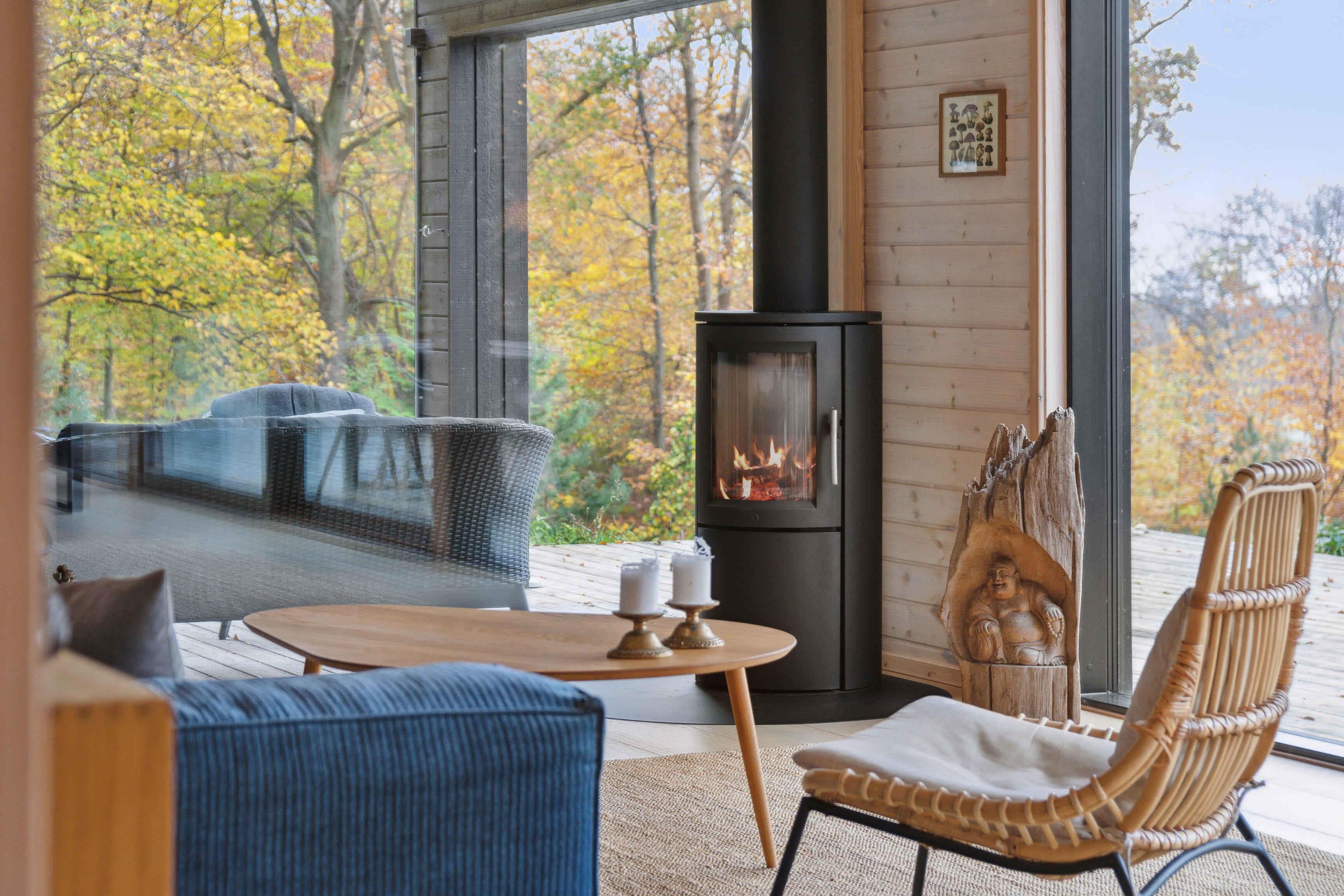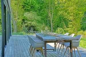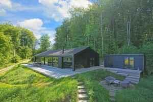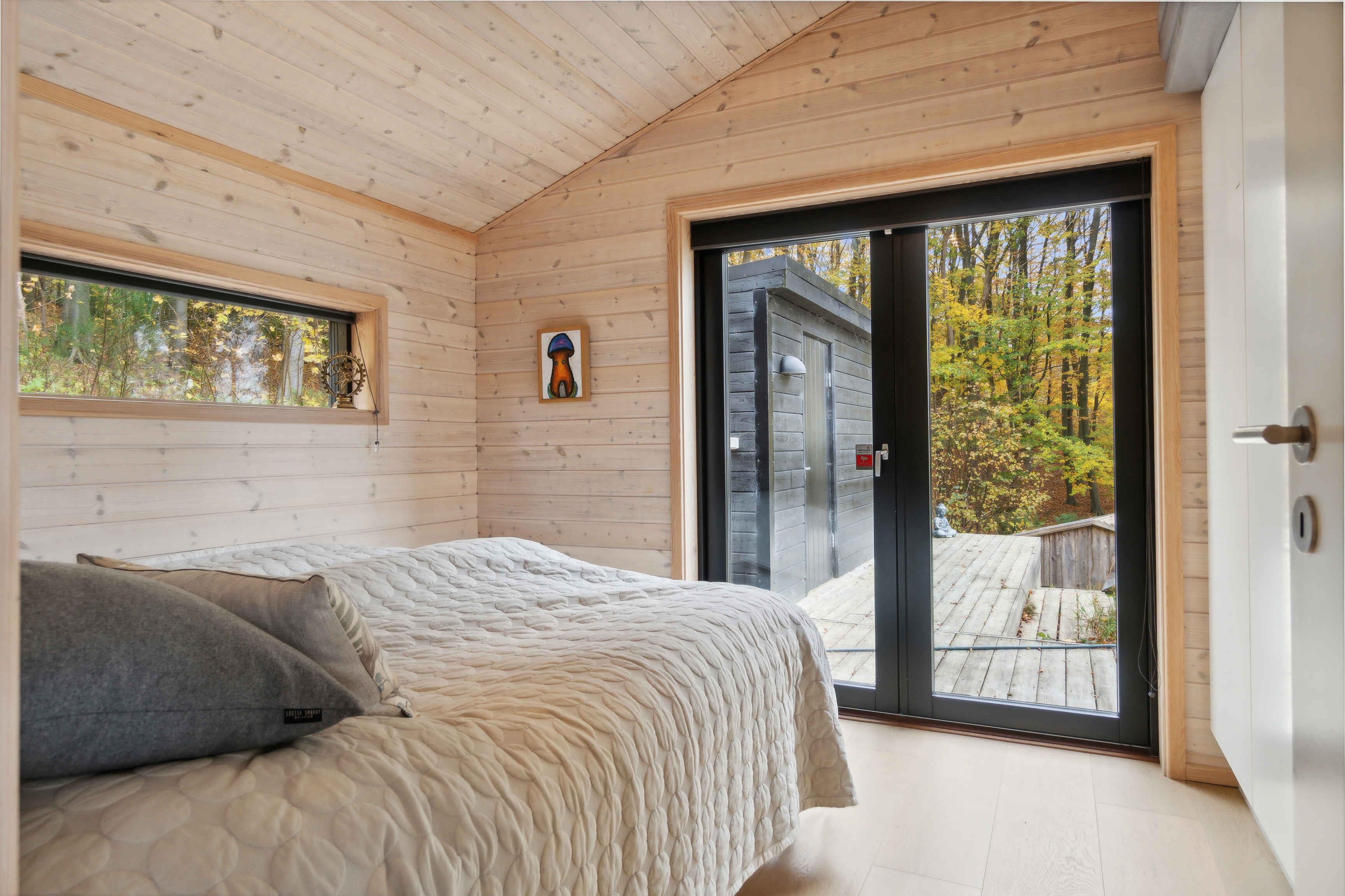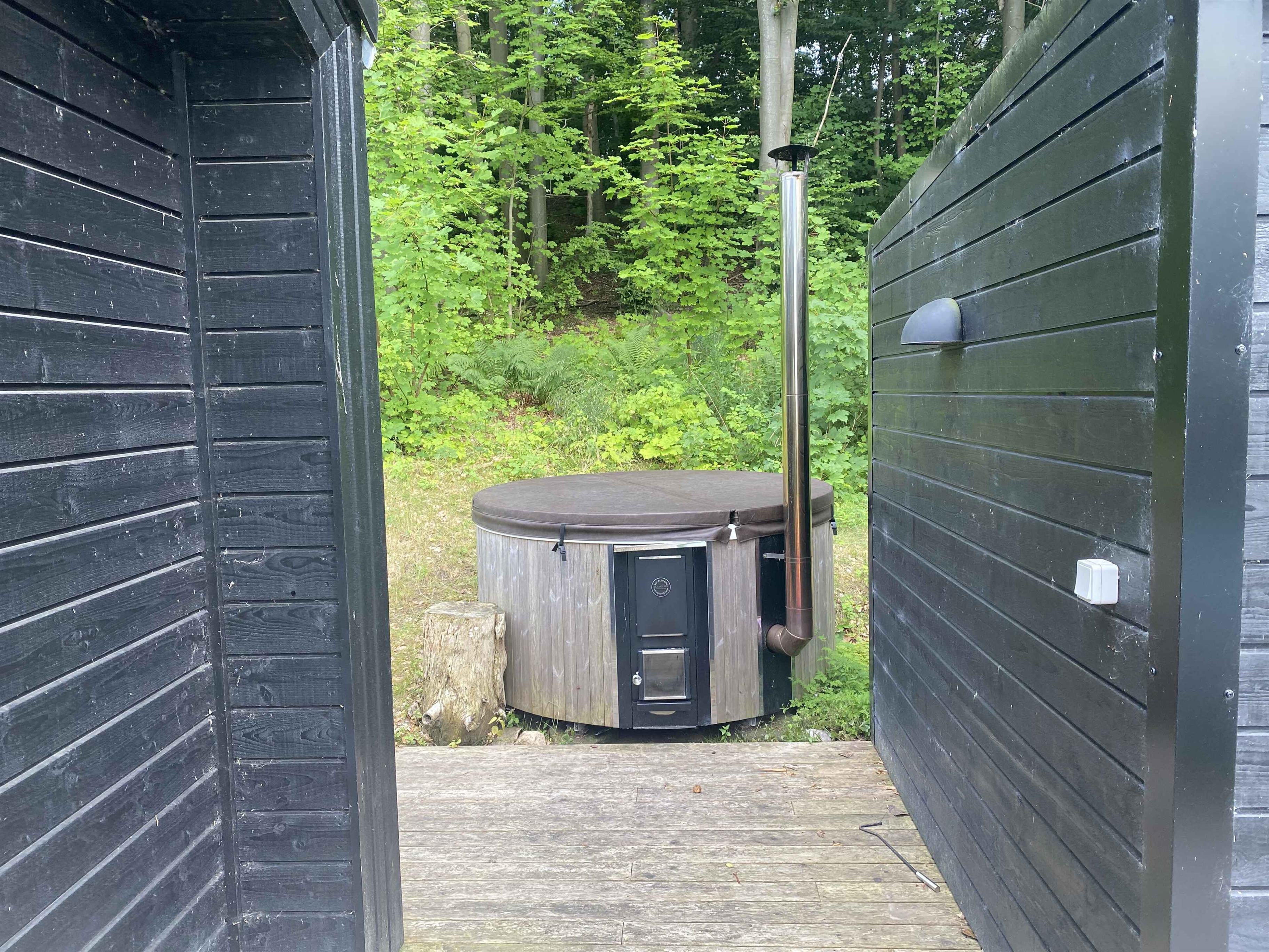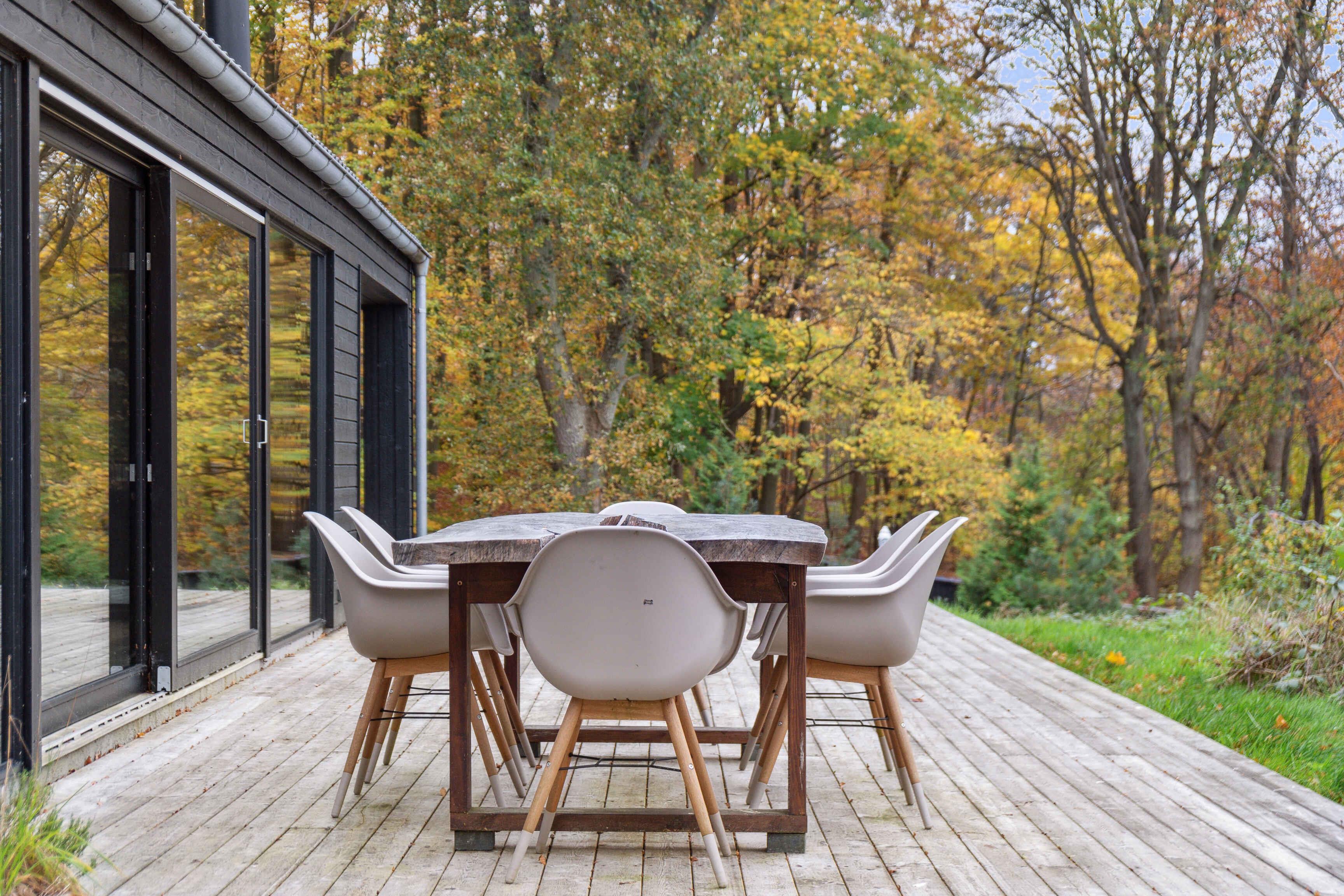Stort og lyst sommerhus fra 2018 med udsigt over Sejrøbugten omgivet af skov og træer, trukket tilbage fra naboer, udendørs opvarmet pool (26-28 grader), vildmarksbad, shelter, sauna og spa inde , internet, brændeovn, varmepumpe, gratis træ