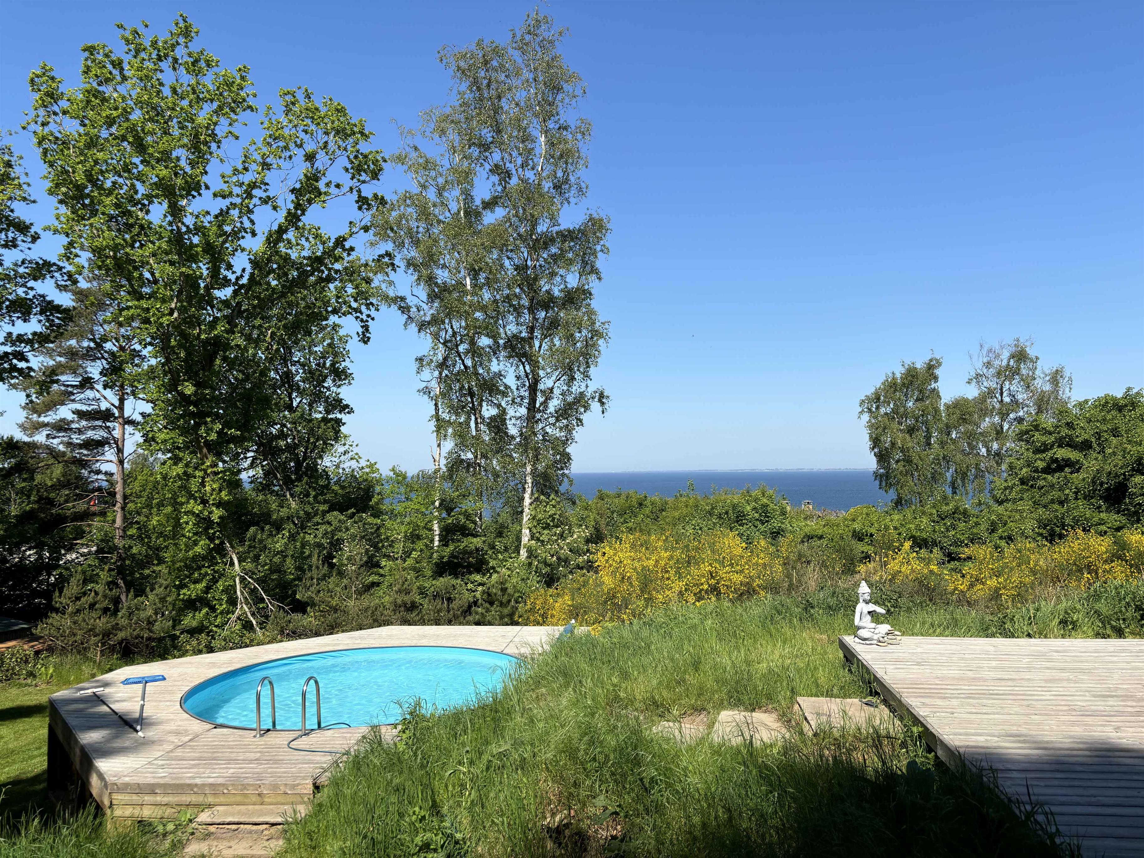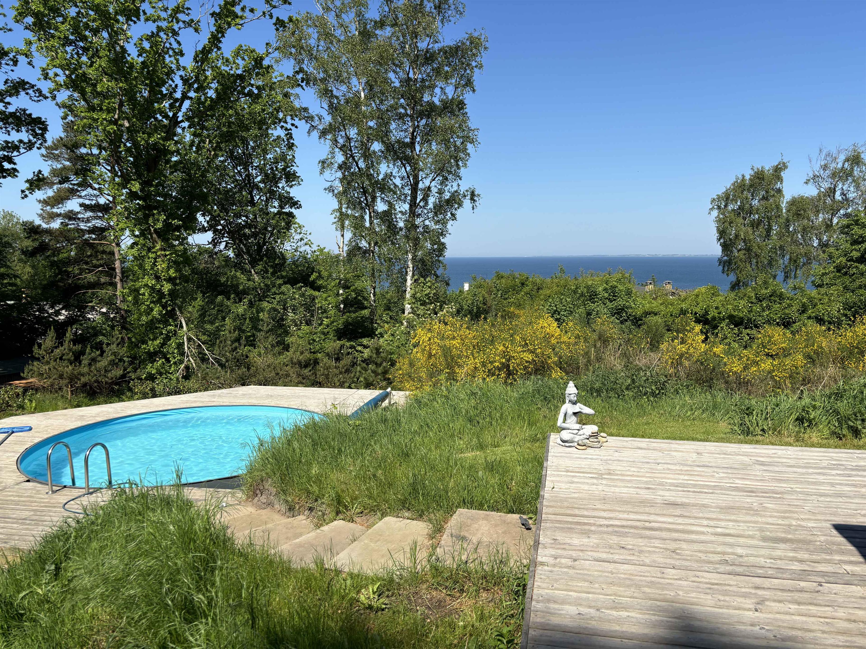 Skønt sommerhus ved Veddinge Bakker med havudsigt, opvarmet pool og vildmarksbad, perfekt til afslapning og naturoplevelser.