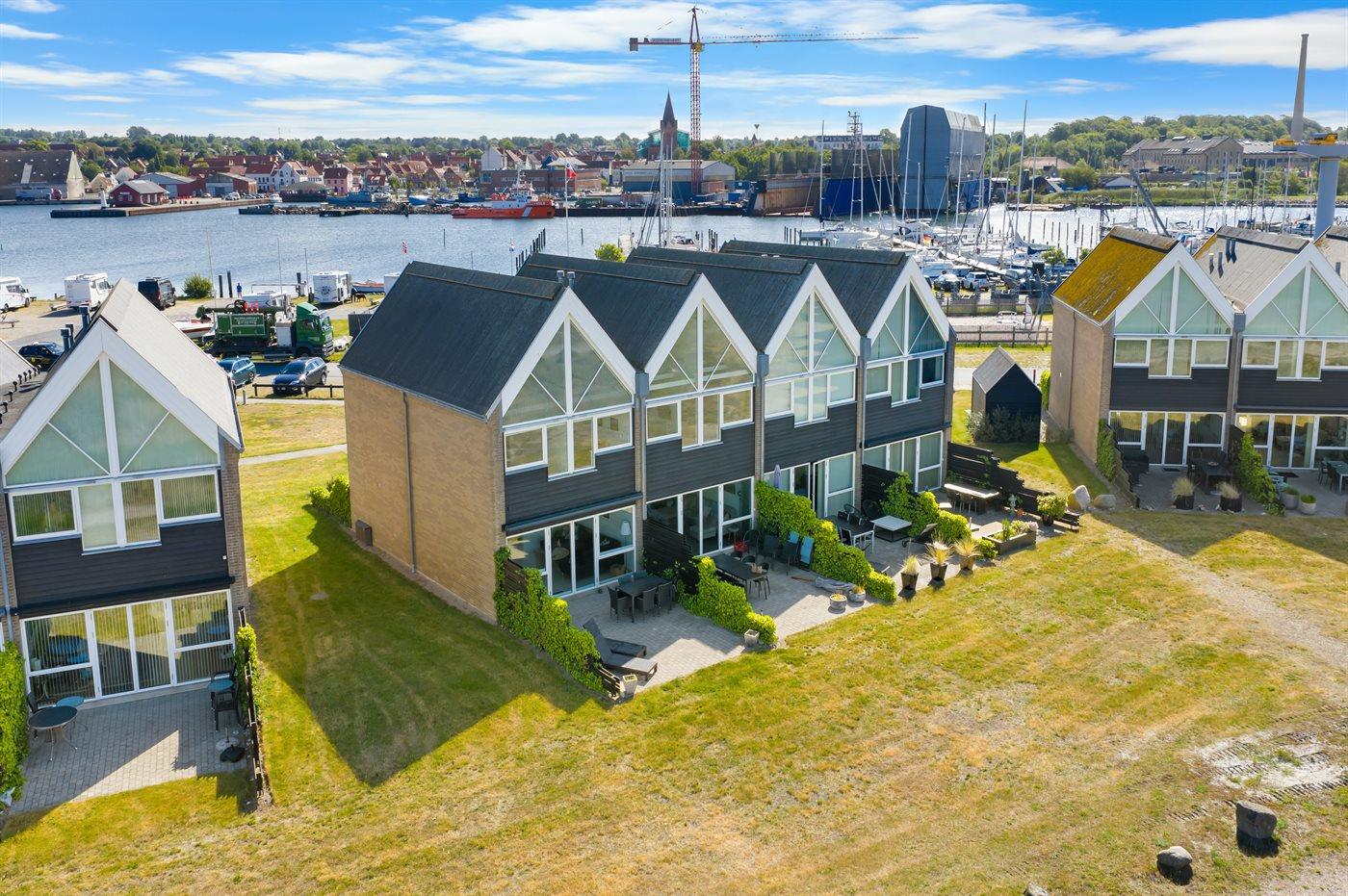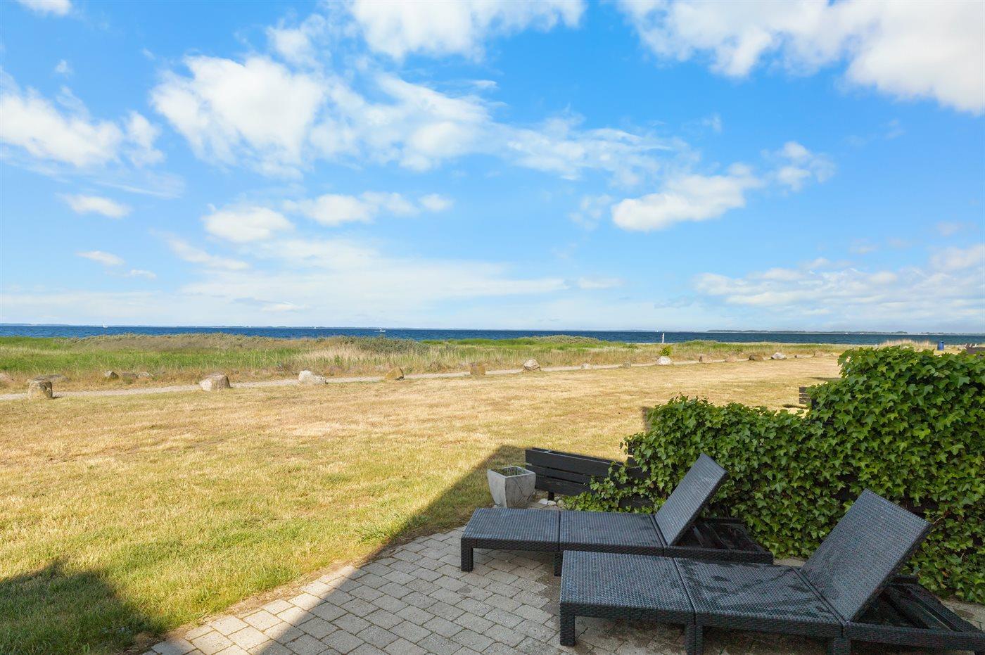 Fra både den sydvest-vendte terrasse, husets stue og værelserne på 1. sal, er der udsigt ud over stranden og vandet. På den anden side af huset er der udsigt til marinaen og Assens by. Indenfor kort gåafstand er der både legeplads, ishus, indkøb og hyggelige Assens by.