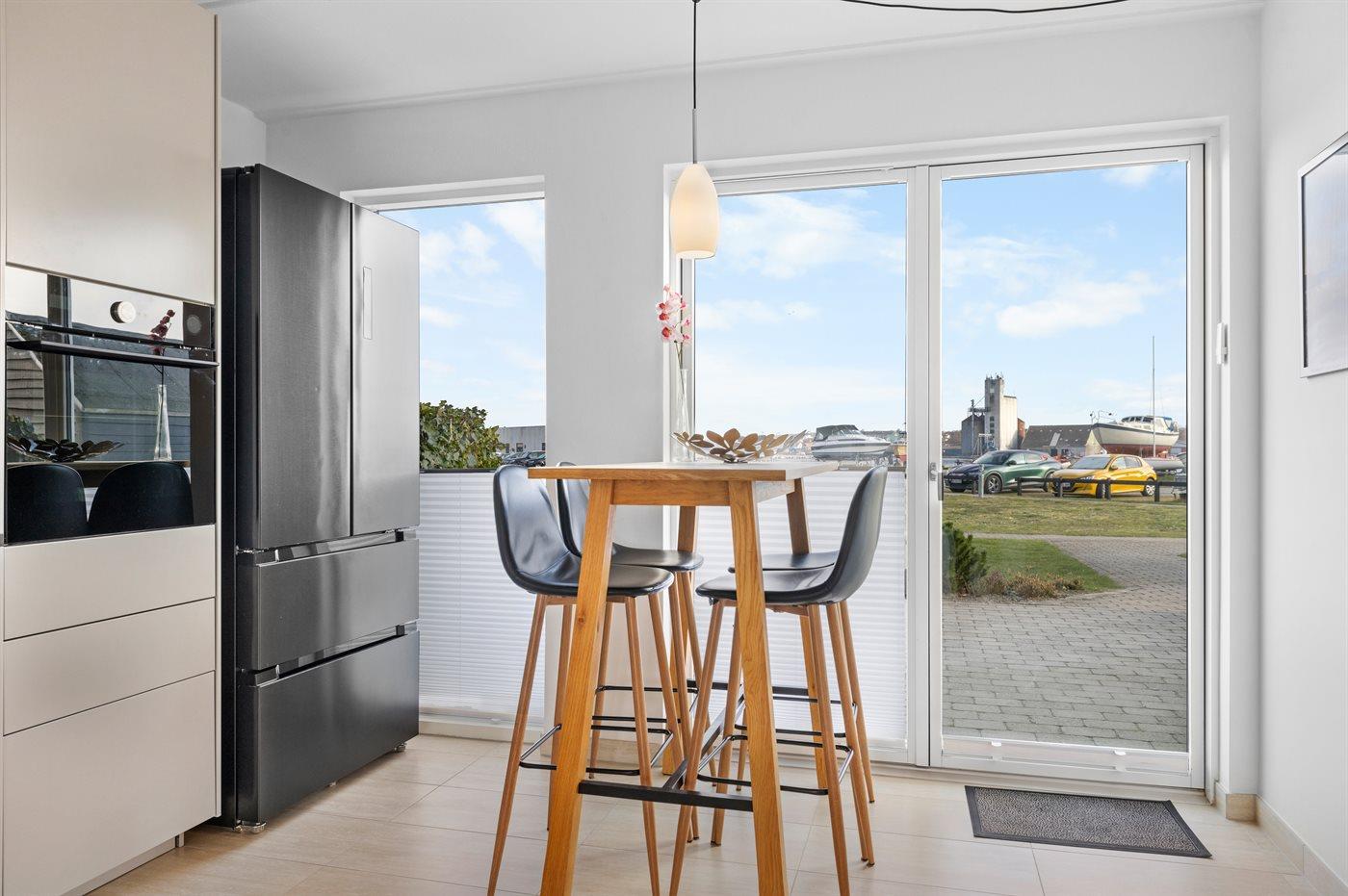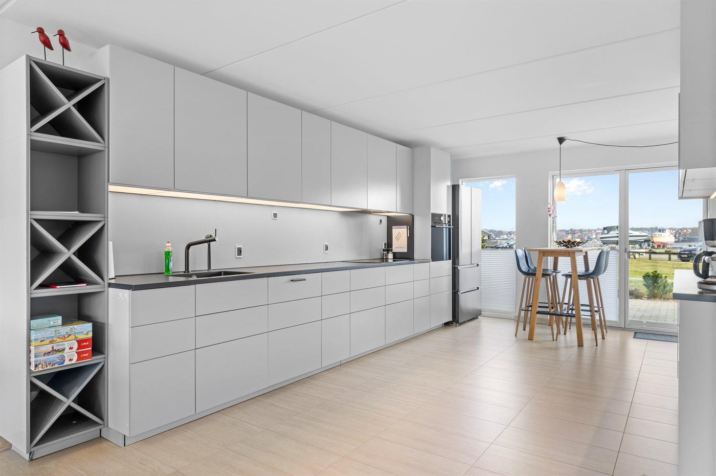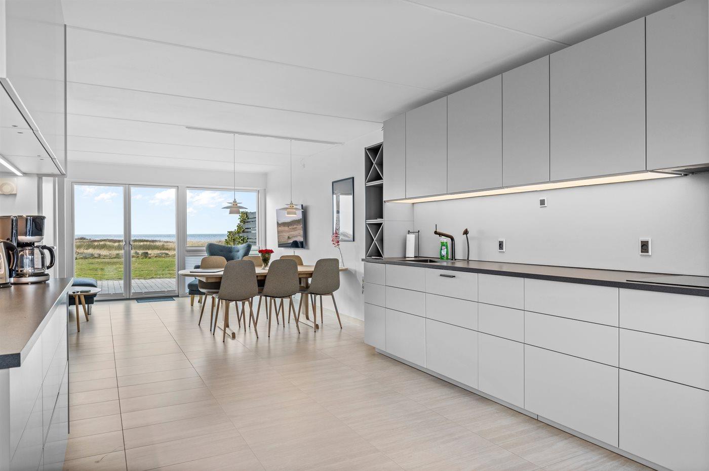 Køkkenet er udstyret med 1 køleskab. Der er 4 induktionskogeplader, varmluftovn, mikrobølgeovn samt opvaskemaskine.