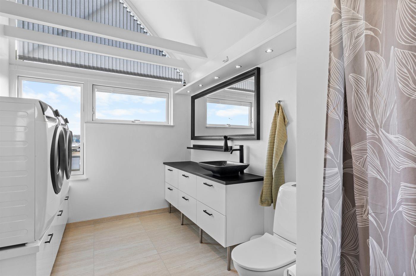 Der er 1 badeværelse med bruseniche og 2 toiletter, heraf 1 gæstetoilet. Der er gulvvarme på 1 badeværelse. Der er gulvvarme på gæstetoilettet.