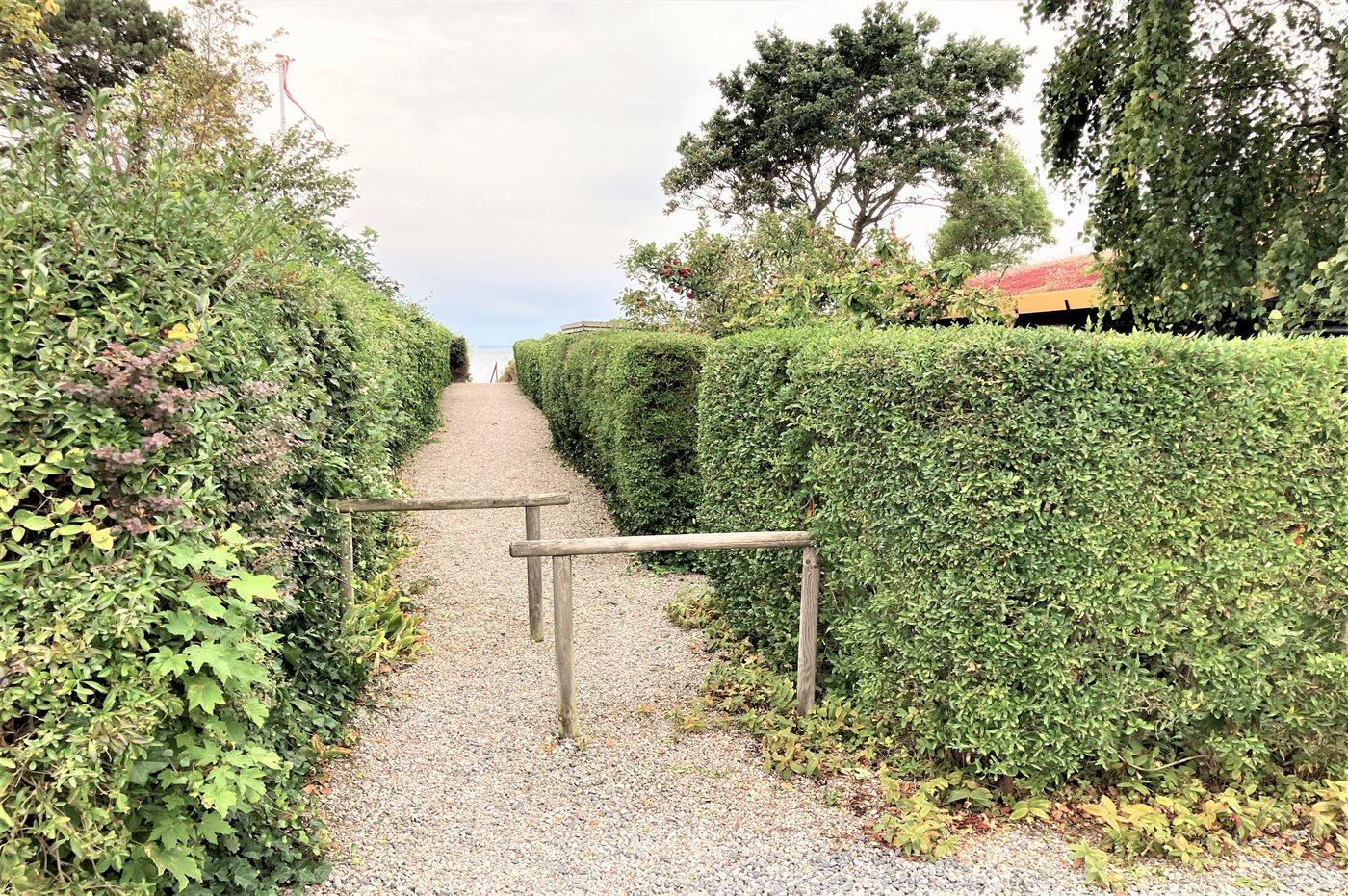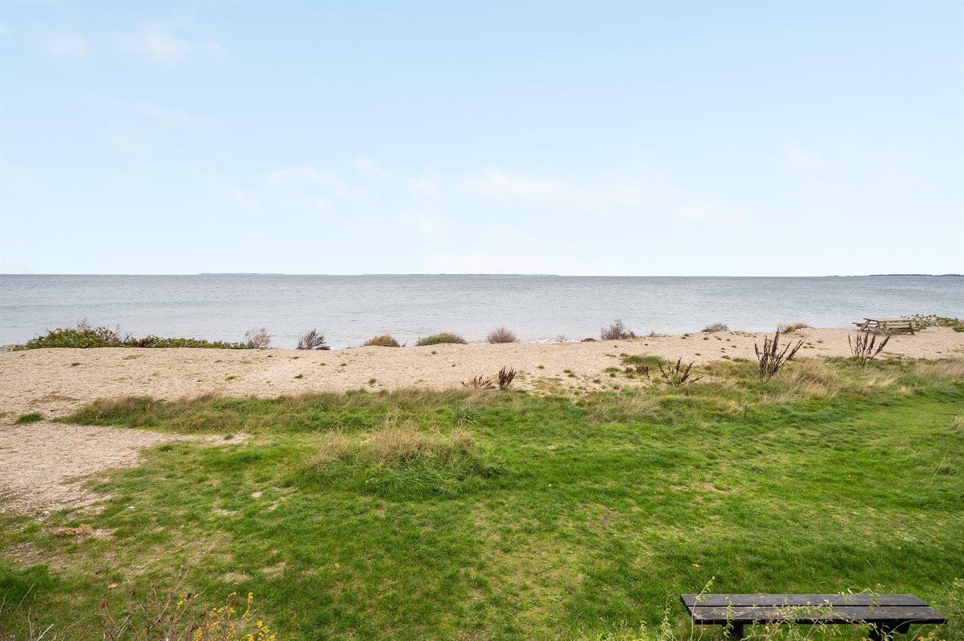 Huset ligger i 2. række - kun 50 meter fra stranden. Lige overfor huset ligger der en sti, som fører ned til den brede strand, hvor der i sommerperioden er opsat en stor og fælles badebro.