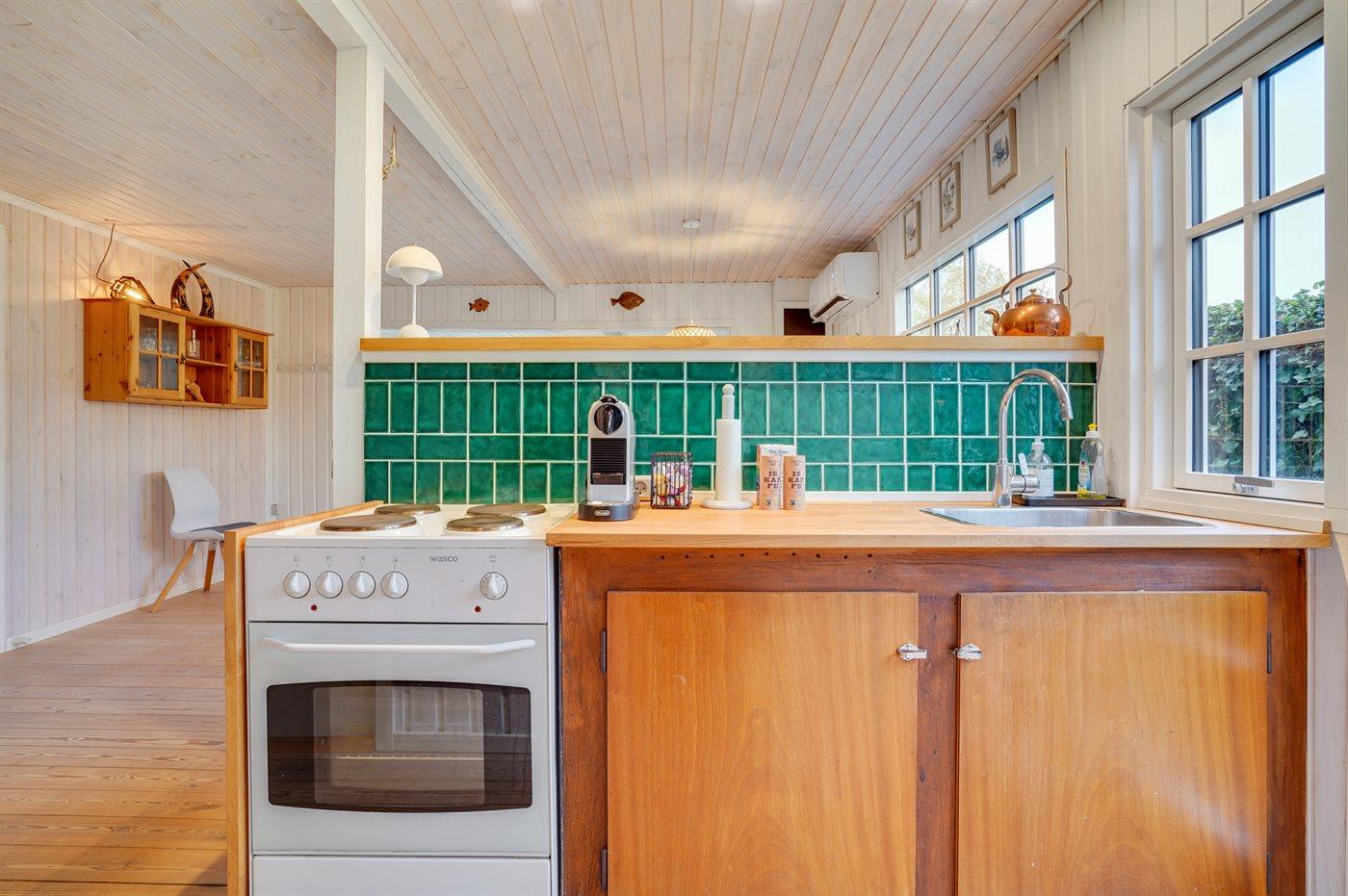 Køkkenet er udstyret med 1 køleskab. Der er 4 elkogeplader, varmluftovn, mikrobølgeovn.