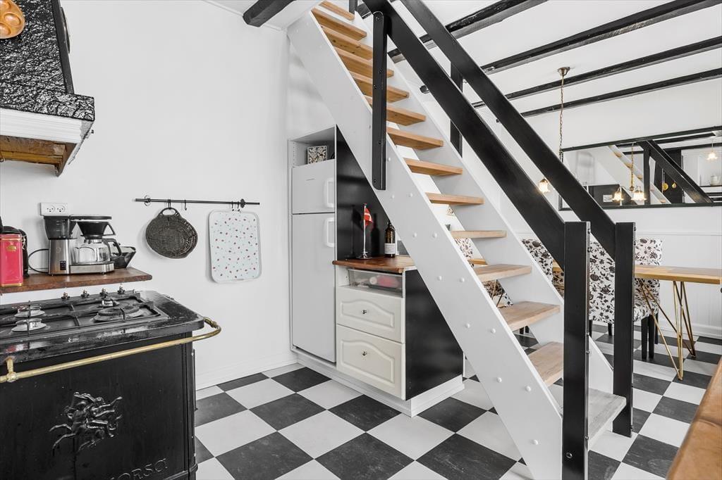 Selve huset indehold en smuk entré, hvorfra der er adgang til husets ene soveværelse med dobbeltseng og husets badeværelse med brus. Går man gennem entréen kommer man ind i en flot opholdsstue, og herfra er der åben forbindelse til spisestue og køkken. Fra køkkenet er der udgang til en skøn lukket gårdhave og med adgang til husets kælder, hvor man både vaskemaskine og tørretumbler. På husets 1.sal finders der en lille repos samt 2 dejlige soveværelser.