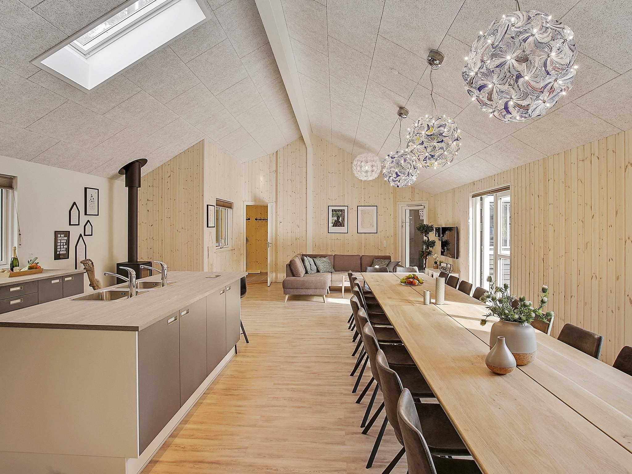 Spise-/opholdsrum er smagfuldt indrettet med stereoanlæg med cd-afspiller, tv, blu-ray afspiller, høj barnestol, sofaafdeling og brændeovn. I det gennemtænkte køkken med brændeovn er der stort køleskab, fryseskab samt to opvaskemaskiner og to komfurer, så der er rig mulighed for at kokkerere.