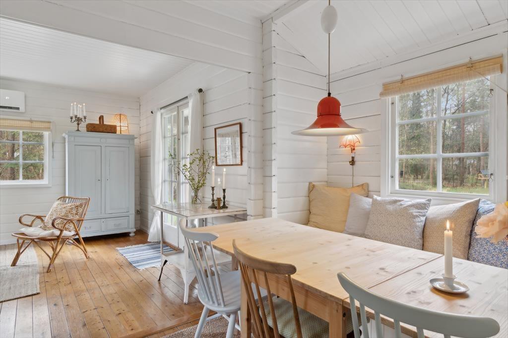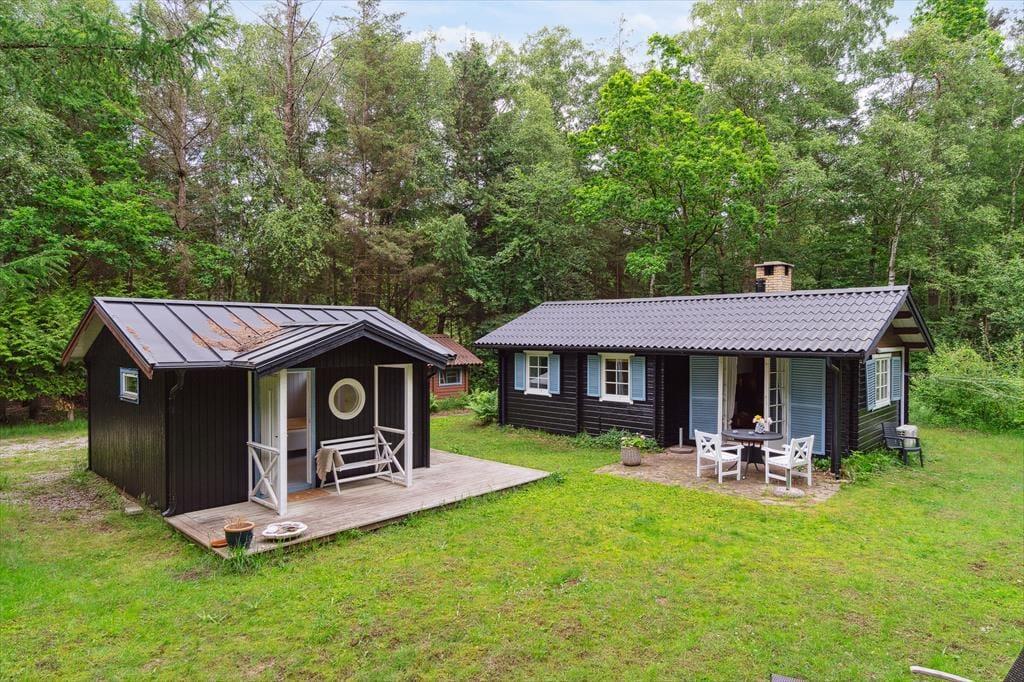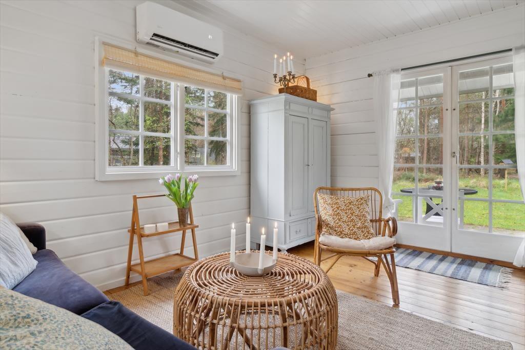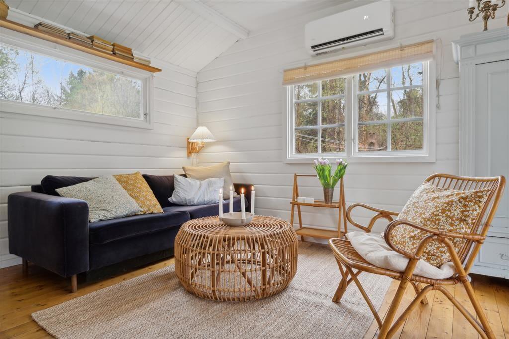 Dette charmerende sommerhus i Asserbo byder på en unik ferieoplevelse. Med sine blå døre og sprossede vinduer skiller huset sig ud som en eventyrlig oase i den nordsjællandske natur – og vækker minder om Bamses hus ude i skoven. Huset er et klassisk træhus, nænsomt renoveret med respekt for dets sjæl, men opdateret med moderne komfort og funktionalitet. Her er plads til 4 voksne og 2 børn, og alt er indrettet med tanke på både hygge og afslapning.