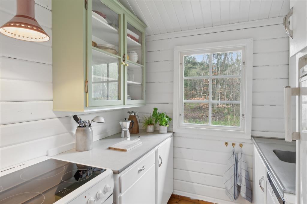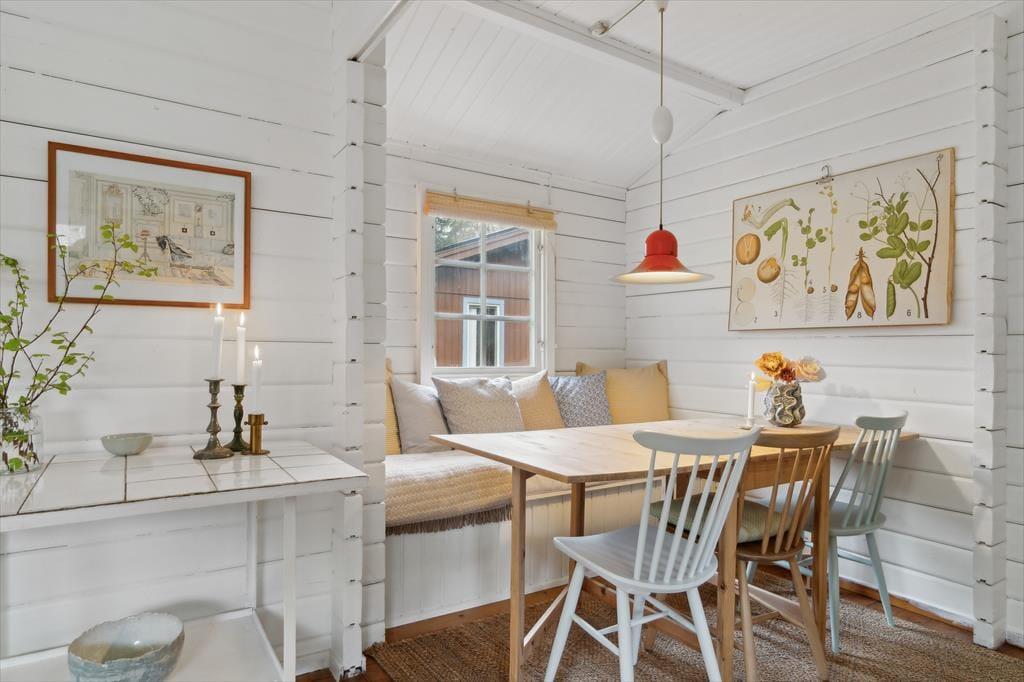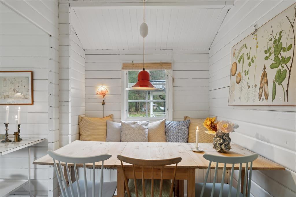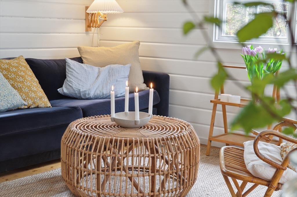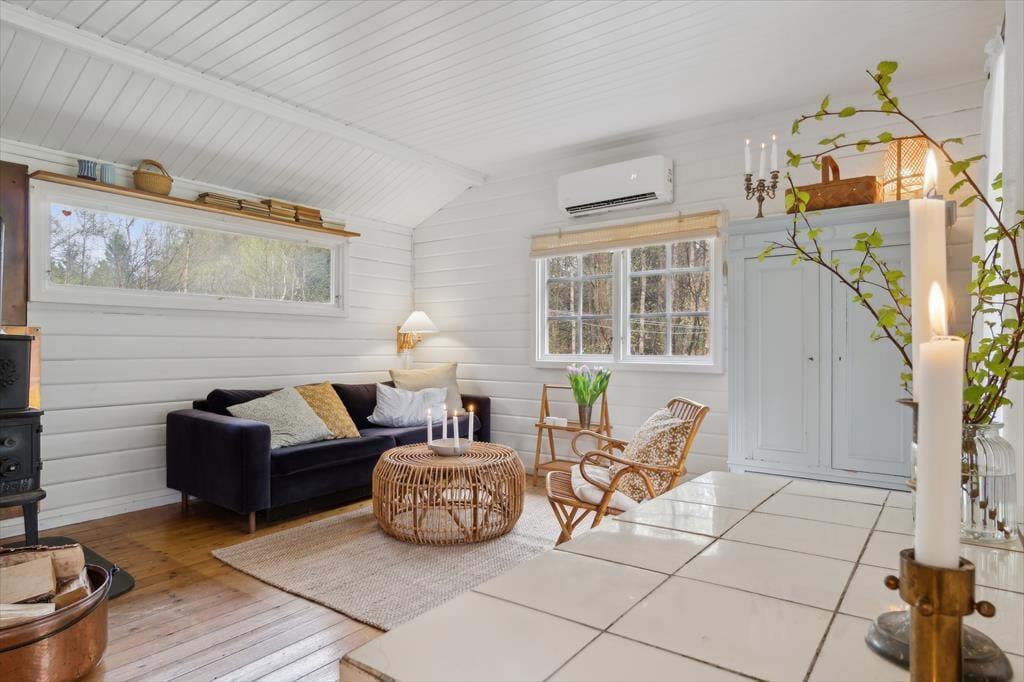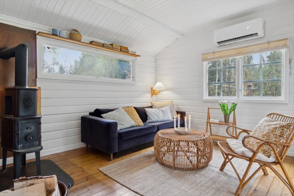 Indenfor mødes du af en stemningsfuld stue, hvor brændeovnen knitrer på kølige dage og skaber varme og ro. Indretningen er gennemtænkt med sans for detaljer – her er både funktionelt og hyggeligt, med bløde tekstiler, smukke træoverflader og hyggelige kroge, hvor man kan læne sig tilbage og nyde ferien. Det lille køkken overrasker med sin praktiske opbygning – alt er velplaceret og velfungerende, og det hele er pakket ind i en hyggelig og gennemført stil, der inviterer til nærvær omkring måltiderne. Huset har desuden hurtig fiberforbindelse, så I både kan streame, arbejde og holde kontakt med omverdenen – hvis I da ikke bare vælger at logge helt af.