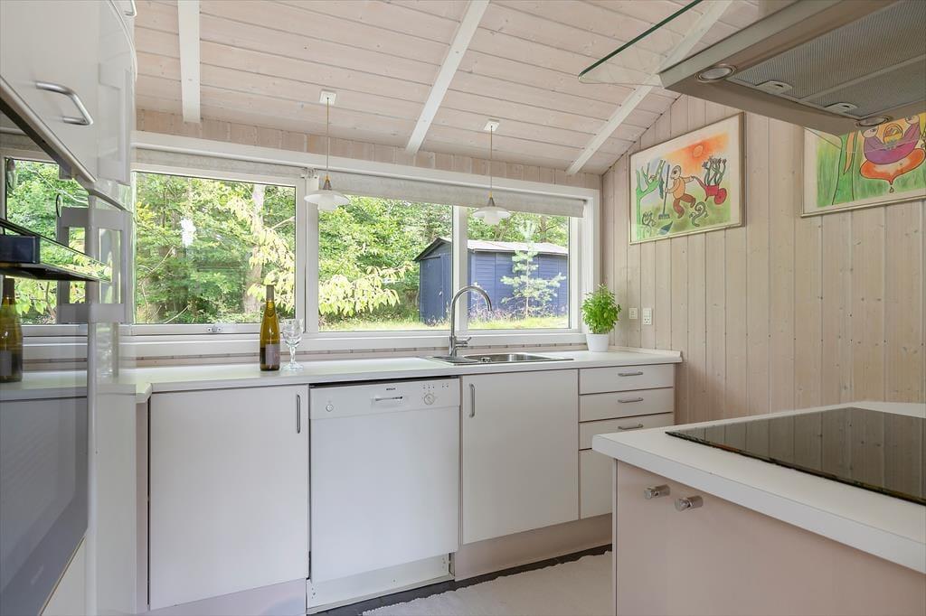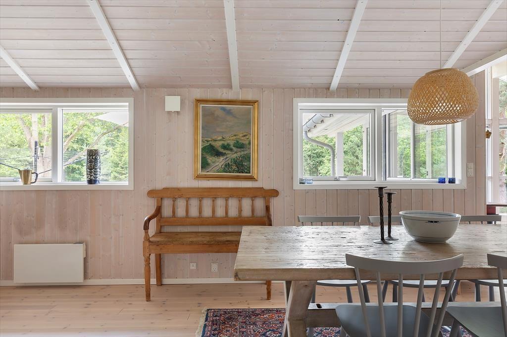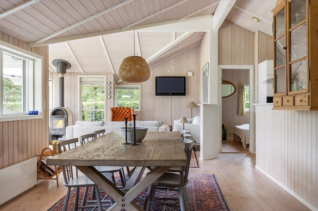 I dette lyse og moderne sommerhus på Fyrrevangen 17 får du de ideelle rammer for en afslappet ferie i fredelige omgivelser. Huset er enkelt og komfortabelt indrettet med god plads til op til fire personer. Den store stue samler ferieoplevelsen – her kan du dække op til fælles måltider i spiseafdelingen, slappe af i sofaen med en god bog eller nyde lange samtaler over et glas vin. Køkkenet er praktisk og funktionelt, så det er let at få hverdagens måltider til at glide – og samtidig kan man stadig være en del af fællesskabet i stuen.