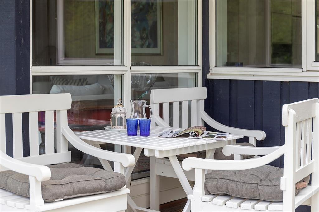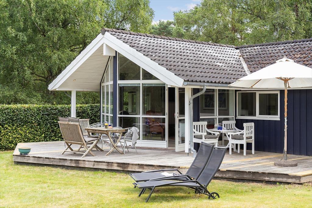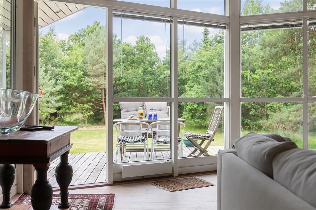 Grunden omkring huset er åben, men samtidig helt privat – her kan du slappe af i ro og fred uden at føle dig generet. Fra stuen er der direkte adgang til terrassen, hvor dagene let glider over i hinanden med morgenkaffe, afslapning i solen og hyggelige aftener omkring grillen. Den rummelige terrasse er oplagt til både små pauser og lange måltider under åben himmel.