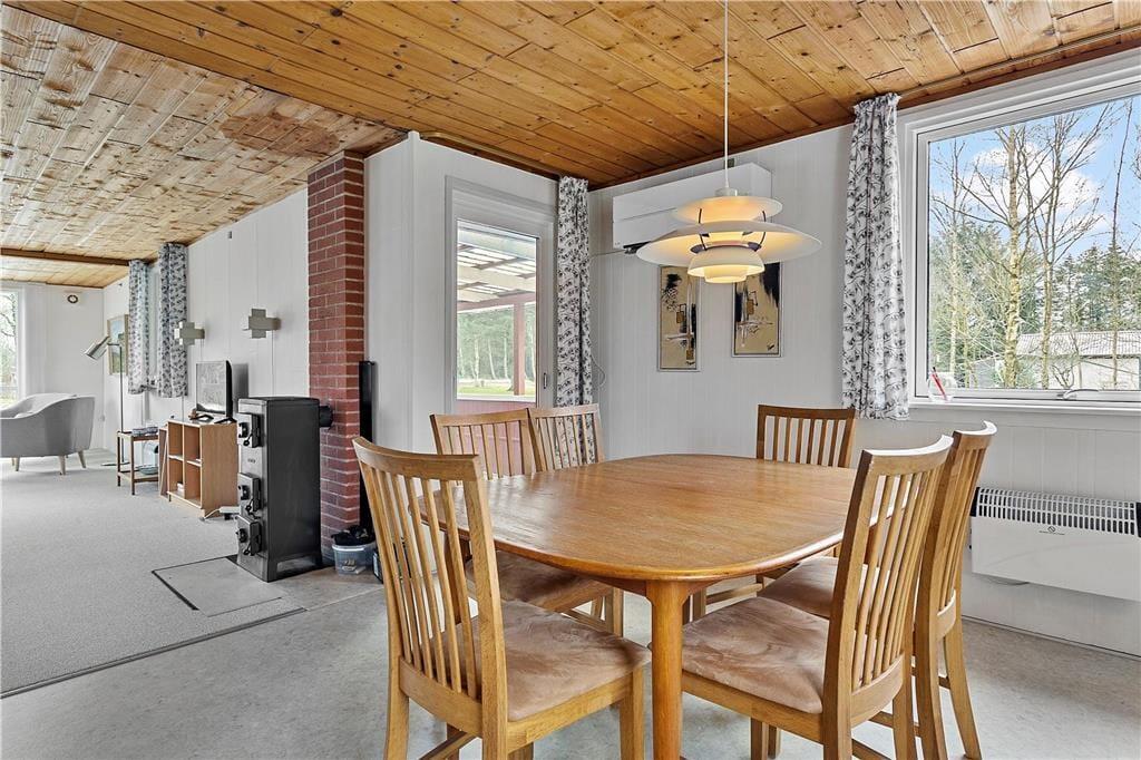 Ferieboligen ligger i et grønt og fredfyldt sommerhusområde med god afstand mellem husene. Der er bare 400 meter ned til stranden, så får I lyst til en badetur, tager det ganske få minutter, før I står i vandkanten. Her kan I suge de smukke naturomgivelser til jer, og hvis I vil strække benene, er der rig mulighed for at gå lange ture. Salling ligger centralt i Limfjorden, og med ferie adresse her får I et godt udgangspunkt for udflugter i området – vi kan eksempelvis anbefale Hjerl Hede og middelalderborgen Spøttrup Borg. I kan også tage turen til Mors via Sallingsundbroen for at besøge Jesperhus Blomsterpark. Der er heller ikke langt til Skive, som har et stemningsfuldt byliv med hyggelige spisesteder, kulturtilbud, badeland og en charmerende lystbådehavn.
