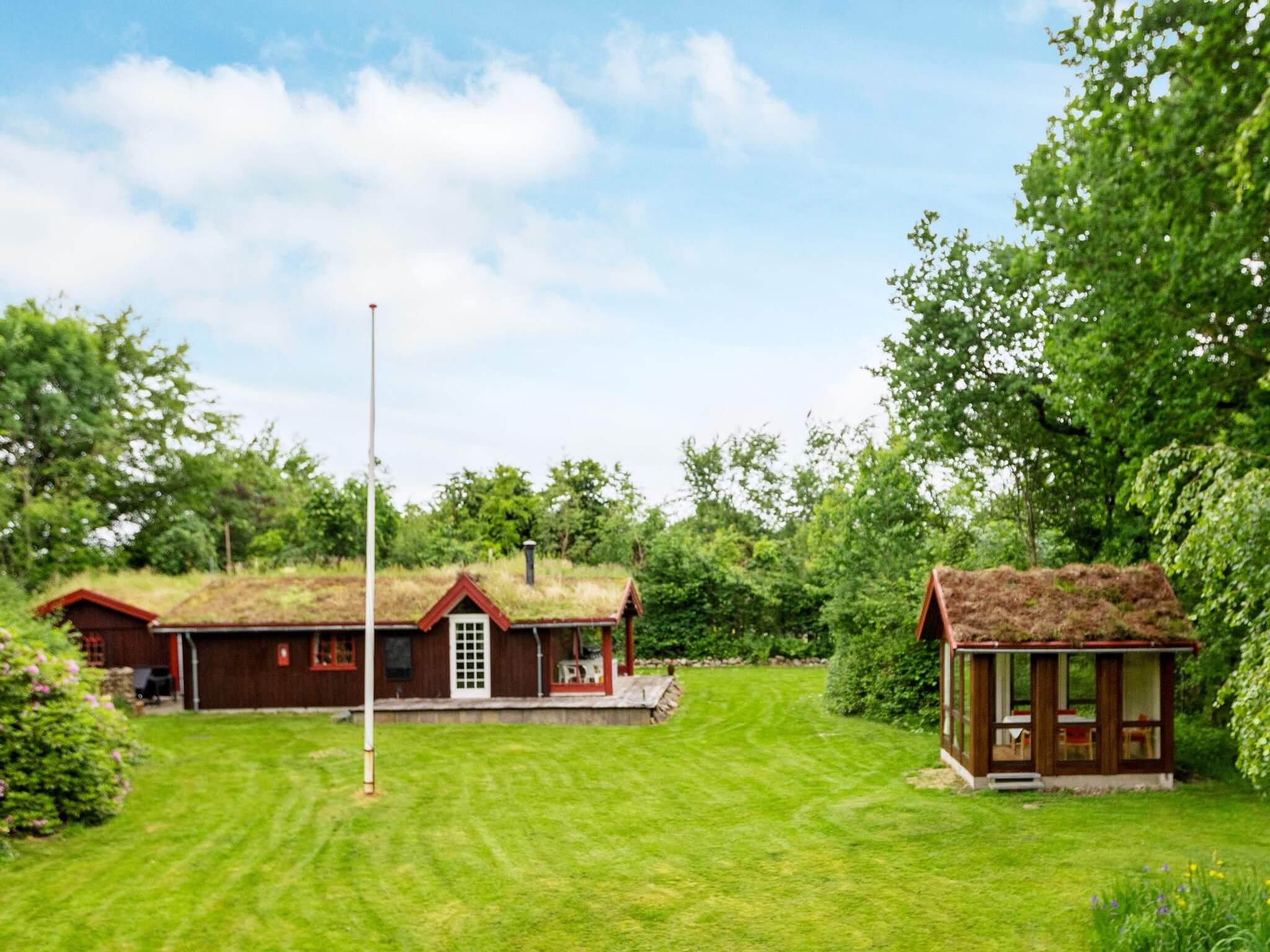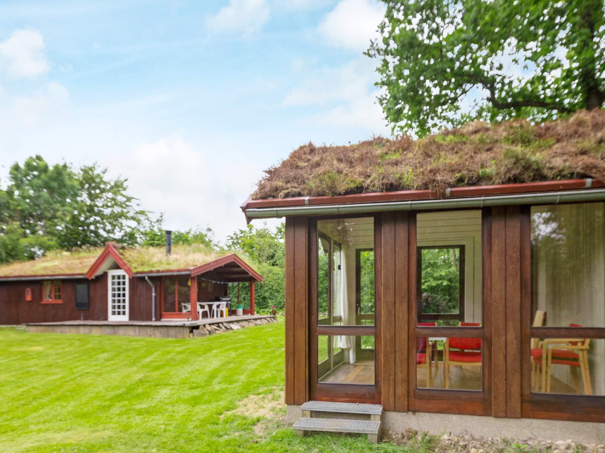 Hyggeligt og stemningsfyldt bjælkehus, med beplantning på taget, beliggende, på dejlig stor grund ved Astrup Vig, kun ca. 400 meter fra Fjorden.