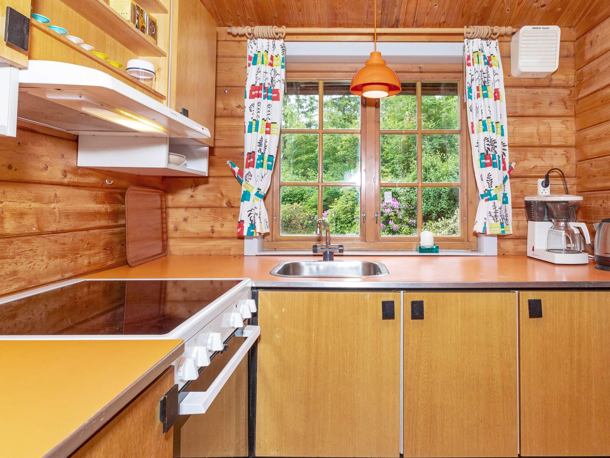 Åben køkken/stue med brændeovn, spisehjørne med bænk og hyggelig sofagruppe. Stuens TV har både tyske og danske kanaler.