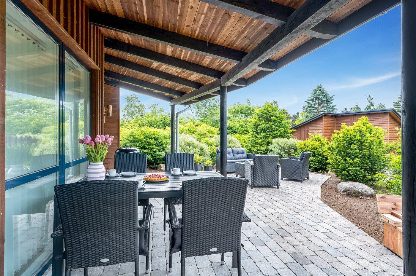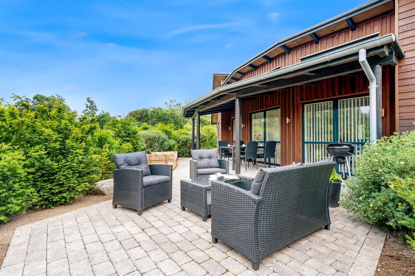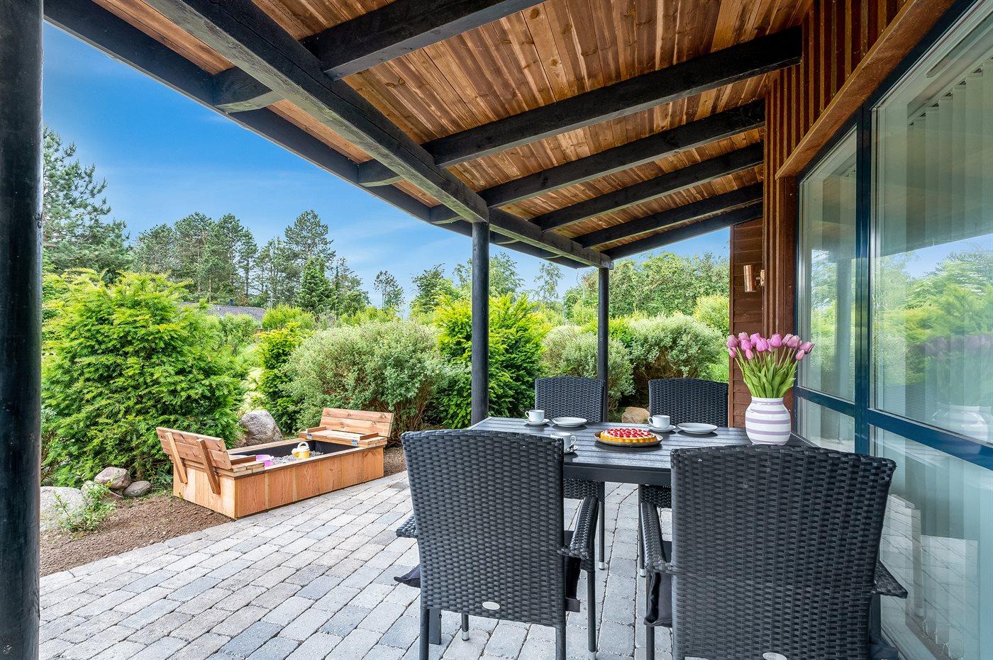 Ved huset er der en skøn have med overdækket terrasse og et åbent område, hvor der er en hyggelig morgenterrasse samt en stor terrasse med udsigt til haven. Her er grill til rådighed.