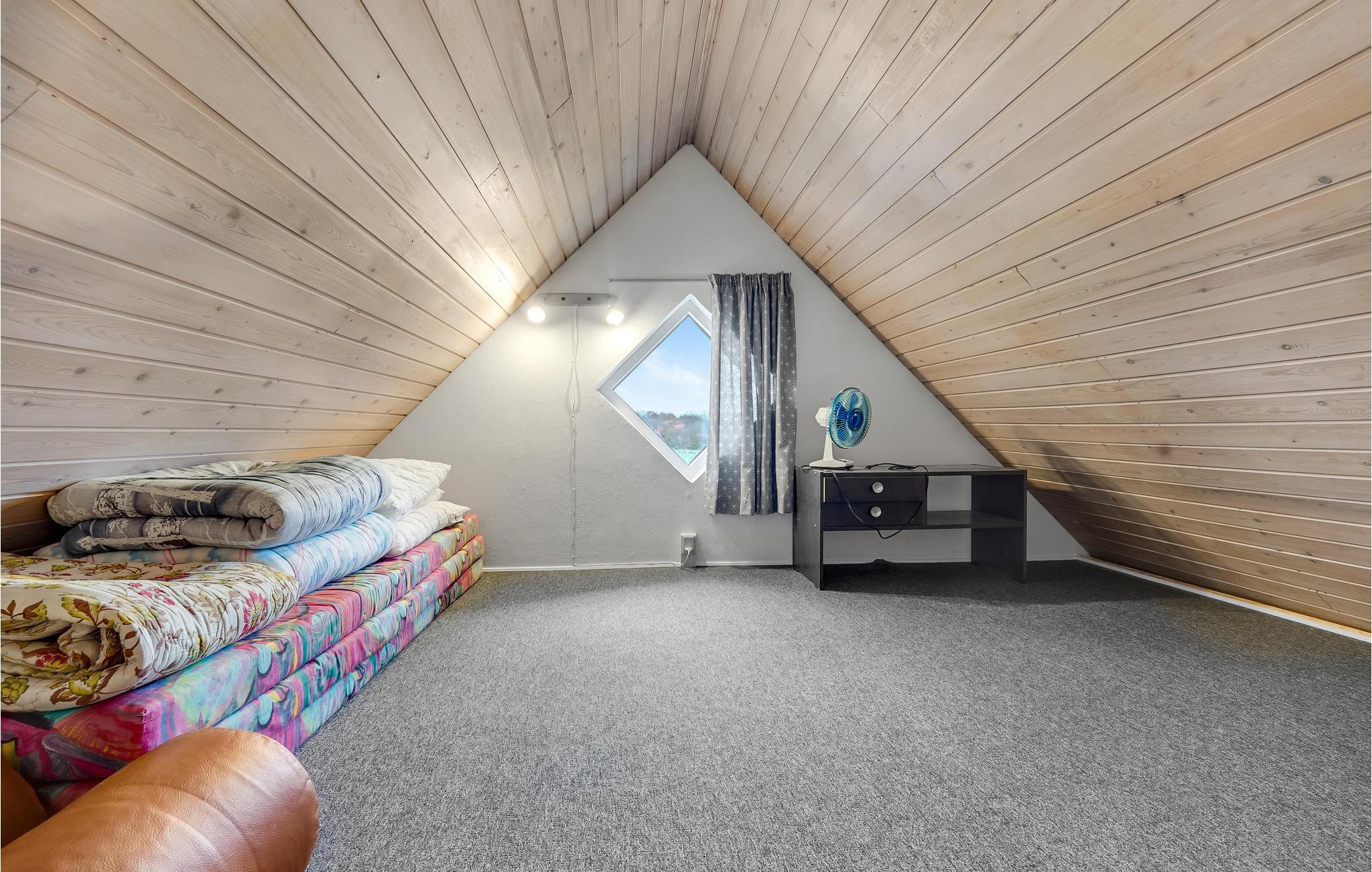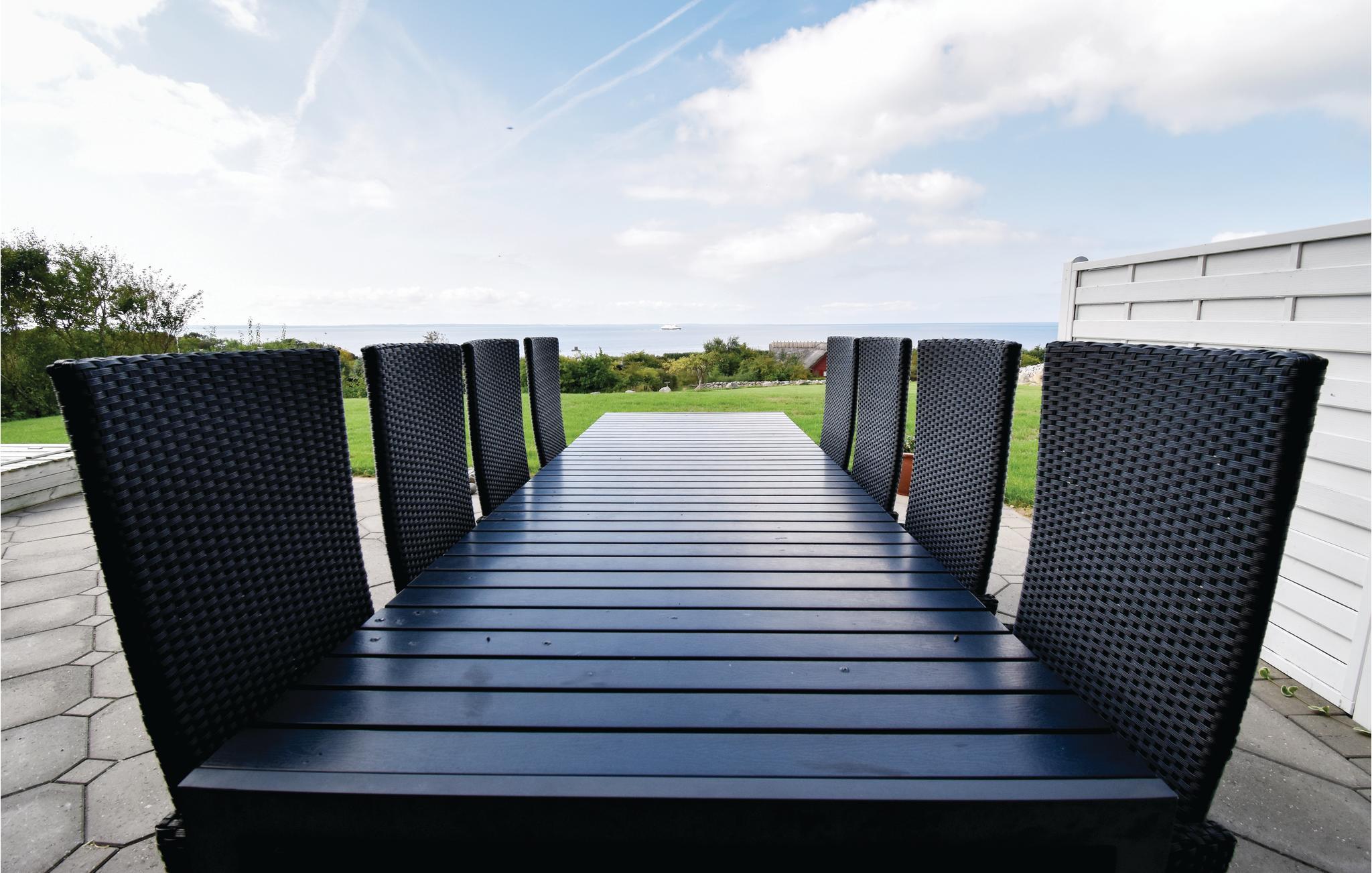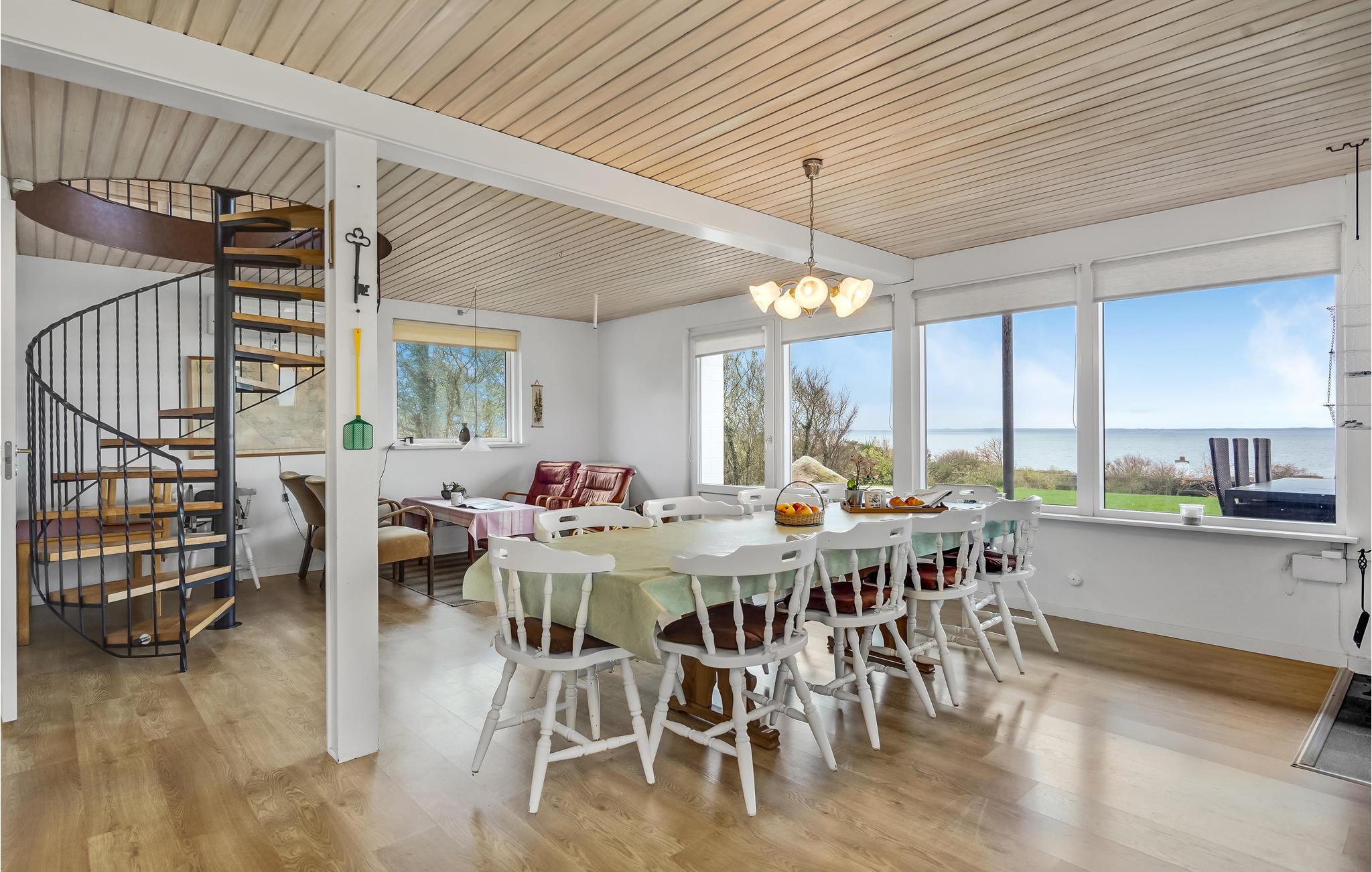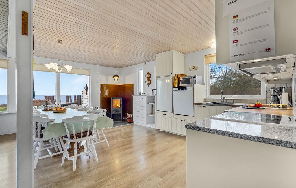 Et ældre men hyggeligt feriehus med en skøn udsigt over vandet. Det er højtbeliggende på en stor grund med marker lige i baghaven. Huset er personligt indrettet med en god blanding af ældre og nyere møbler. Fra køkken/alrummet med brændeovn går en vindeltrappe op til førstesalen. Soveværelserne er fordelt med et i stueplan, et på første sal, hvor alkoven med forhæng ligeledes befinder sig og fra udsigtsstuen, også på første sal, går en stige op til hemsen. Rundt om huset er der anlagt flere gode terrasser samt et stålbord med håndvask og vandforsyning. Sid på terrassen foran huset og nyd en lækker frokost, mens I skuer ud over vandet.