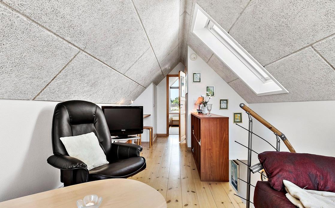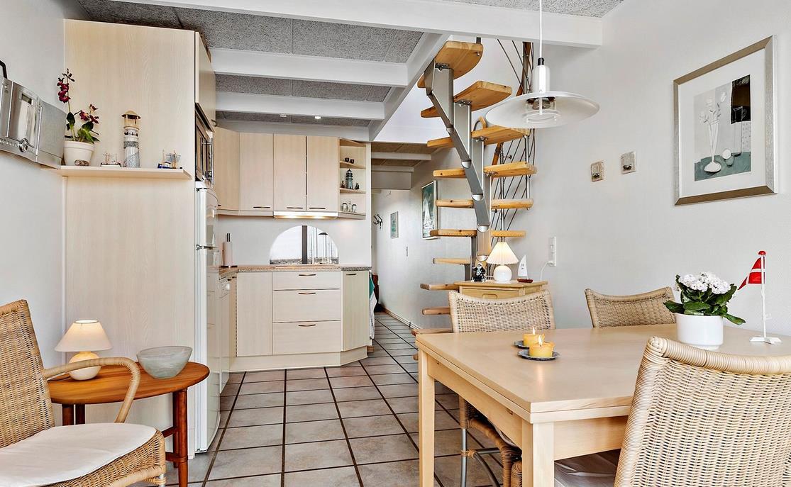 Fra forgangen kommer man ind i det lyse alrum med stue og køkken i åben forbindelse og udgang til terrasse med udsigt over lystbådehavnen. Her er spiseplads til 4 personer, TV med danske (inkl. TV2) og tyske kanaler og radio. Køkkenet er velindrettet med keramiske kogeplader, mikrobølgeovn og køle-/fryseskab. Herfra fører trappe til hems, som er indrettet med opholds-/udsigtsstue, soveværelse med 2 enkeltsenge samt toilet. I den rummelige forgang er der en "skjult/væghængt" dobbeltseng, der nemt slås ud, så forgangen fungerer som soveværelse for 2 personer. Desuden er her indgang til fint flisebadeværelse med bruseniche. Hele huset har gulvvarme og er velisoleret, så det kan bebos hele året. Der er internetadgang.
