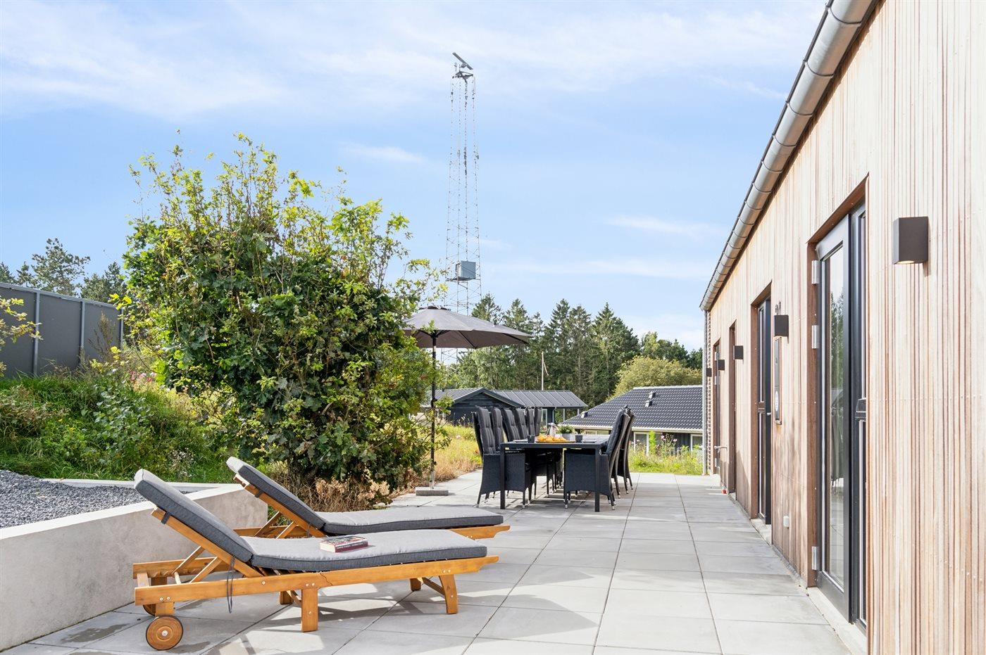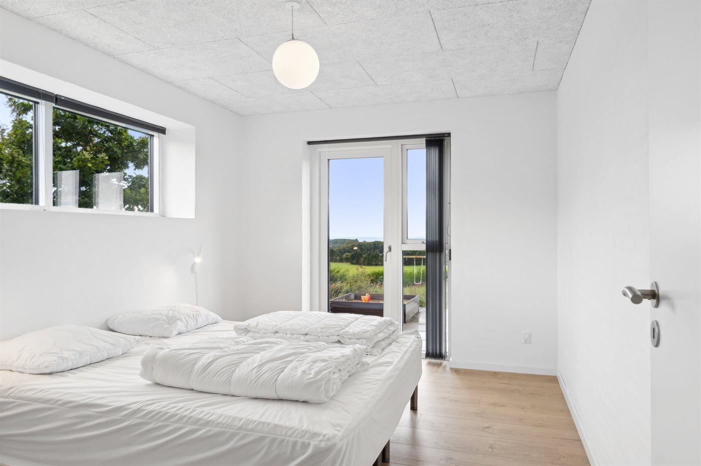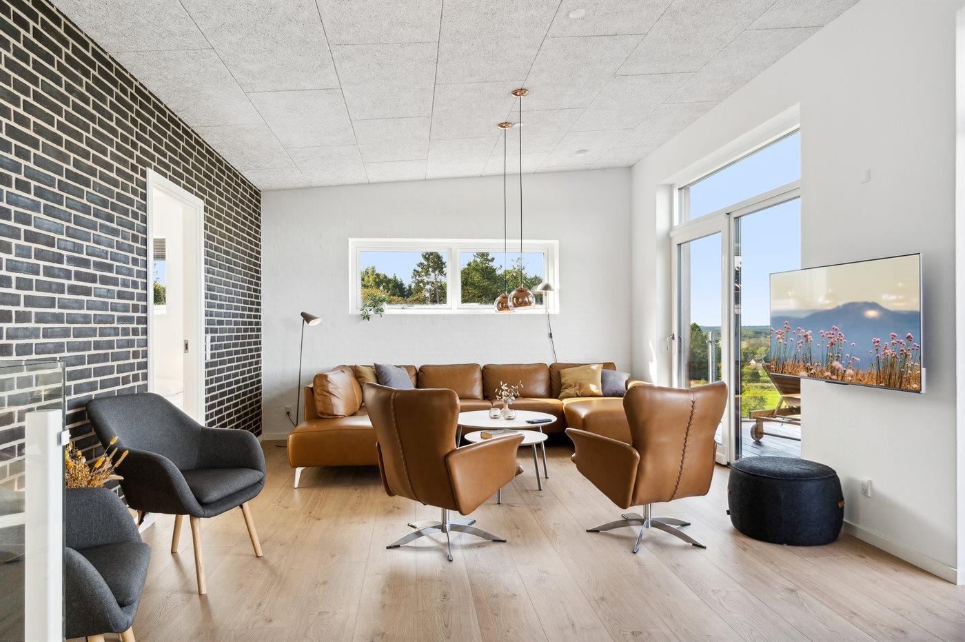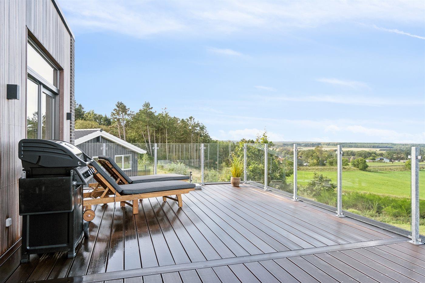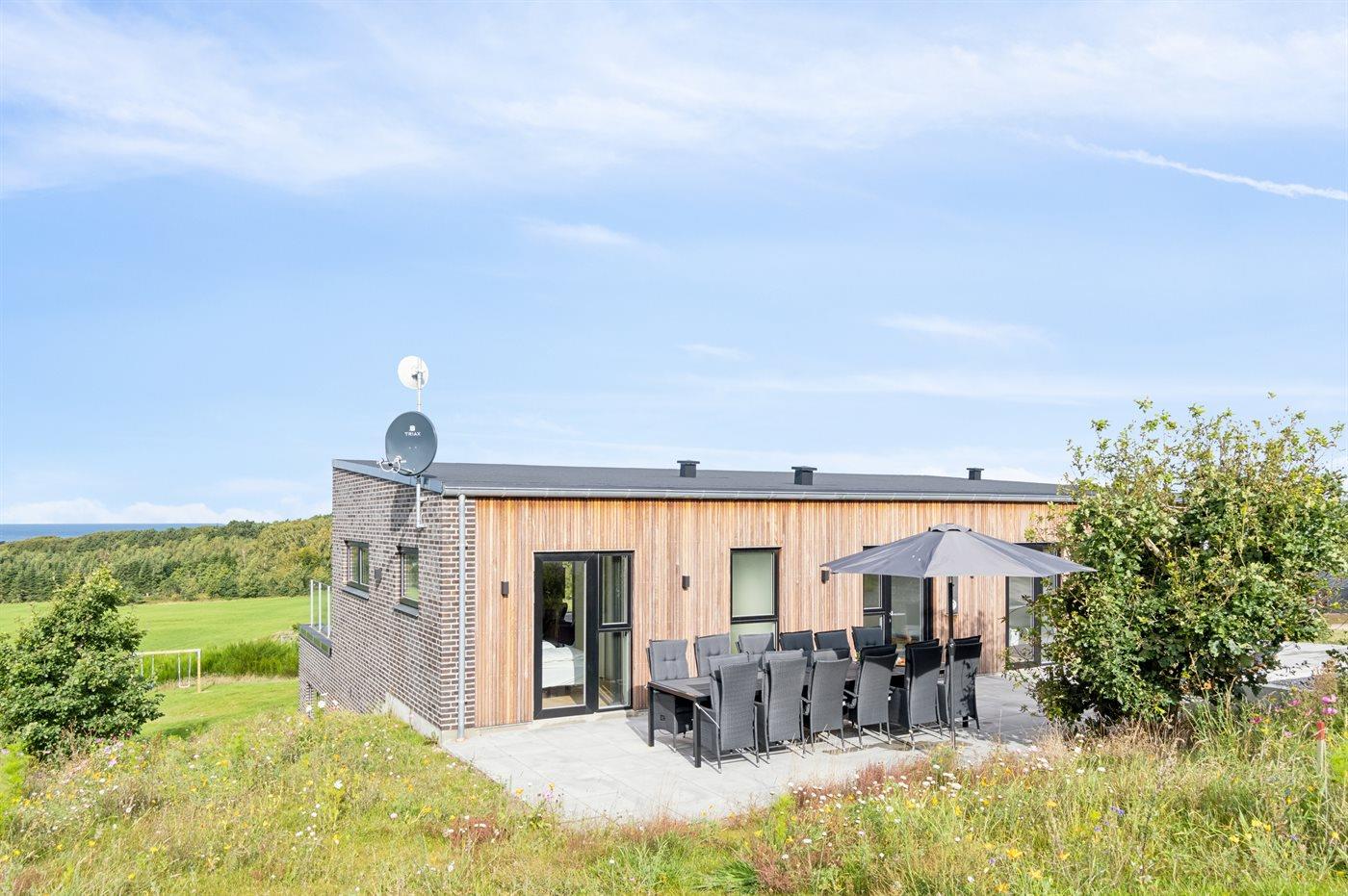På toppen af en smuk bakke i Bønnerup ligger dette eksklusive sommerhus fra 2024, med plads til 12 gæster og en fantastisk panoramaudsigt over skoven og havet.