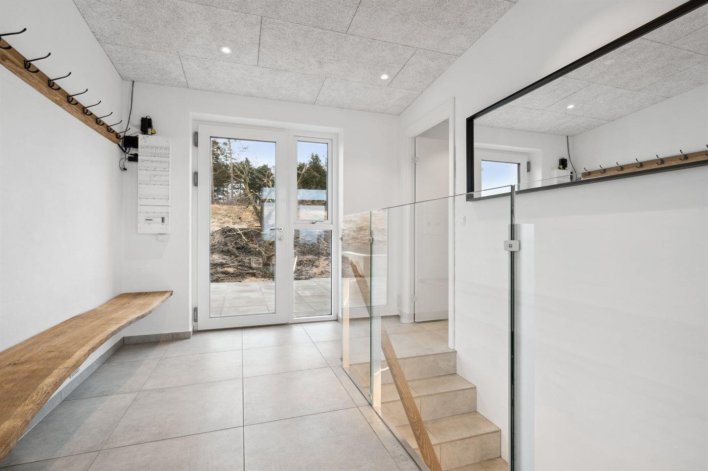 Huset er i to plan og skabt til både afslapning og samvær. På stueplan træder du ind i et rummeligt opholdsrum, hvor store vinduer trækker naturen helt tæt på, og fra rummet er der direkte adgang til en skøn træterrasse, perfekt til at nyde gode måltider eller solnedgangen. Etagen rummer også tre velindrettede soveværelser samt et moderne badeværelse, alle i høj kvalitet og med sans for detaljen.