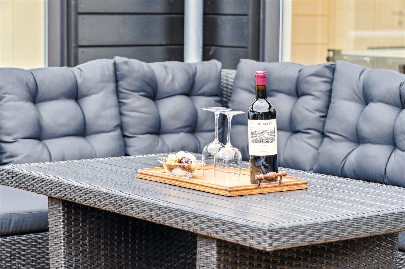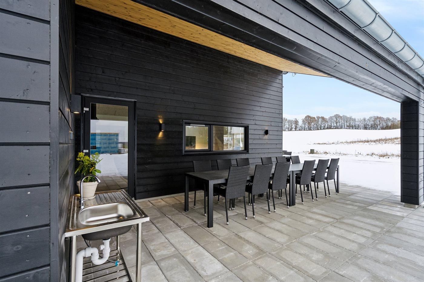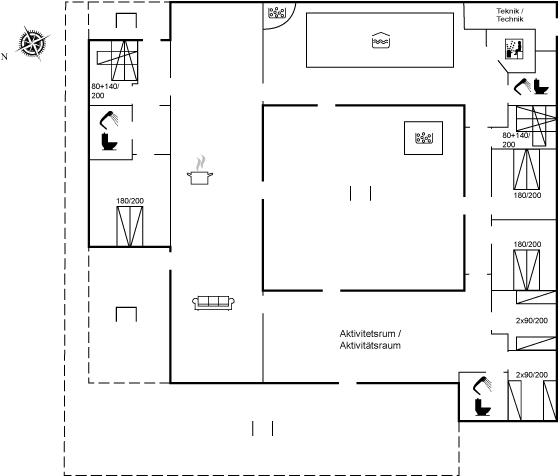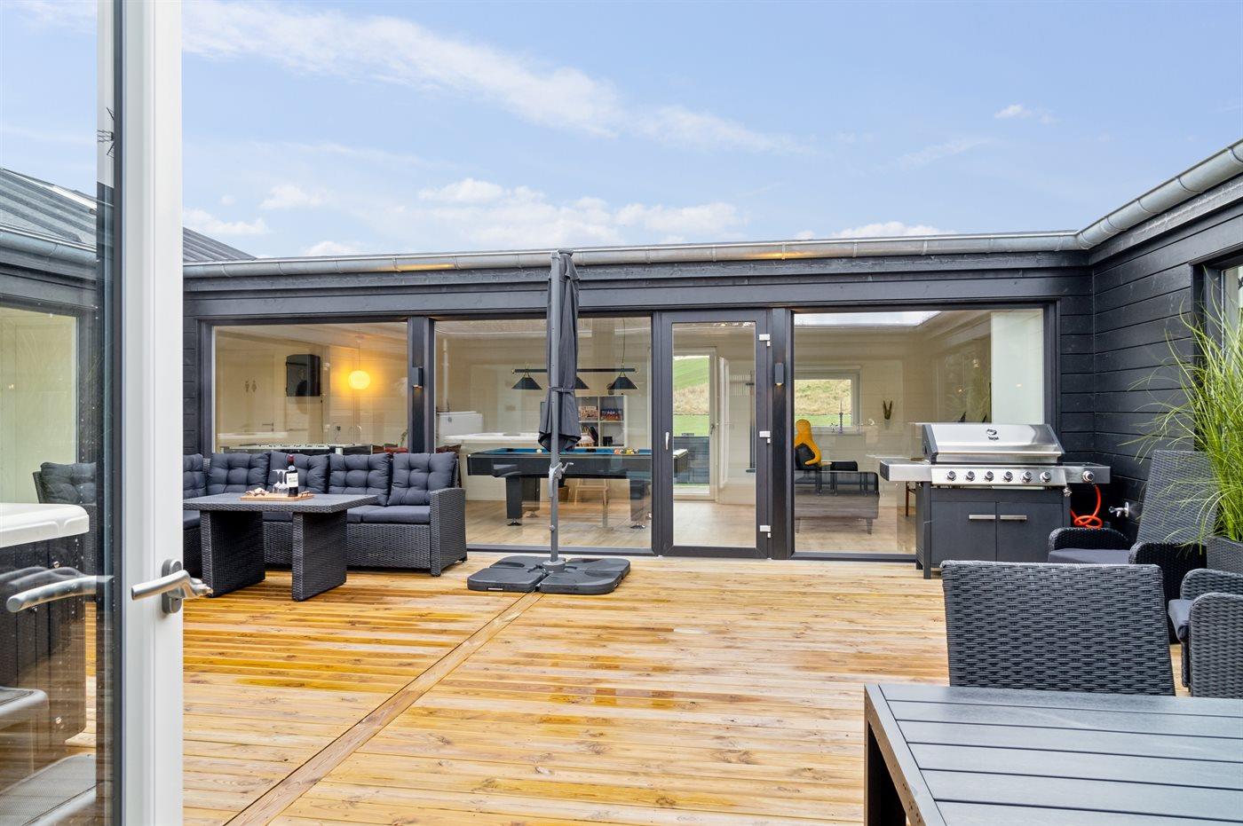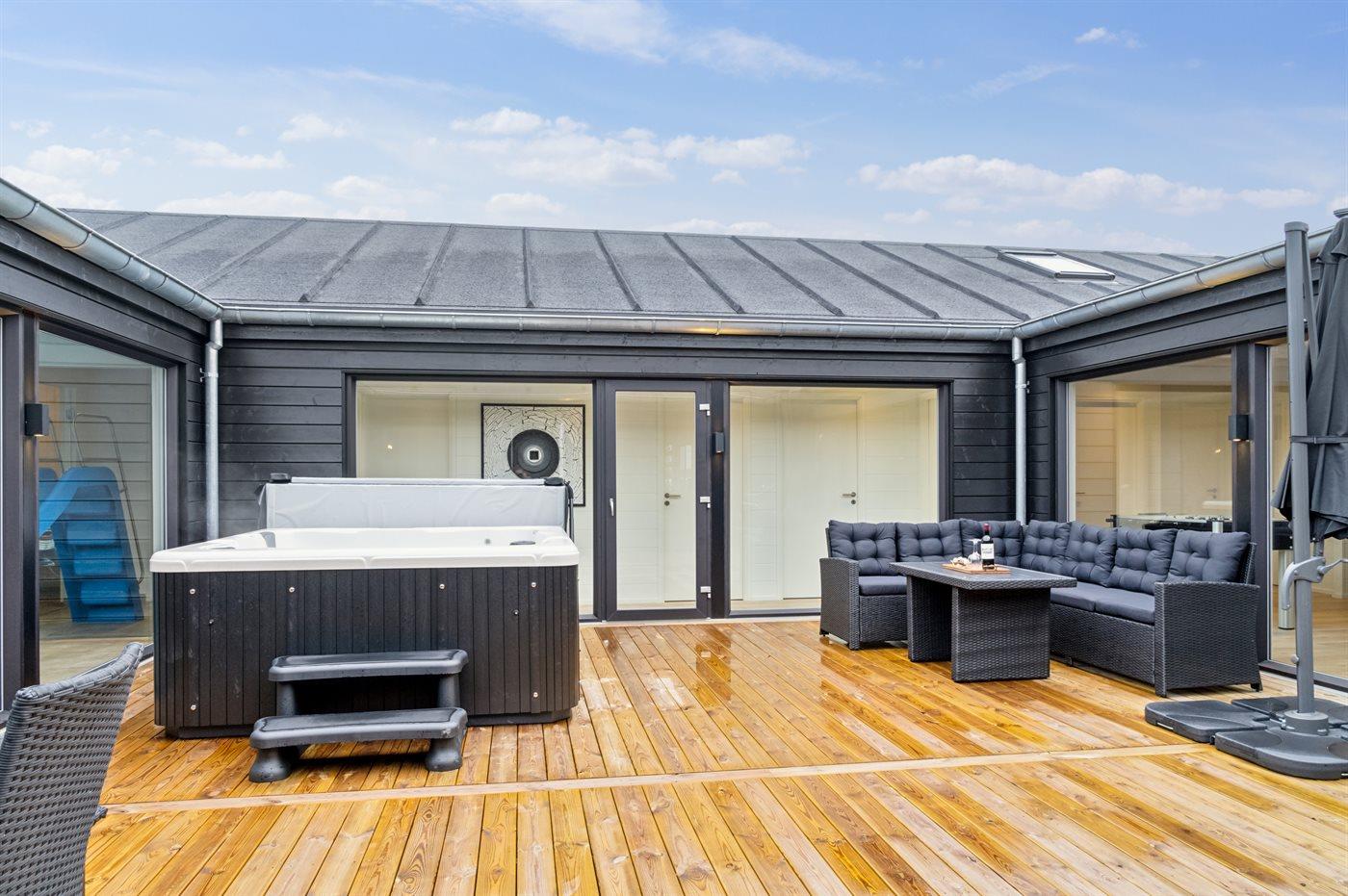 Grundplanen består af 4 længer, hvor der i midten findes en gård med et udendørs spabad. Her kan man nyde solen på terrassen eller i det varme vand, uden at blive forstyrret af naboer eller forbipasserende.