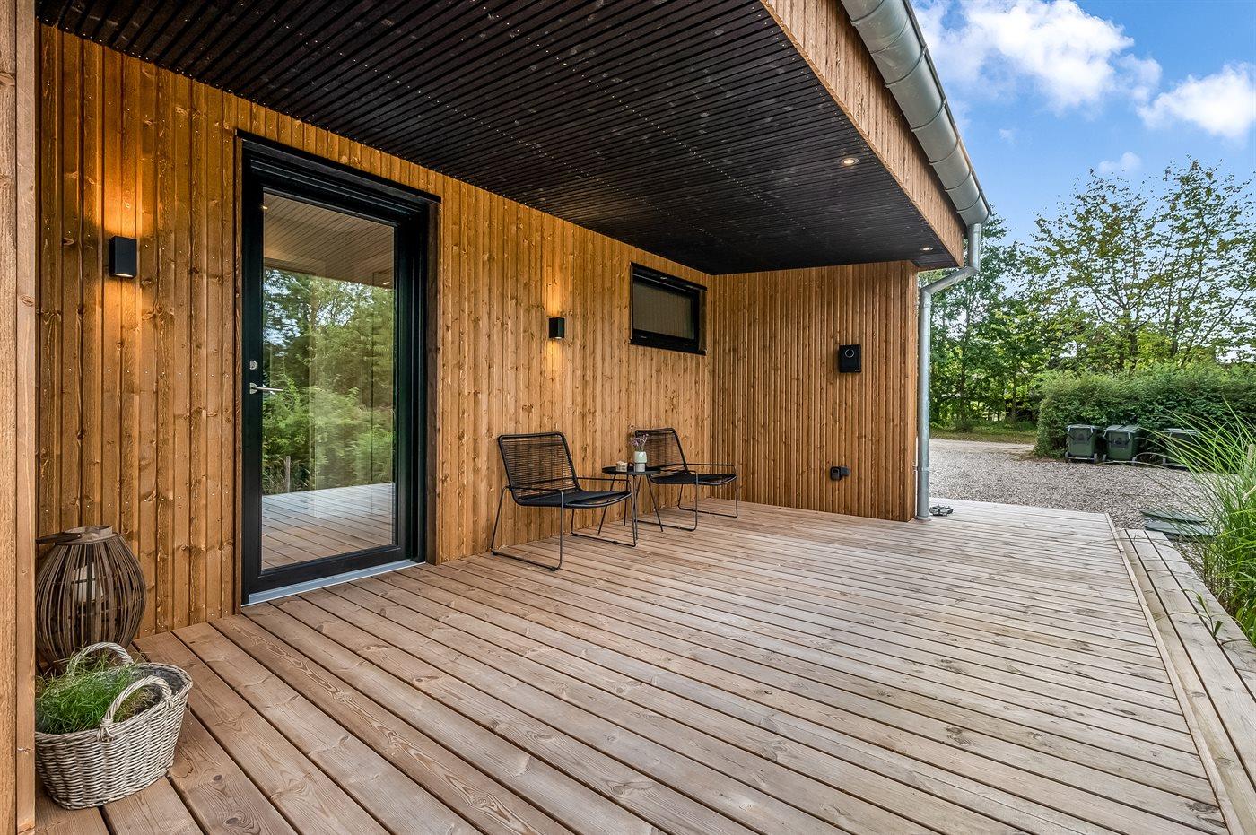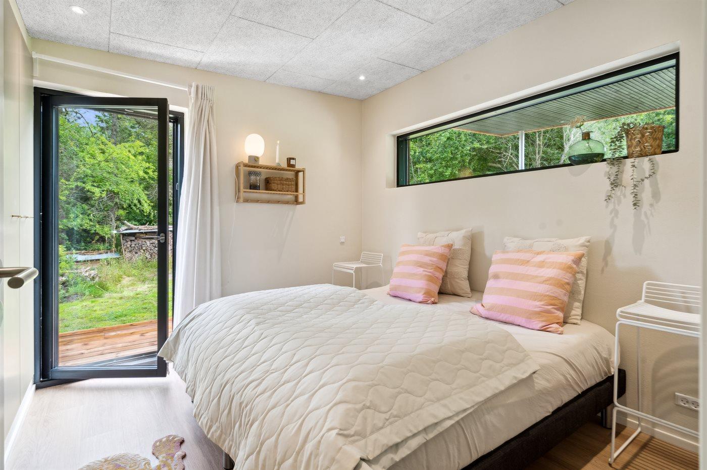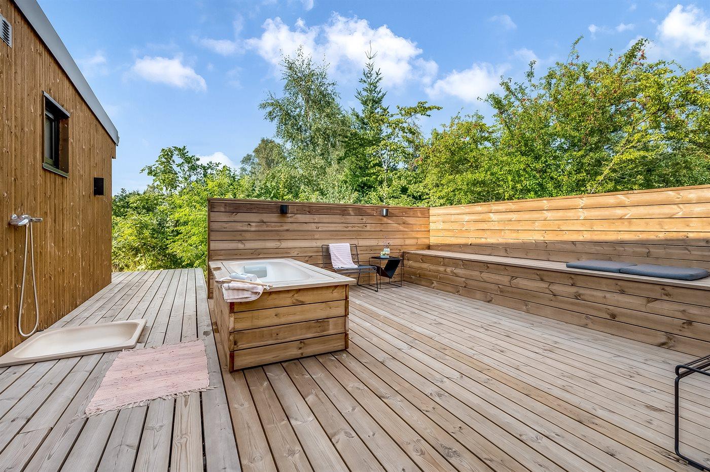 I stuen er der også mulighed for at tage et hvil i alkoven eller har du lyst til at læse en bog med udkig til den grønne naturgrund fra husets sidevindue i stuen. Udenfor har du mulighed for at benytte den store træterrasse, hvor du både nyde din morgenkaffe og din aftensmad i sol, da der er terrasse hele vejen rundt om huset. Fra soveværelset er der udgang til ude bruseren.