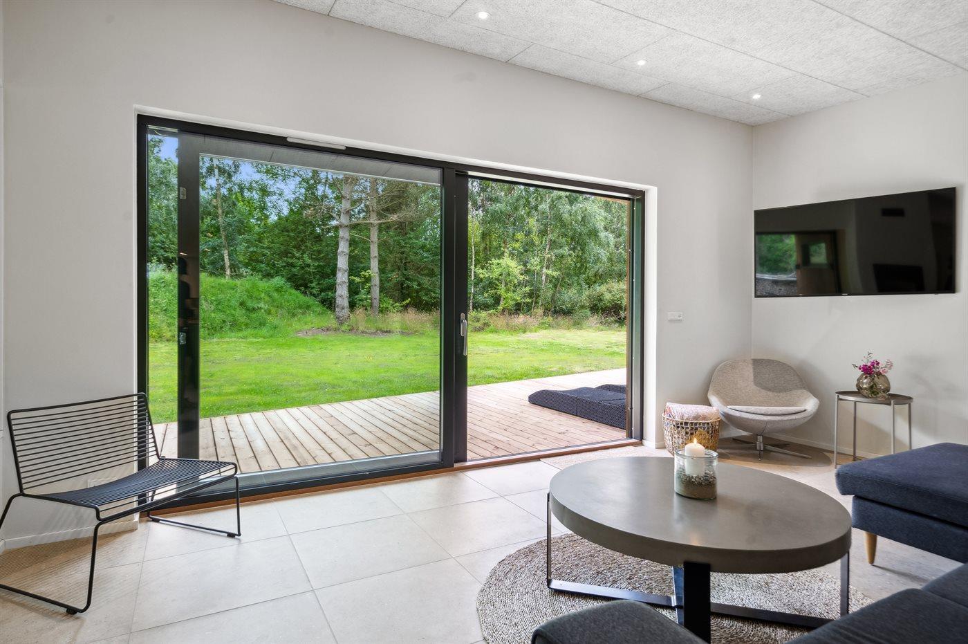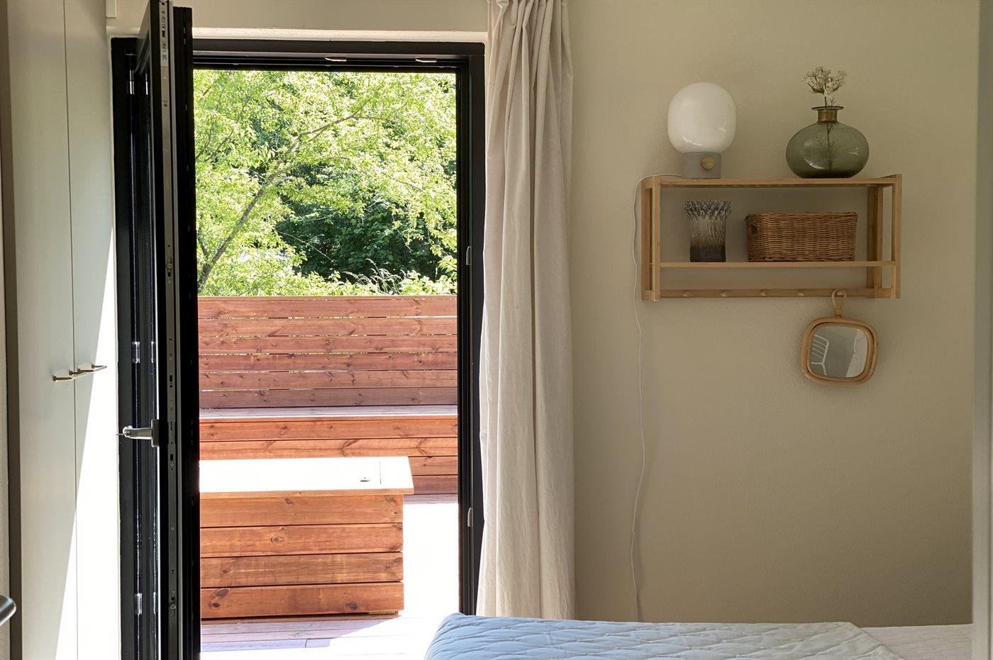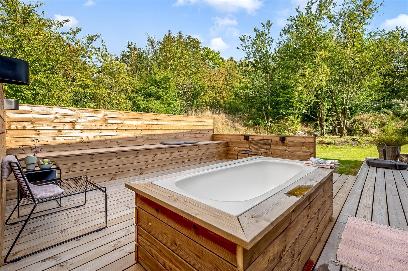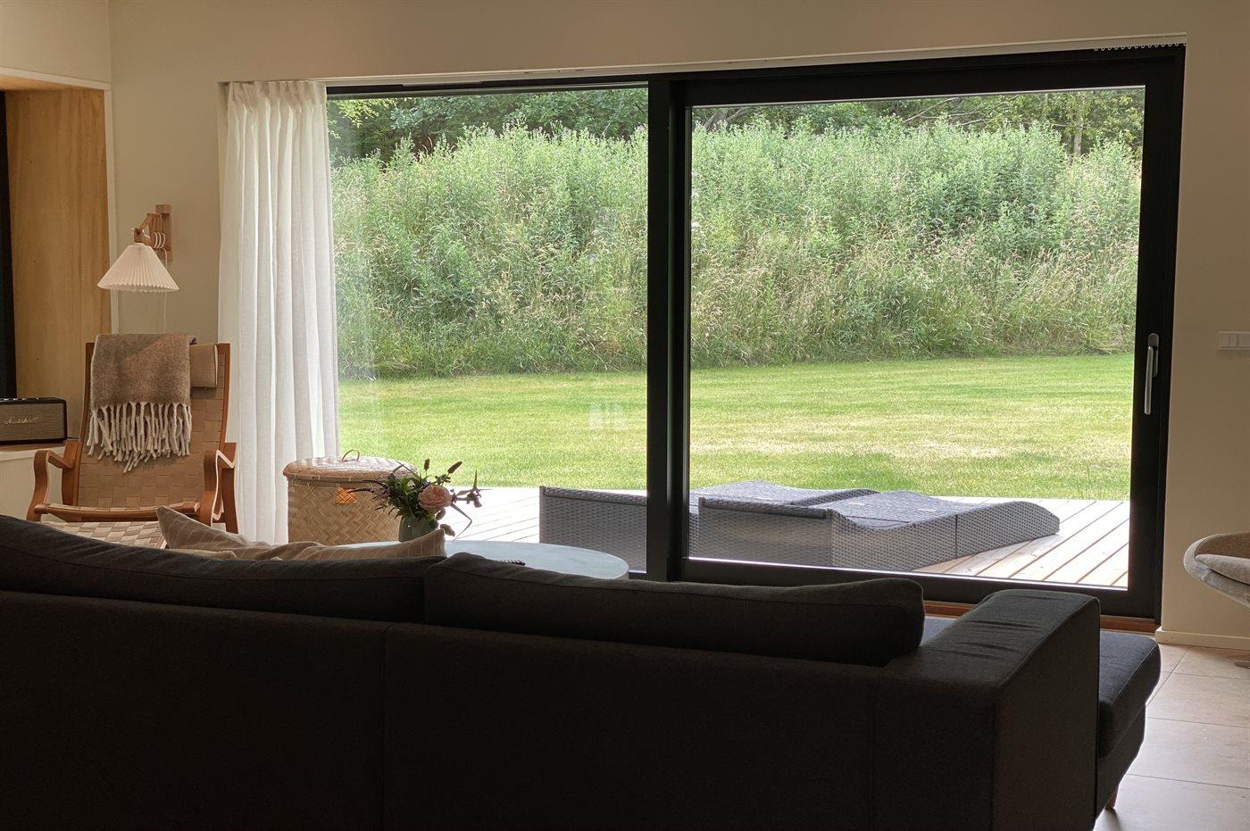 I stuen er der også mulighed for at tage et hvil i alkoven eller har du lyst til at læse en bog med udkig til den grønne naturgrund fra husets sidevindue i stuen. Udenfor har du mulighed for at benytte den store træterrasse, hvor du både nyde din morgenkaffe og din aftensmad i sol, da der er terrasse hele vejen rundt om huset. Fra soveværelset er der udgang til ude bruseren.