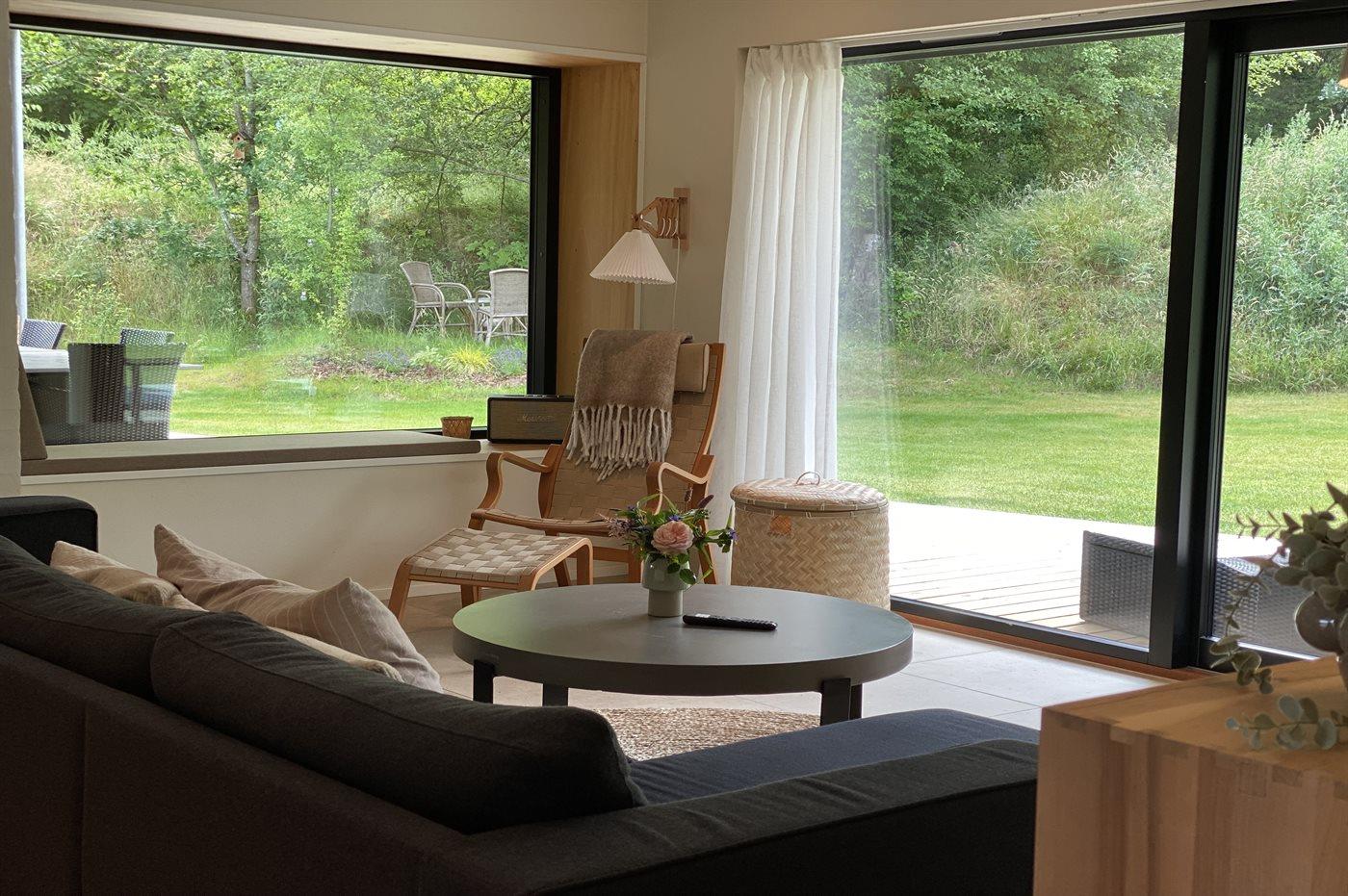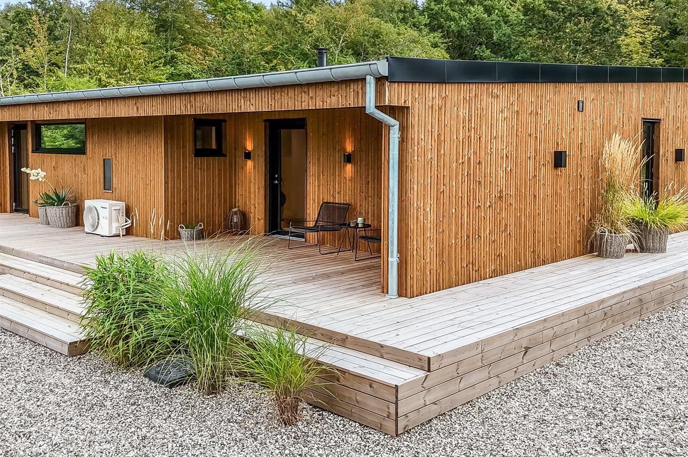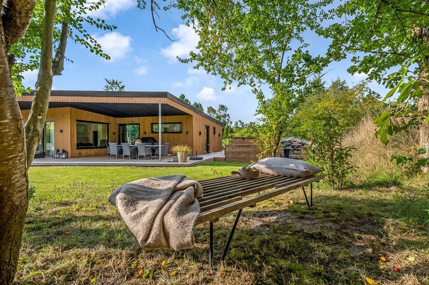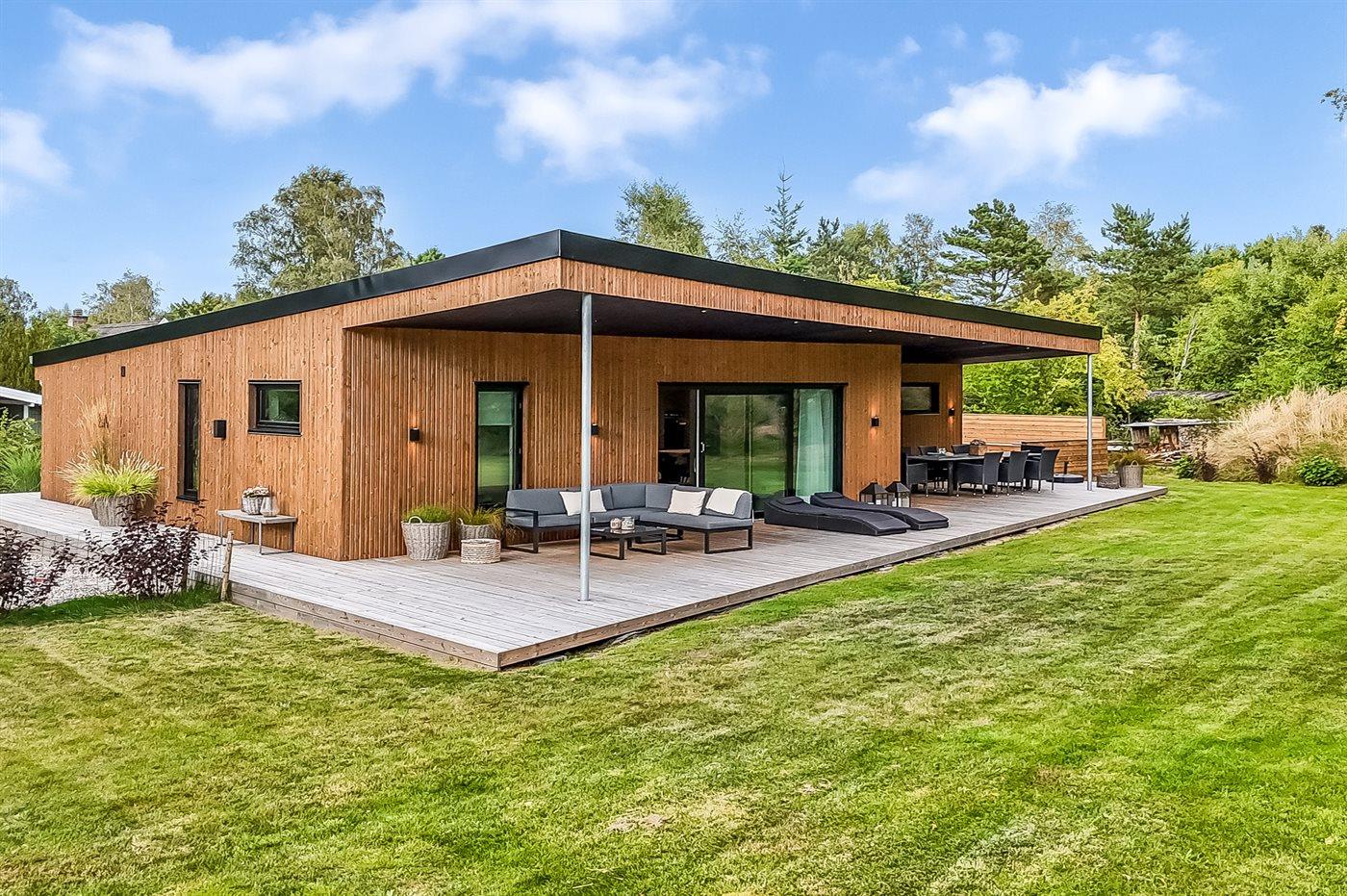 Her finder du dette nybygget sommerhus med plads til syv personer – Opført i 23/24 på en stor og lukket grund.