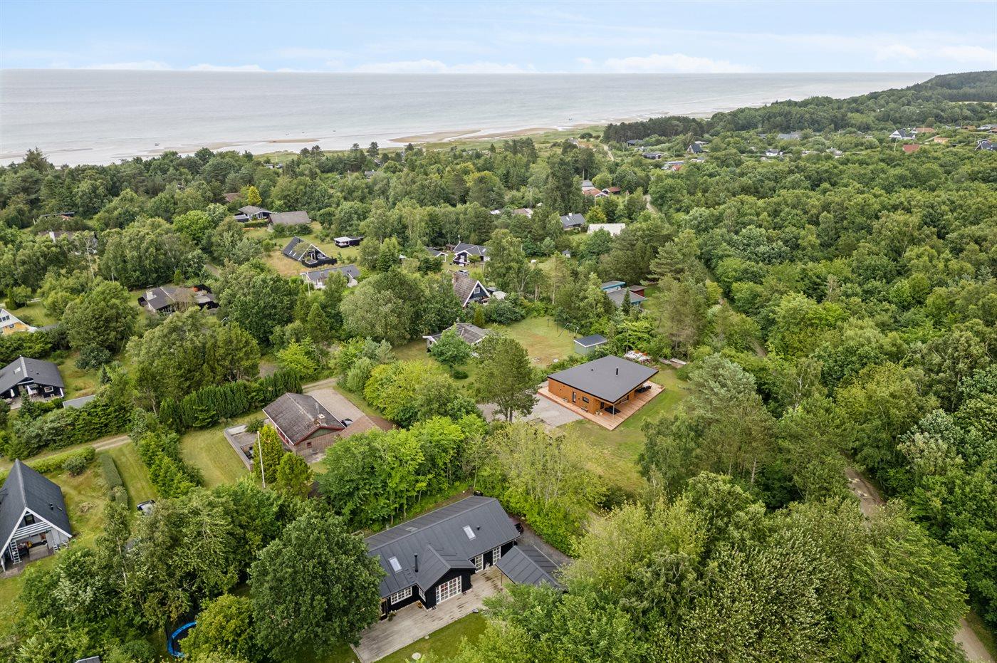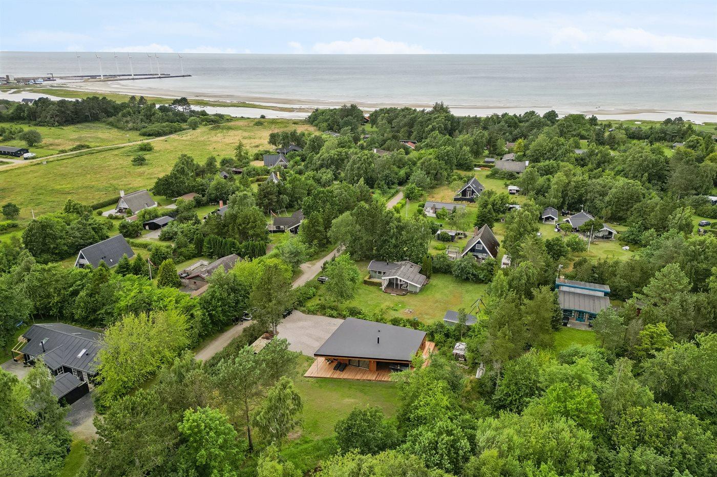 Ferieboligen er beliggende på en 1800 m² stor naturgrund. Der er 300 m til havet. Nærmeste forretning er beliggende i en afstand af 1000 m. Til ferieboligen hører åbent terrasseareal. Desuden er der overdækket terrasse. Udendørs bruser. Grill til rådighed. Der er installeret stik til opladning af elbil. Type 2 stik. Med 11 kW ladeeffekt. Parkering ved ferieboligen.