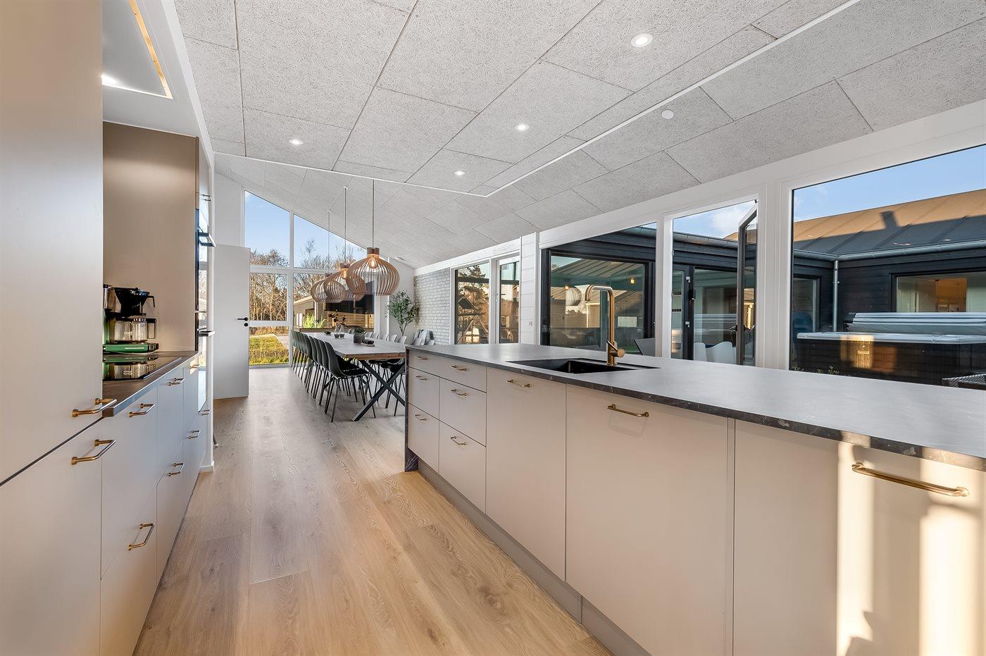 Køkkenet er udstyret med 3 køleskabe. Der er 4 induktionskogeplader, 2 varmluftovne, mikrobølgeovn samt 2 opvaskemaskiner.