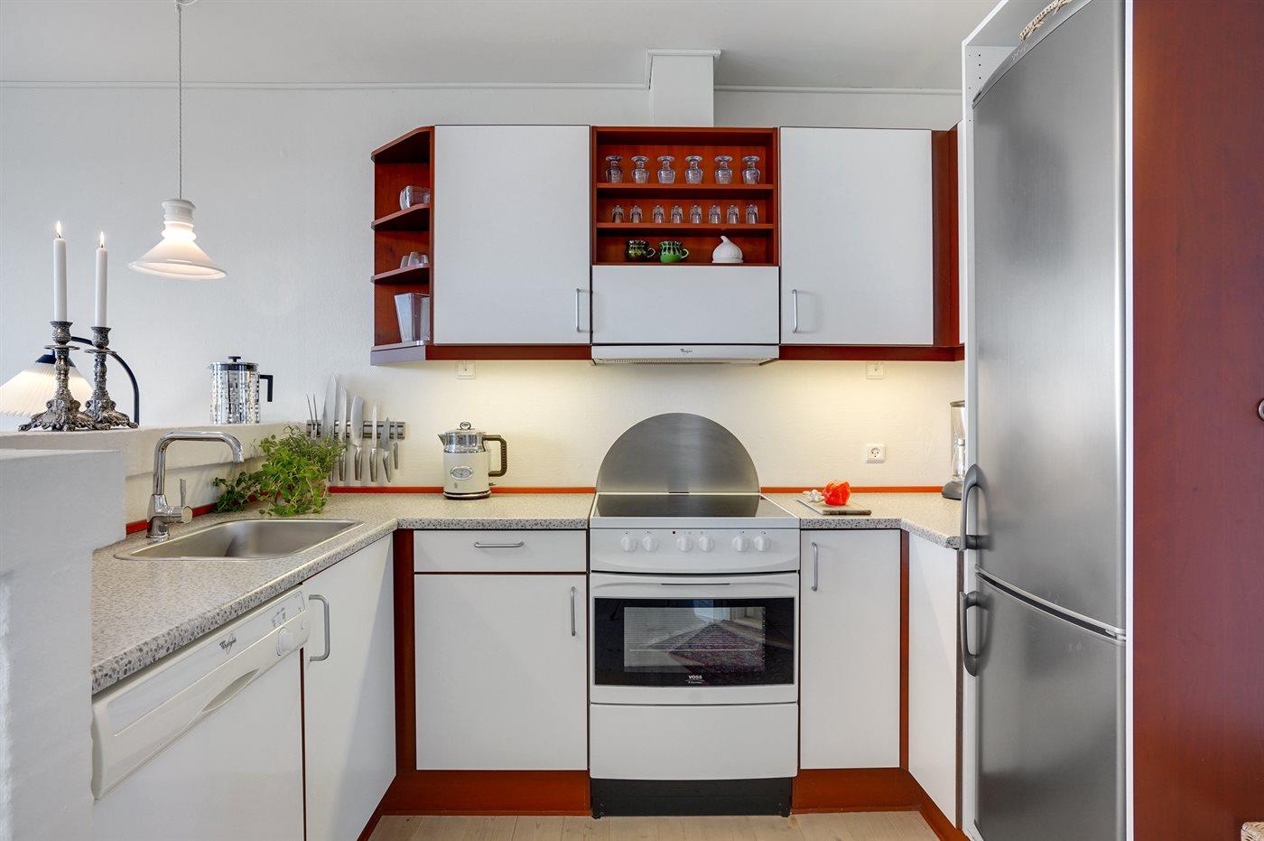 Køkkenet er udstyret med 1 køleskab. Der er 4 keramiske kogeplader, varmluftovn, mikrobølgeovn samt opvaskemaskine.