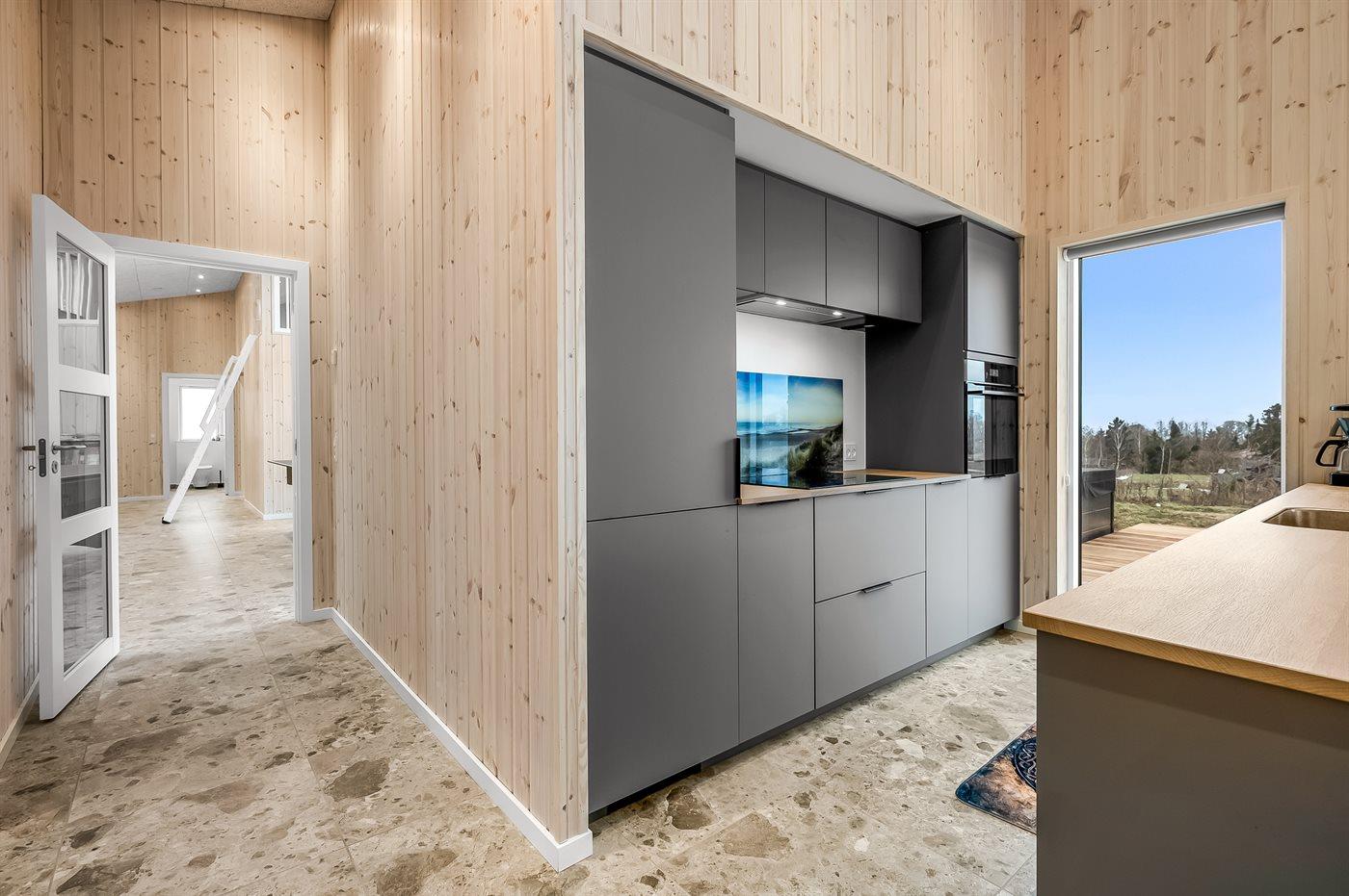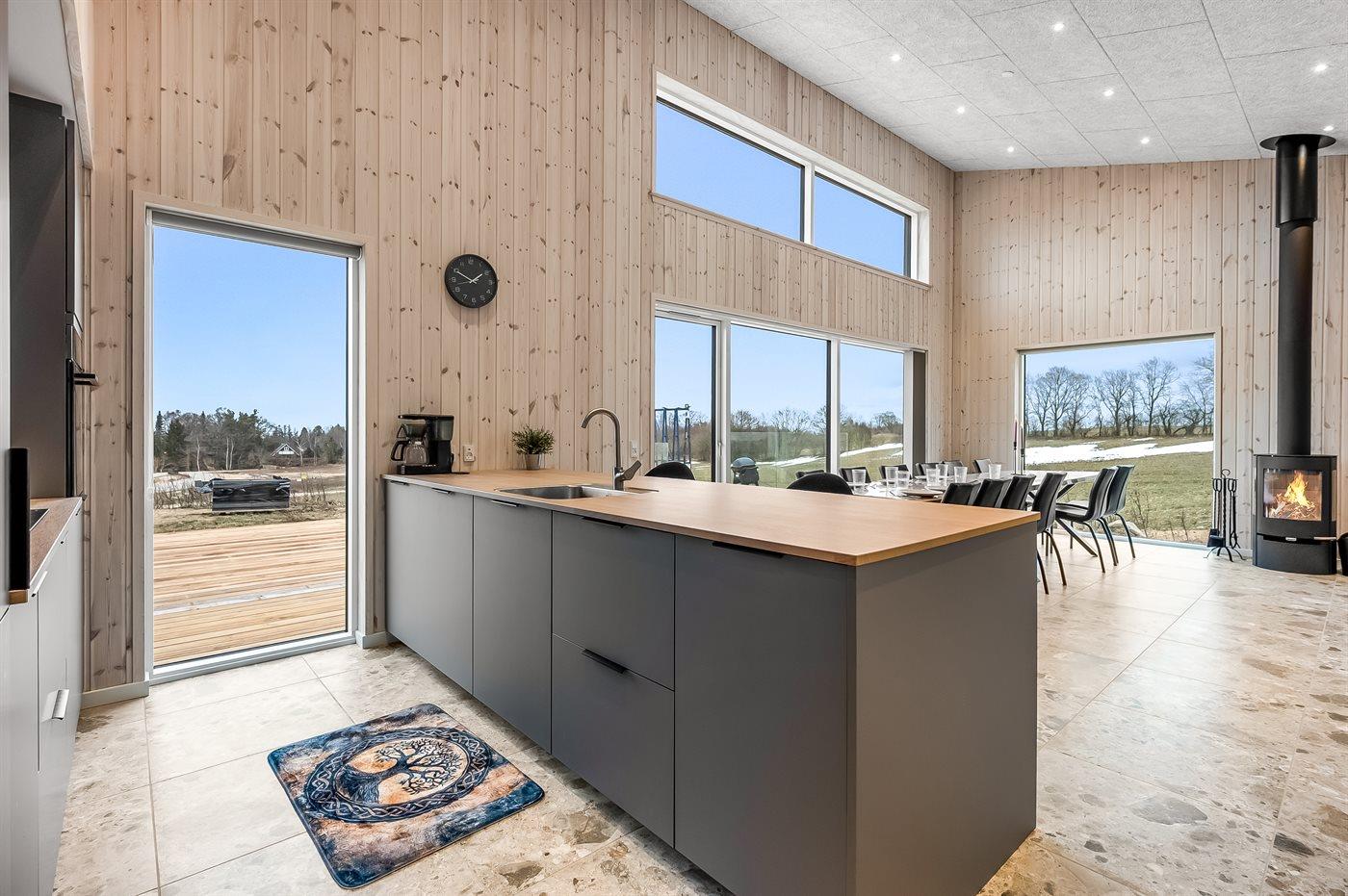 Køkkenet er udstyret med 1 køleskab. Der er 4 induktionskogeplader, varmluftovn, mikrobølgeovn samt opvaskemaskine.