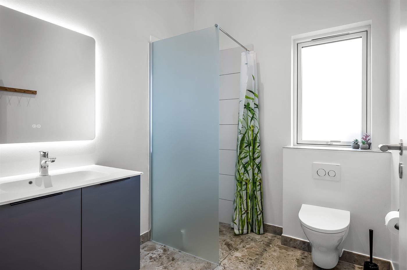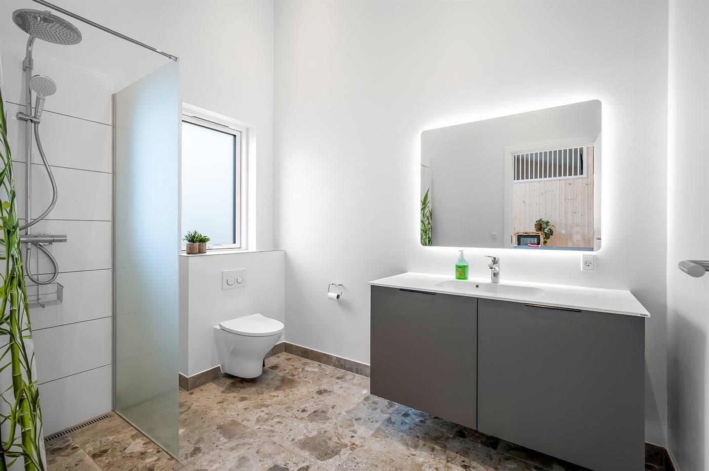 Der er 2 badeværelser med bruseniche og 2 toiletter. Der er gulvvarme på 2 badeværelser.