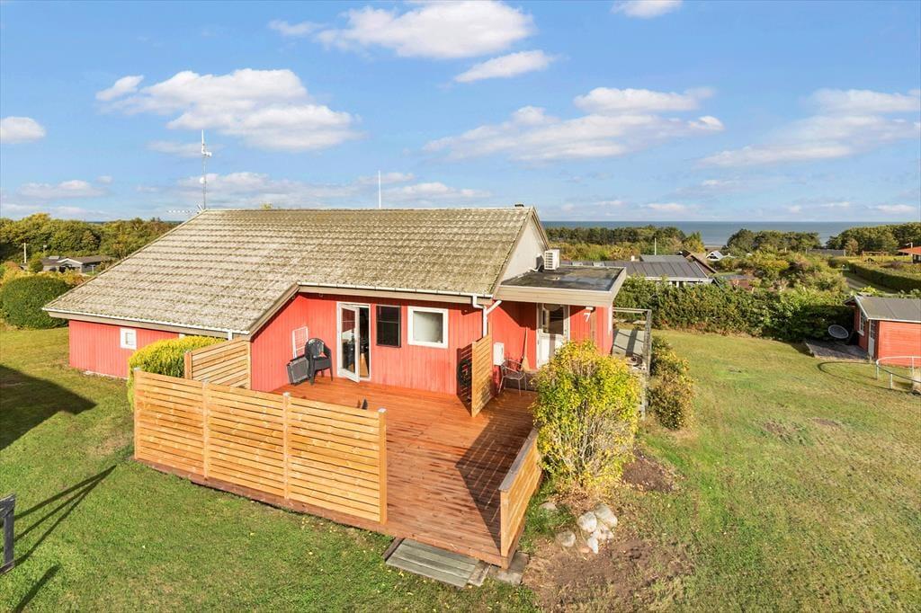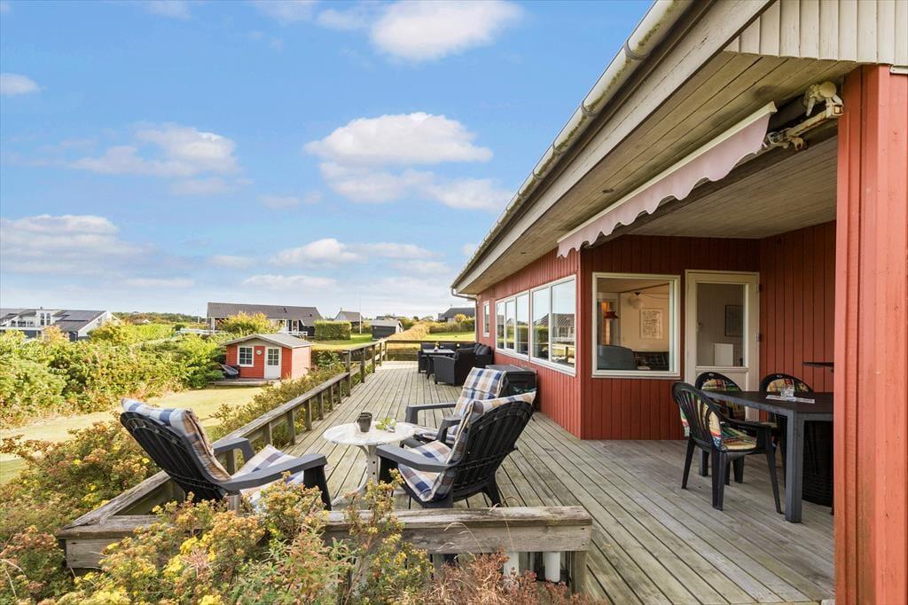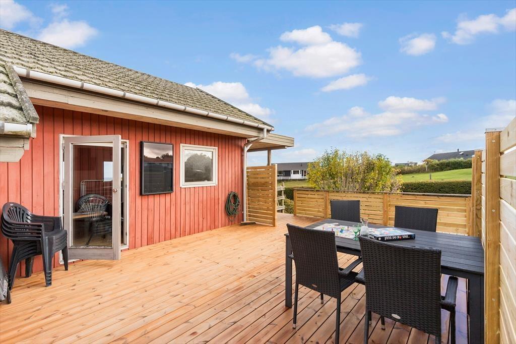 Udenfor venter en skøn grund, der indbyder til både ro og fælles hygge. Den store terrasse åbner sig mod havet og giver jer en fantastisk udsigt, som kan nydes dagen lang. Her finder I et overdækket område med grill og spisebord – perfekt til lange sommeraftener – og overdækningen kan nemt forlænges med en markise, så I altid sidder godt i læ.