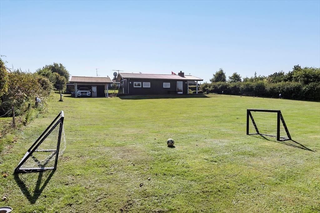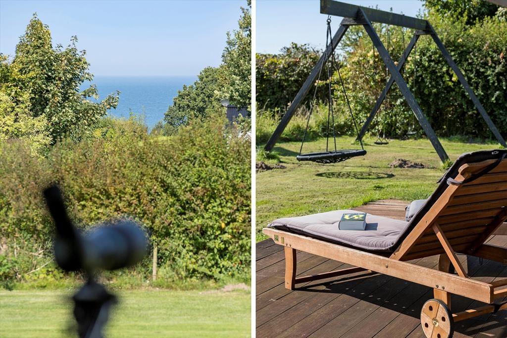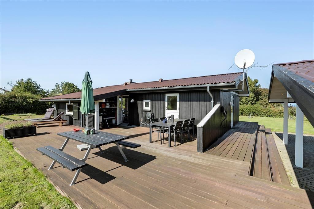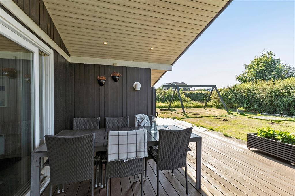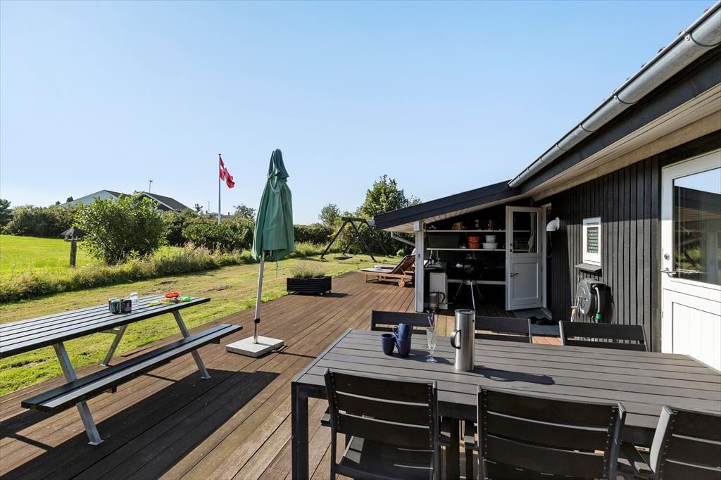Du kan skimte havet, der ligger blot 700 meter borte. Rundt om huset breder en stor træterrasse sig ud, indbydende til afslapning og hyggelige grillmiddage. Her er der plads til det hele – lige fra en solstol i hjørnet, hvor du kan nyde morgenkaffen, til et stort bord, hvor familien kan samles om dagens måltider.