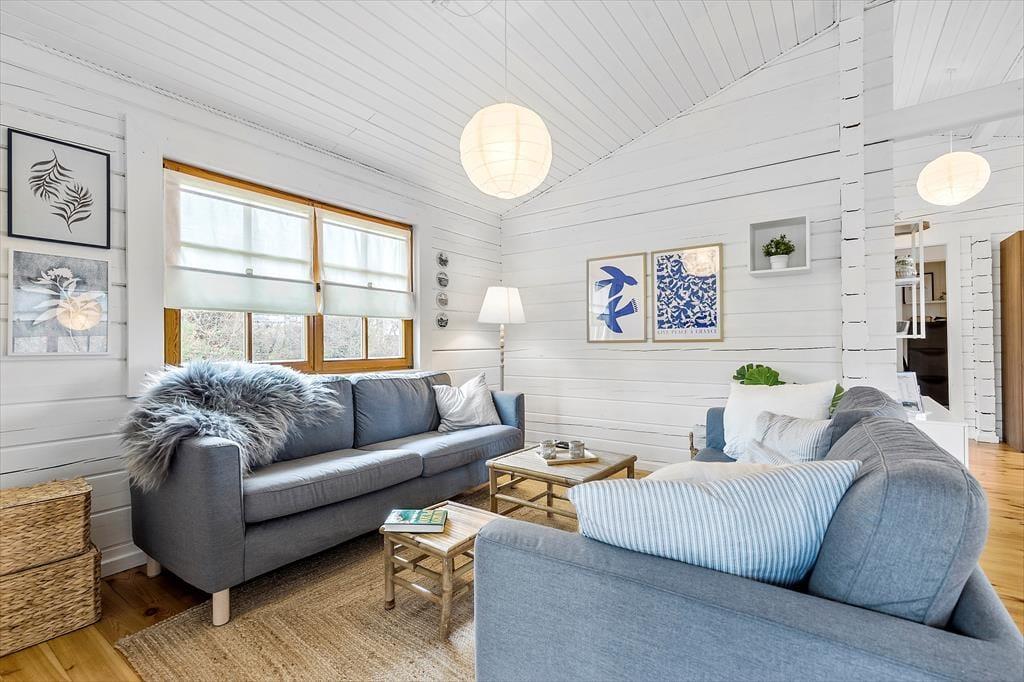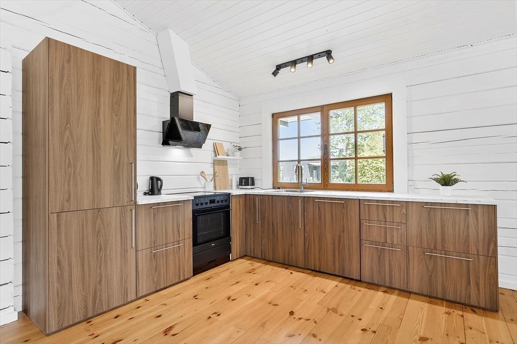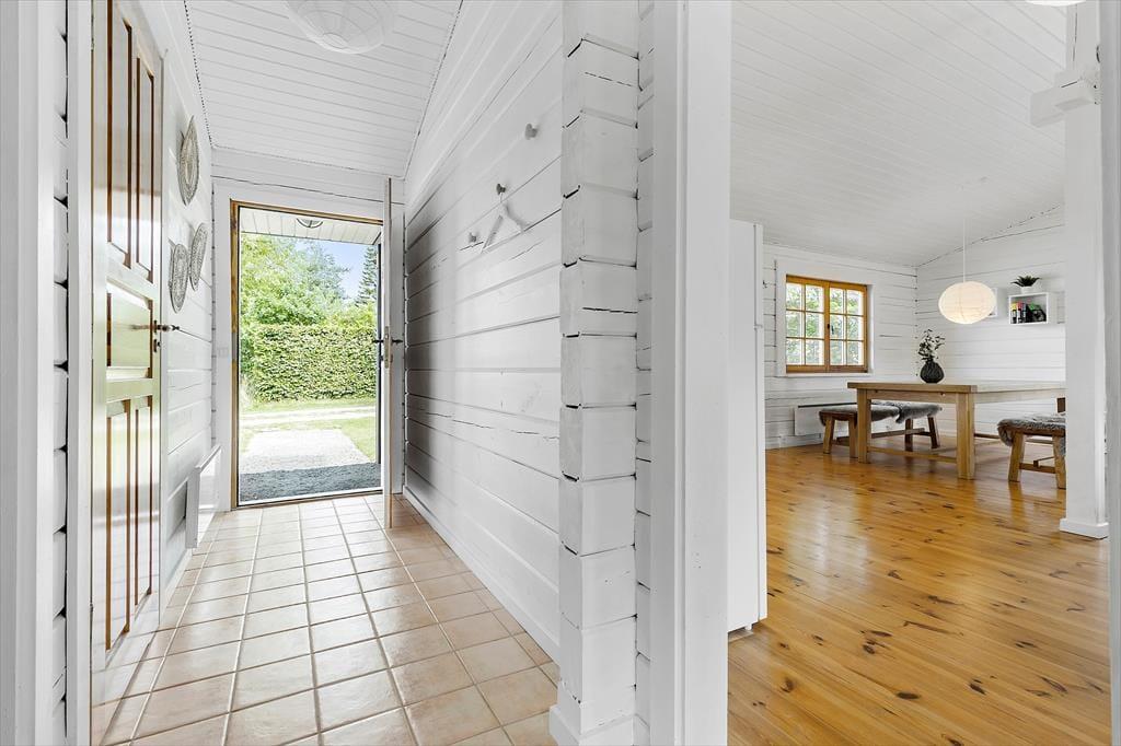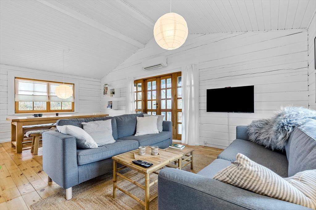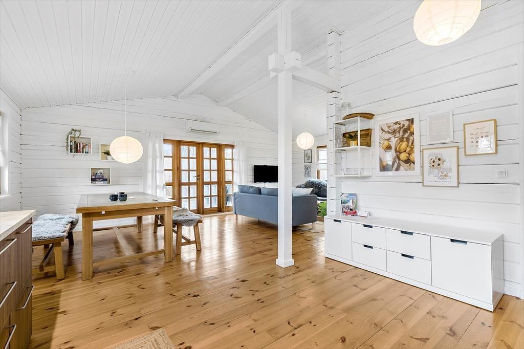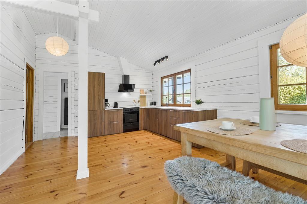 Velkommen indenfor Forestil dig et charmerende og lyst bjælkehus, hvor hyggen sidder i væggene, og der er plads til både afslapning og samvær. Huset, der blev opført i 2001 og nænsomt renoveret i 2023, emmer af stil og atmosfære. Når du træder ind, mødes du af en bolig, der kombinerer moderne komfort med klassisk sommerhusstemning – alt sammen smagfuldt indrettet for at skabe de perfekte rammer for din ferie. I husets ene ende finder du hjertet af hjemmet: et stort og indbydende rum, hvor et moderne køkken fra 2024 danner rammen om madlavning og hyggelige stunder. Her kan du snitte, stege og røre, mens du stadig er en del af samtalerne ved spisebordet eller i den hyggelige opholdsstue. Fra stuen åbner en dør sig ud til en skøn veranda, der hurtigt bliver dit foretrukne sted. Her kan du sætte dig godt til rette i komfortable møbler og lade tiden flyde, mens du fordyber dig i en god bog, nyder en kop kaffe eller spiller brætspil med familien – selv hvis regnen trommer let på taget. Når natten nærmer sig, venter to rummelige soveværelser med store, behagelige dobbeltsenge, der inviterer til en god nats søvn. Huset byder også på et veludstyret badeværelse med brusekabine og en praktisk entré, der gør det nemt at komme på plads efter dagens eventyr. Dette bjælkehus er ikke bare en feriebolig – det er et fristed, hvor minder skabes, og feriedrømme går i opfyldelse.