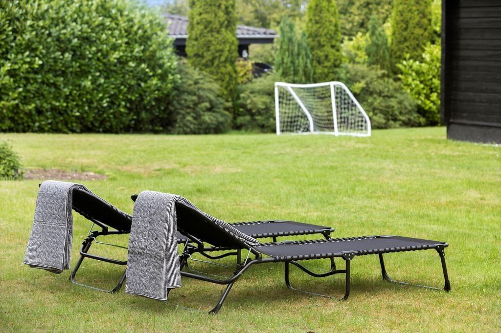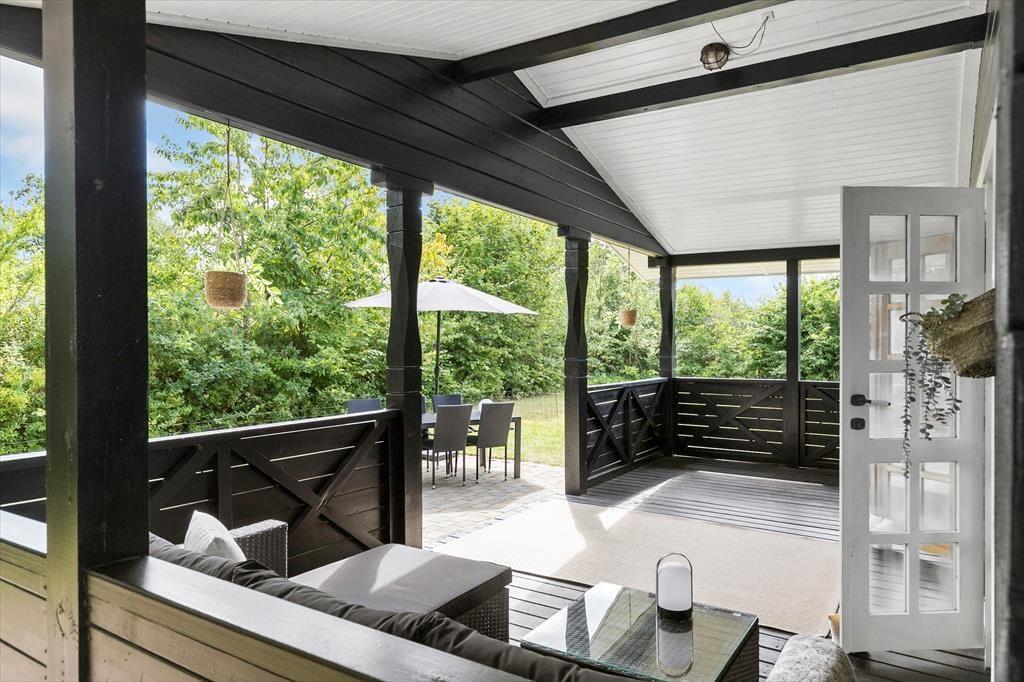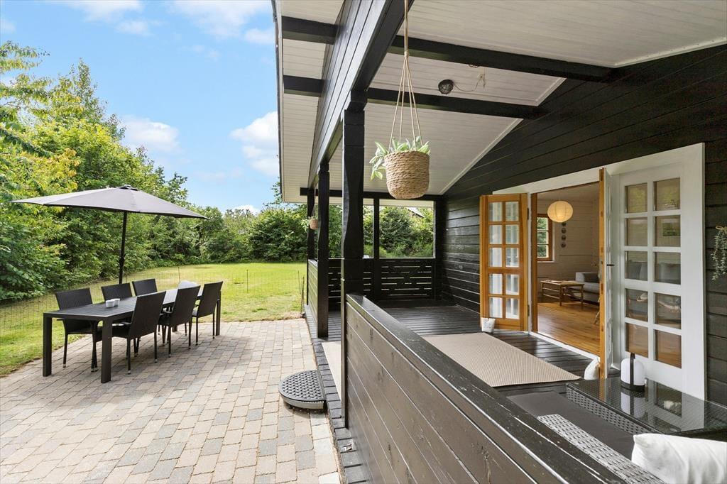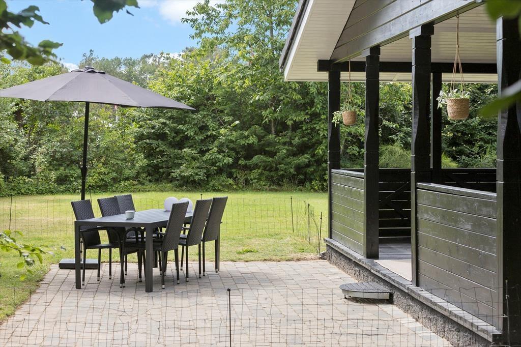 Grunden inviterer til både leg og afslapning – en næsten helt plan oase med en stor græsplæne, hvor der er plads til boldspil, latter og konkurrence. Fodboldmålet står klar til at sætte rammen for sjove kampe, og inden længe vil grinene fylde luften, mens I afgør, hvem der skal stå for morgendagens tur efter friske rundstykker. Når legen er ovre, trækker verandaen i dig med sin hyggelige charme og bliver let dit favoritsted, uanset årstiden. I foråret og efteråret kan du finde ro og varme, mens du pakker dig ind i et tæppe og lytter til naturens lyde omkring dig. Om sommeren er verandaen et tilflugtssted fra solens stråler, hvor du kan nyde skyggen med en kold drink, eller stedet, hvor aftenerne forlænges, når duggen begynder at falde, og samtalerne flyder under stjernerne. Kun en kort gåtur væk – mindre end 1 kilometer – venter stranden. Med sit lave vand og bløde sandbund er den som skabt til børneleg og afslapning for hele familien. Det er her, sommeren får sin duft af saltvand, og feriestemningen for alvor rammer.