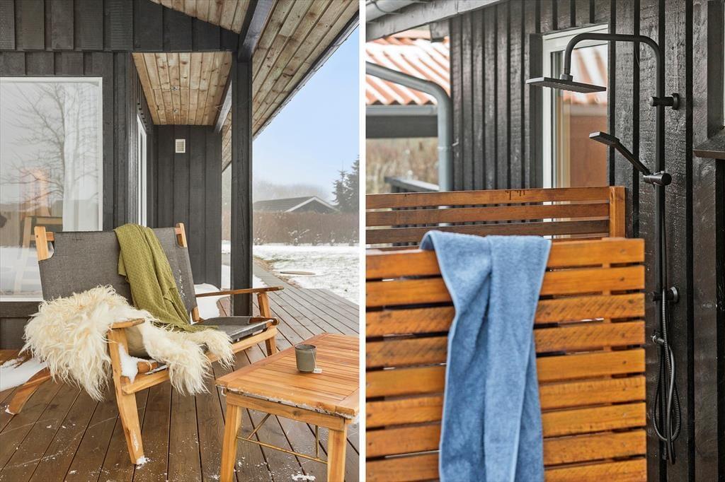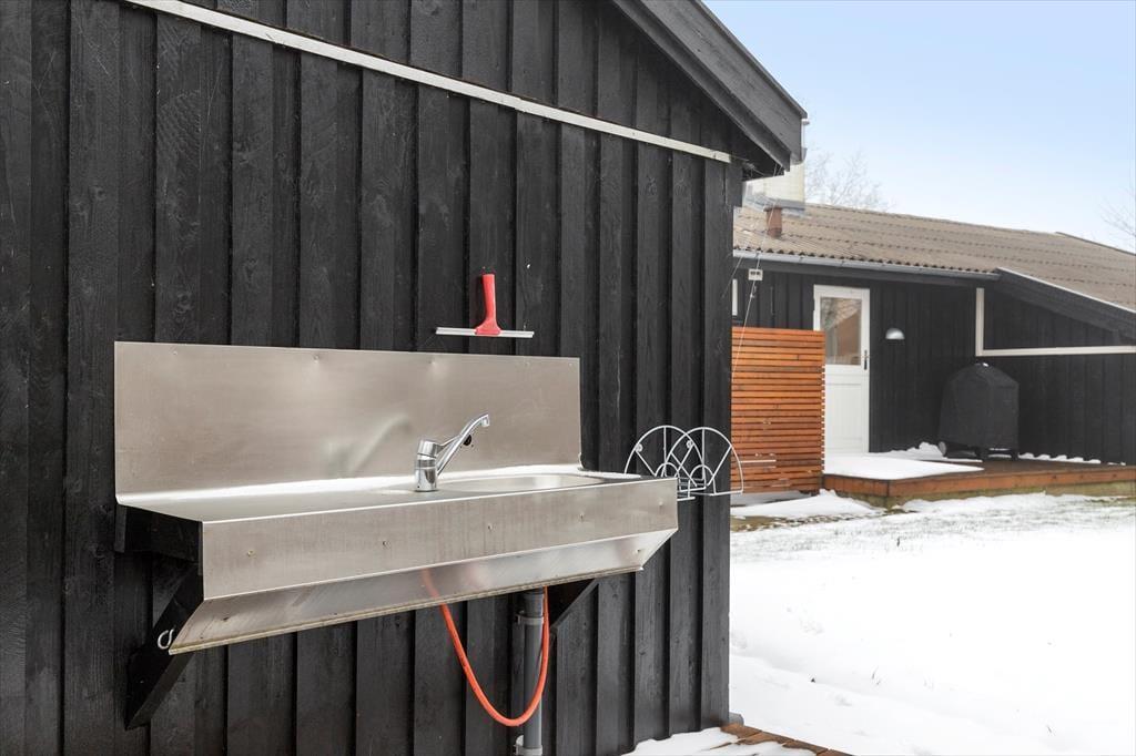 Udendørs breder ferieparadiset sig, og her er virkelig tænkt på, hvordan du bedst nyder livet. Grunden er lukket og plan, så børnene kan lege frit, mens du kan nyde privatlivet og den smukke natur omkring dig. Om aftenen samles familien omkring bålet, og de ristede skumfiduser smelter på tungen, mens ilden danser foran jer. Efter en dag ved stranden kan du skylle sandet af kroppen i den praktiske udebruser, eller måske tage et forfriskende morgenbad under åben himmel. Hvis du har været ude at fiske, er der en praktisk fiskerenseplads, hvor du kan forberede dagens fangst, inden du tænder op i grillen og laver et dejligt feriemåltid. Og når kroppen trænger til varme, venter saunaen, hvor du kan varme dig op efter en frisk dag i naturen – eller måske rulle dig i sneen og mærke kulden mod huden bagefter. Kun 700 meter fra huset ligger stranden, og her kan du virkelig slappe af og nyde livet.