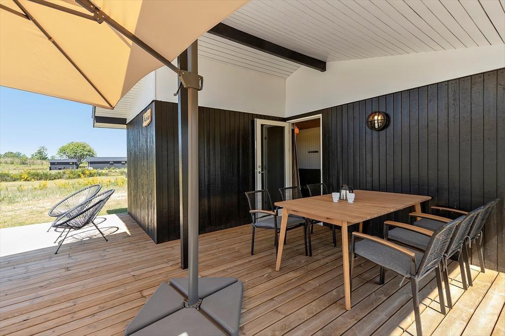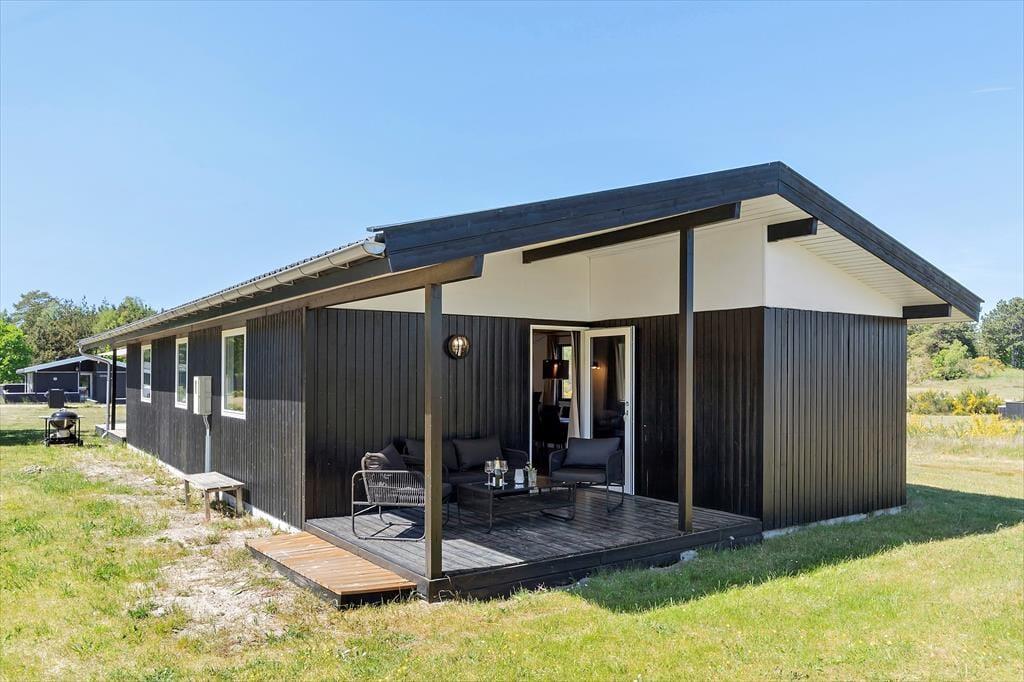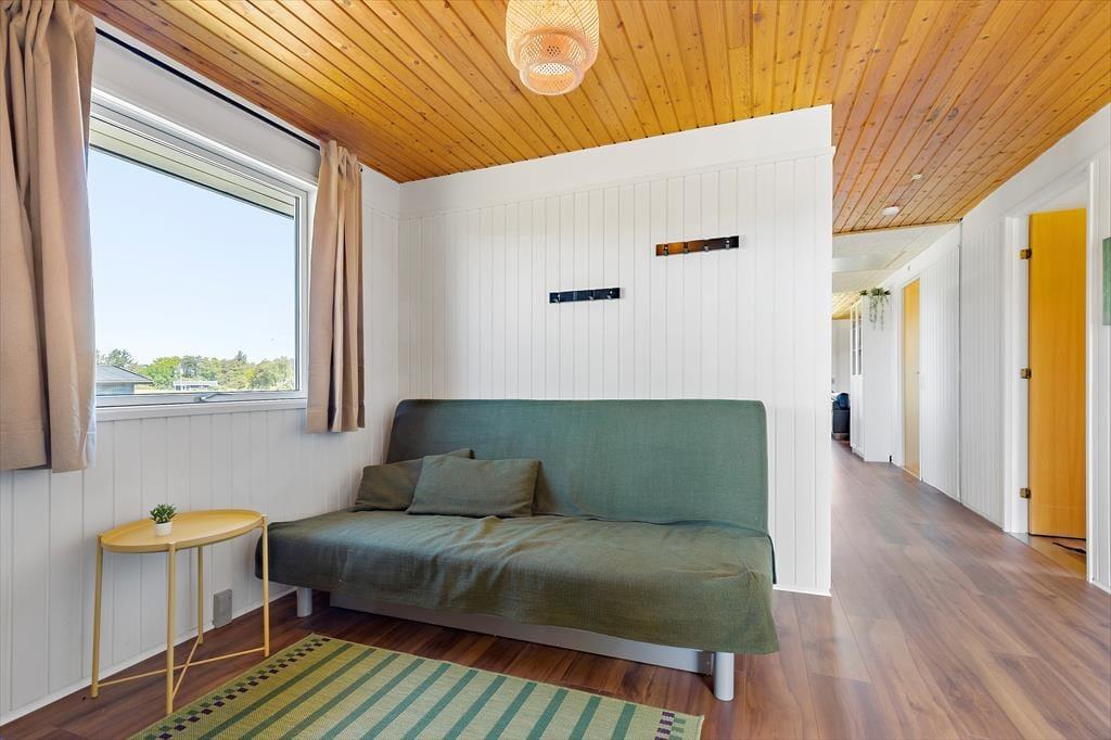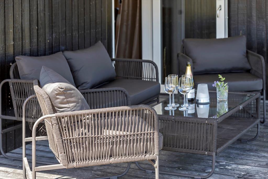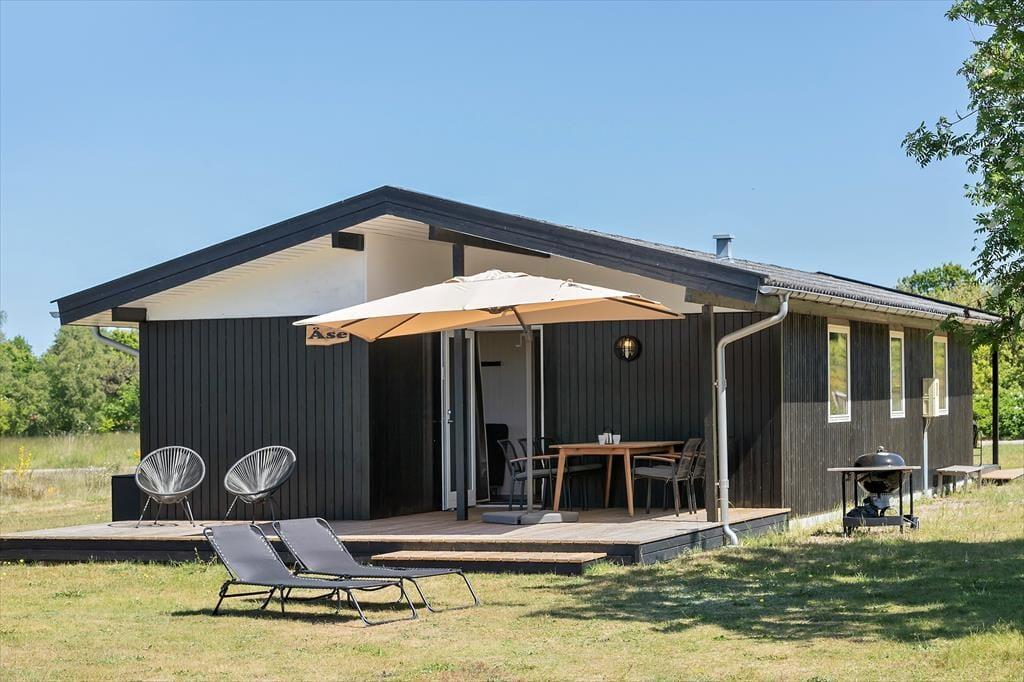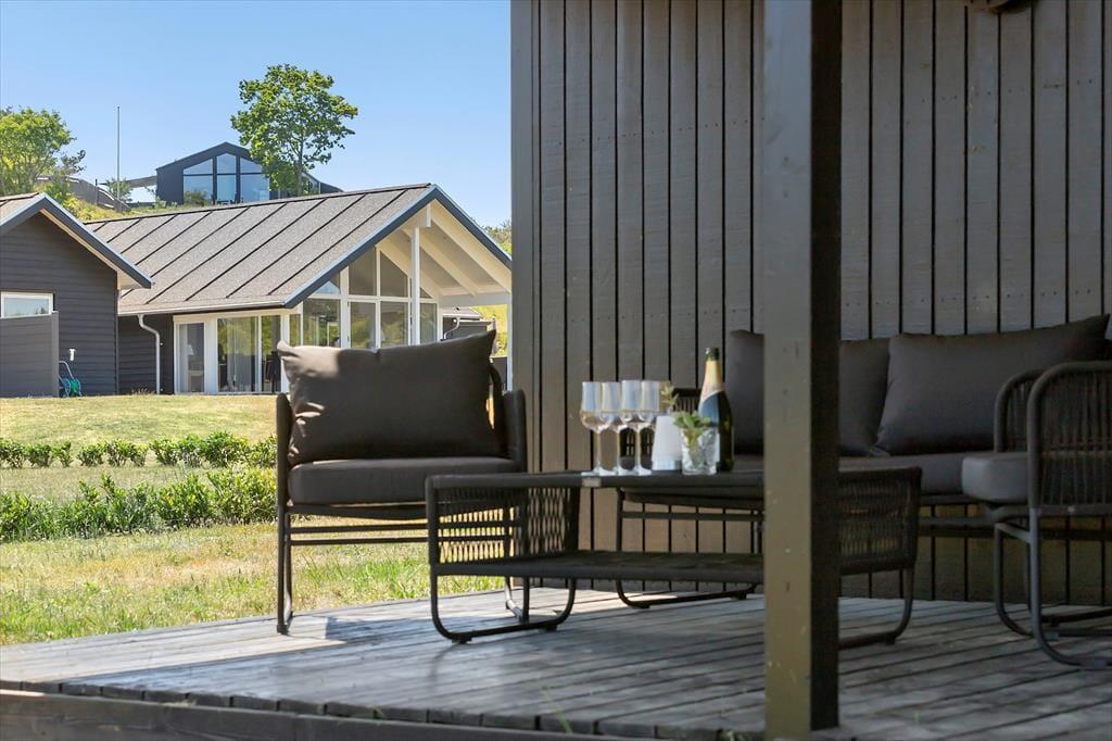 Kun 350 meter fra husets dør finder du den dejlige, børnevenlige strand. Den fine, flade grund omkring huset er perfekt til aktiviteter, boldspil og udendørs leg. Der er to solrige terrasser – én mod øst ved indgangen og én mod vest med udgang fra stuen. På den østvendte terrasse kan du nyde morgensolen over en kop kaffe, mens du på den vestvendte terrasse kan slappe af med loungemøbler og nyde den lange sommeraften med grill og hygge.