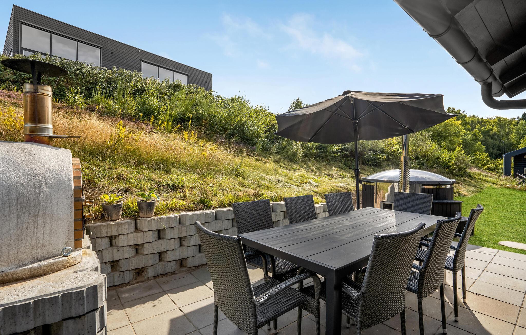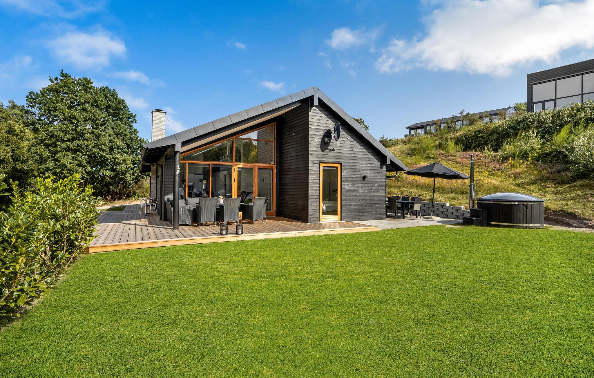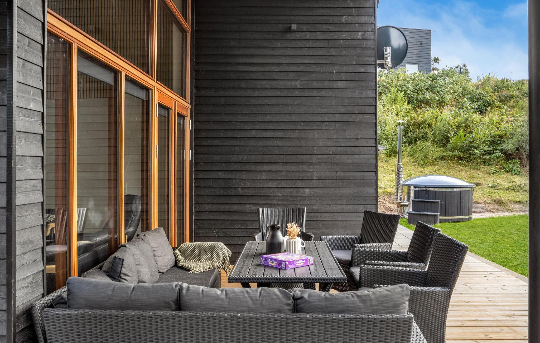 Når solen er fremme, kommer I formentlig til at trække ud på den store træterrasse, som er udstyret med komfortable havemøbler, og som har både overdækkede og åbne arealer. Her kan I spise morgenmad, nyde solen og holde hyggelige grillaftener. Børn og hunde vil elske at løbe rundt og lege på den store naturgrund. Om aftenen er der intet bedre end at sætte sig godt til rette med en drink i vildmarksbadets dejligt varme vand.