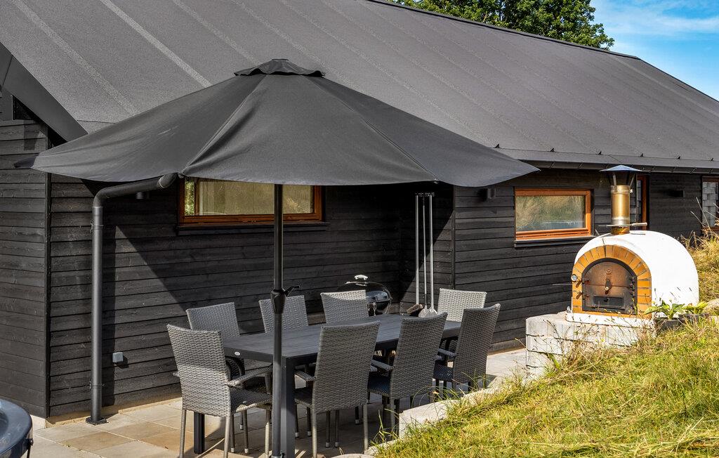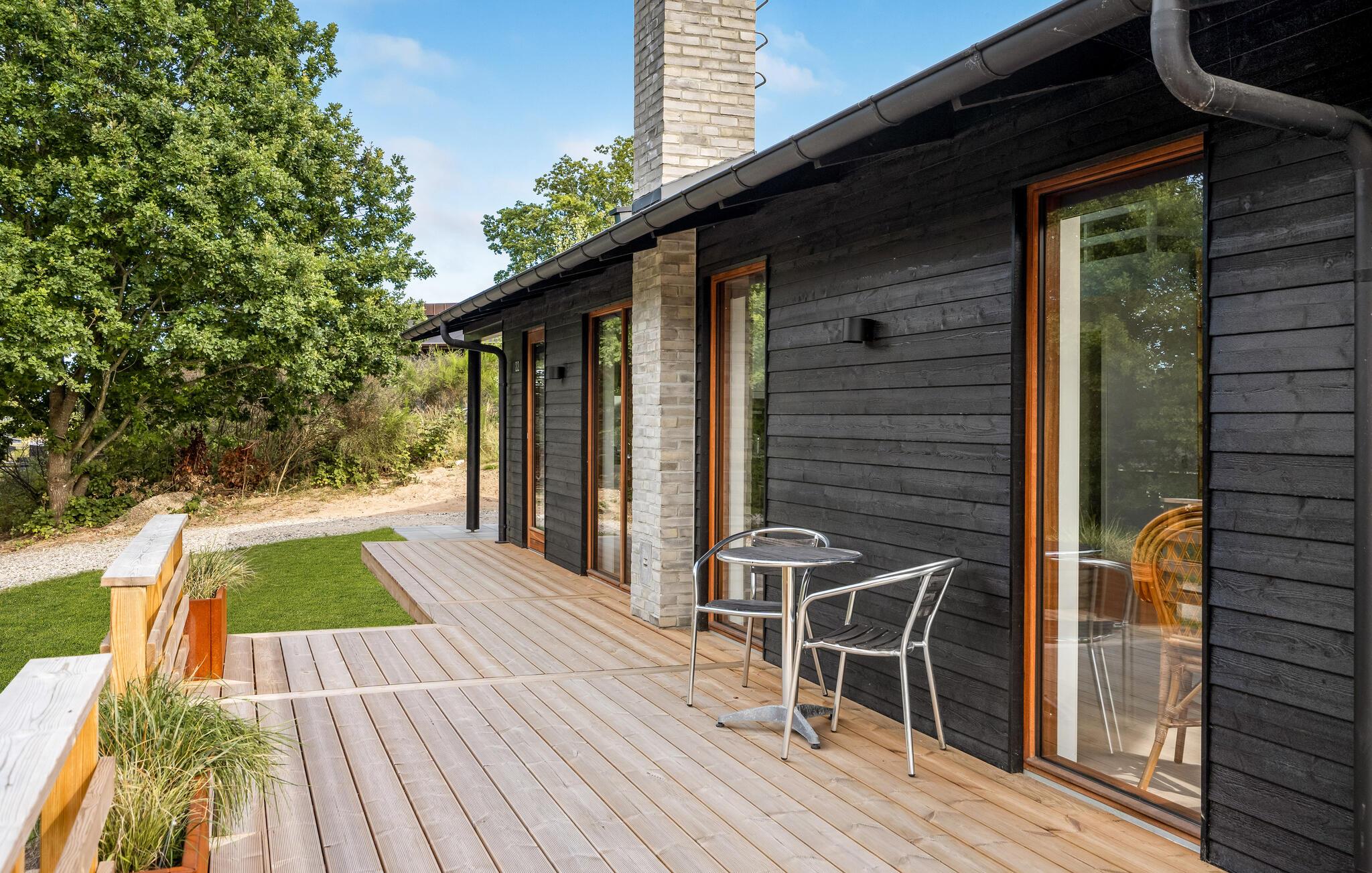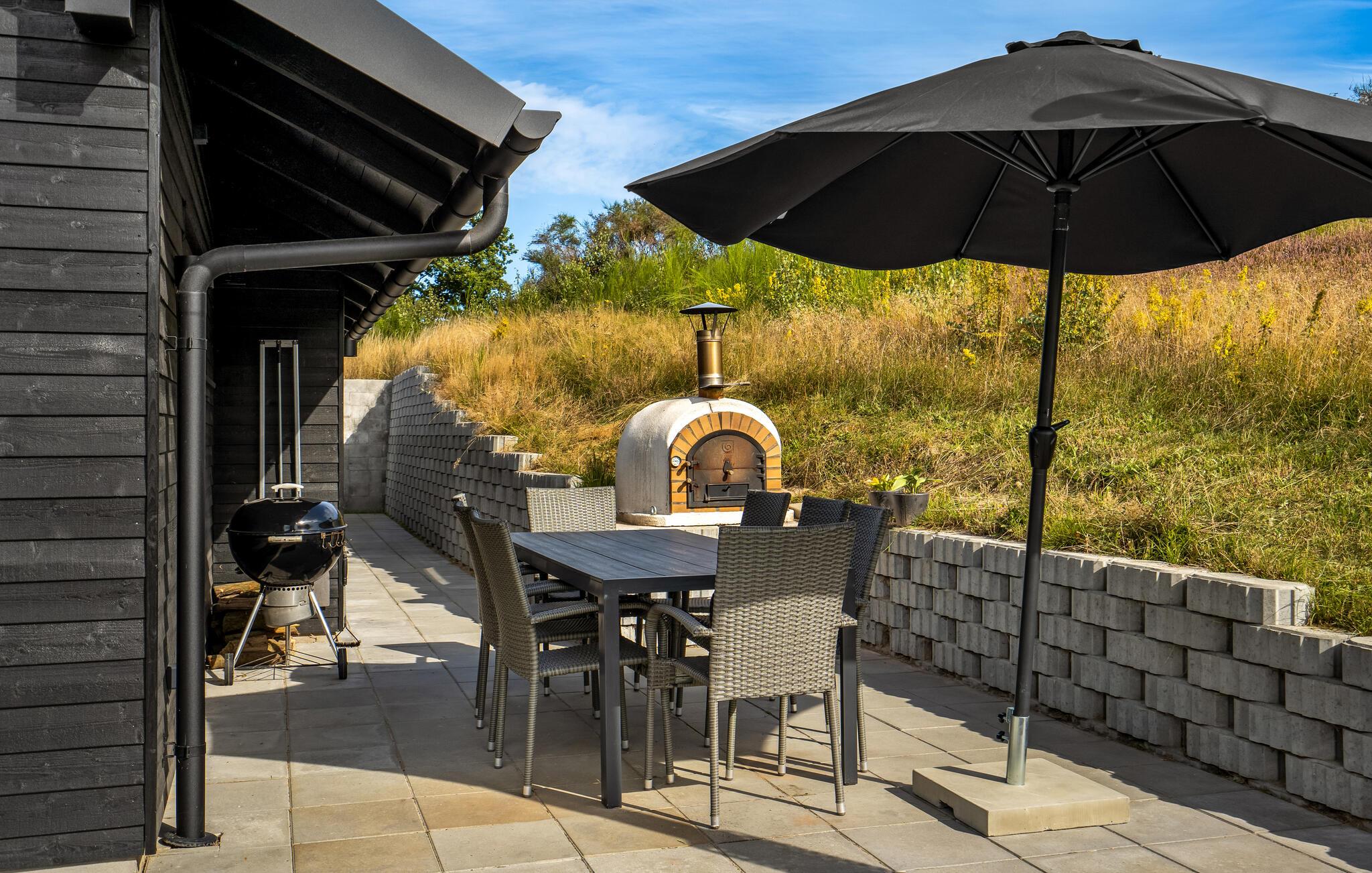 Når solen er fremme, kommer I formentlig til at trække ud på den store træterrasse, som er udstyret med komfortable havemøbler, og som har både overdækkede og åbne arealer. Her kan I spise morgenmad, nyde solen og holde hyggelige grillaftener. Børn og hunde vil elske at løbe rundt og lege på den store naturgrund. Om aftenen er der intet bedre end at sætte sig godt til rette med en drink i vildmarksbadets dejligt varme vand.