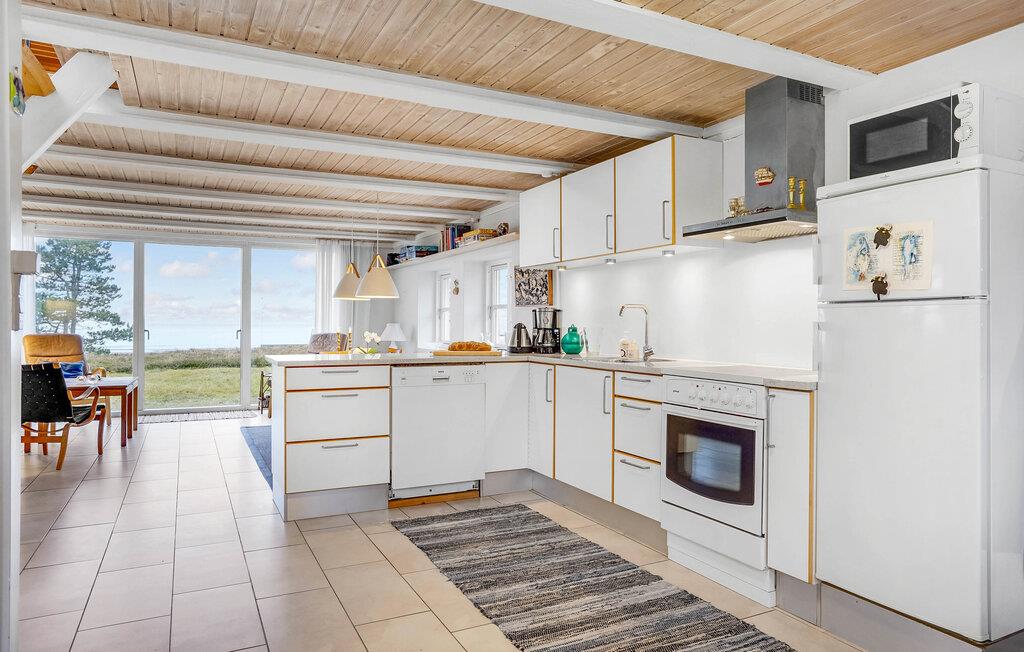 Velkommen til jeres eget ferieparadis! Huset emmer af feriestemning over to etager. Takket være dets høje beliggenhed kan I nyde en fantastisk udsigt over havet fra køkkenalrummet i stueetagen og balkonen på første etage. Træelementer, store vinduespartier og smagfuld indretning gør, at I øjeblikkeligt vil føle jer hjemme her. Køkkenet ligger i åben forbindelse til opholdsområdet, således at feriekokken/kokkene kan holdes med selskab under madlavningen. I stuen kan I hygge jer med kort- og brætspil, fjernsyn og ferielæsning, mens flammerne knitrer i brændeovnen.