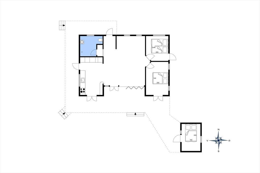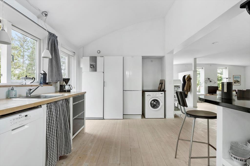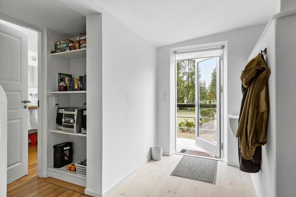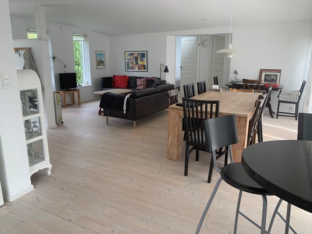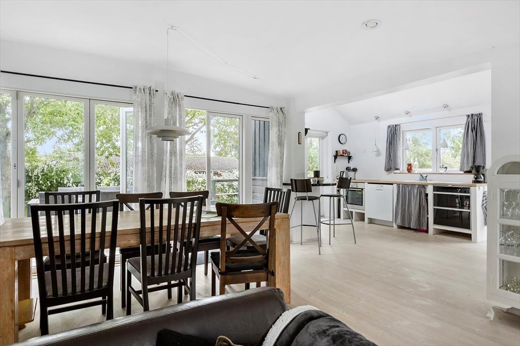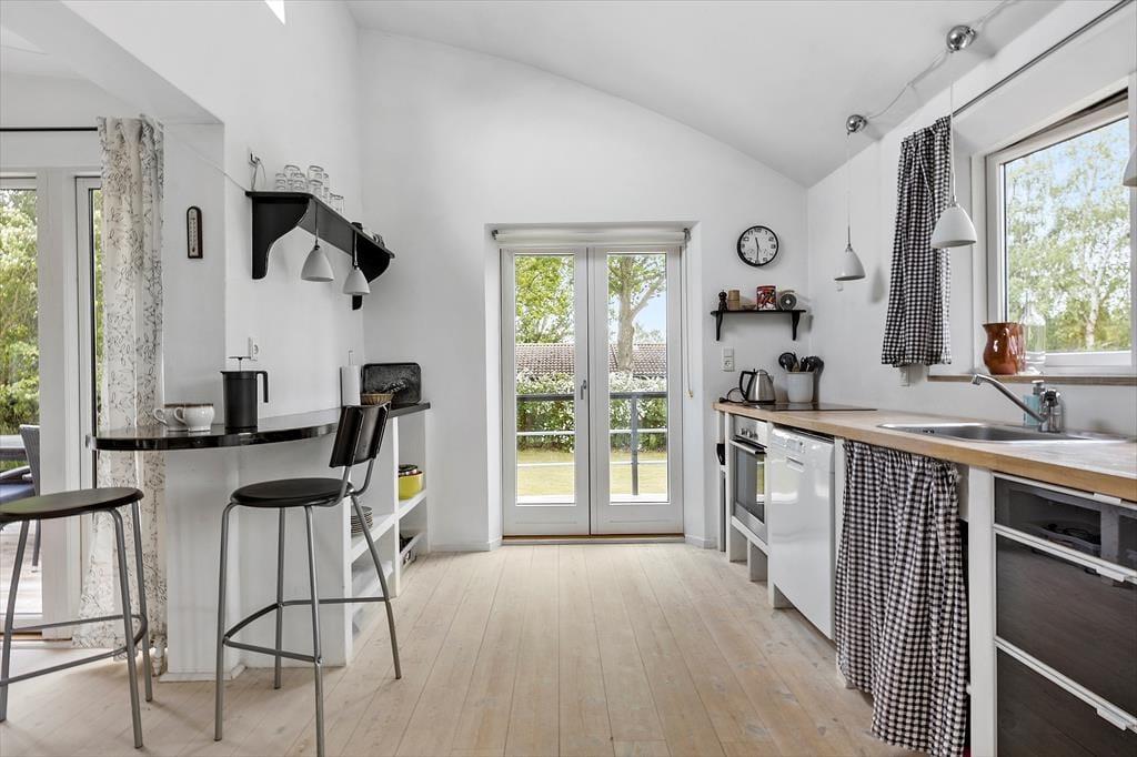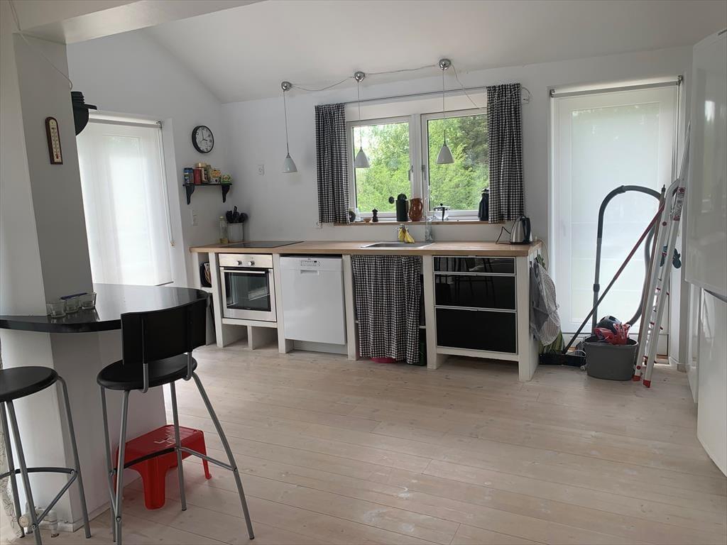 Rummelig entre med adgang til pænt badeværelse, som indeholder toilet og bruseniche. Lyst og indbydende køkken i åben plan med opholdsstue. Køkken med 4 kogeplader, ovn, kaffemaskine, elkedel og køle/fryseskab, opvaskemaskine og vaskemaskine. I stuen er der spiseplads og sofa med chaise lounge, tv og dvd afspiller og Chromecast, radio med cd afspiller. I alle rum er der trægulve og huset har gulvvarme. Fra stort set alle rum kan man gå ud på træ terrasse.