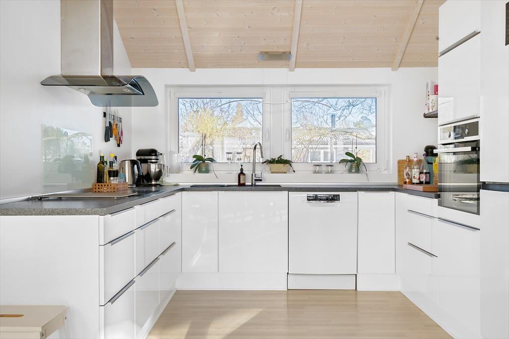 I køkkenet er der keramiske kogeplader og ovn, emhætte, mikroovn, opvaskemaskine, samt køleskab og fryser, kaffemaskine og elkedel.