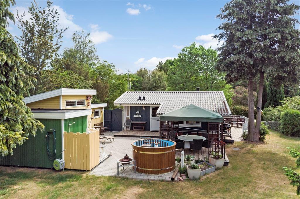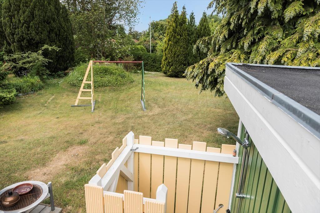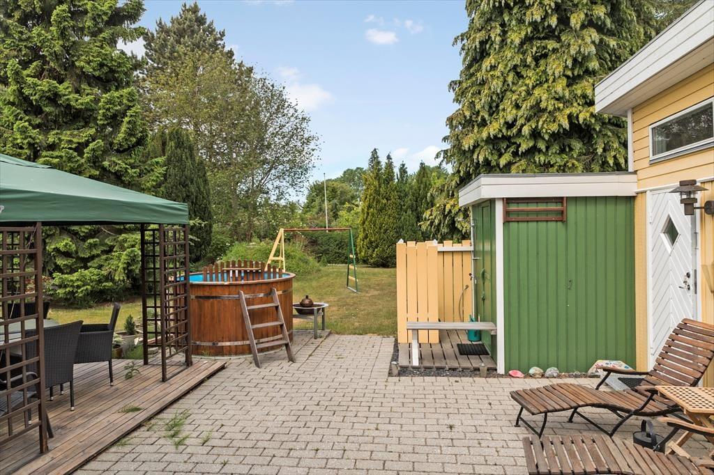 Indhegnet ugenert grund på ca. 1.000 m² med legehus, lukket solgård, havepavillon, gynger, sandkasse, liggestole og hængekøje, vildmarksbad.