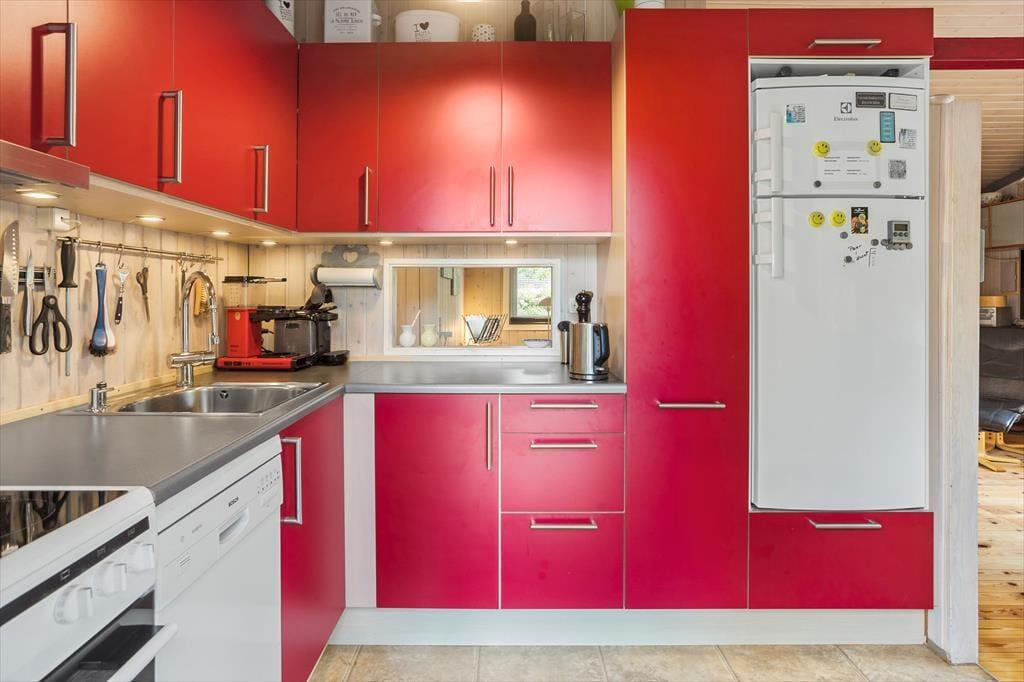 Køkken med komfur, bageovn, kogeplader, opvaskemaskine, køleskab samt lille fryseskab.