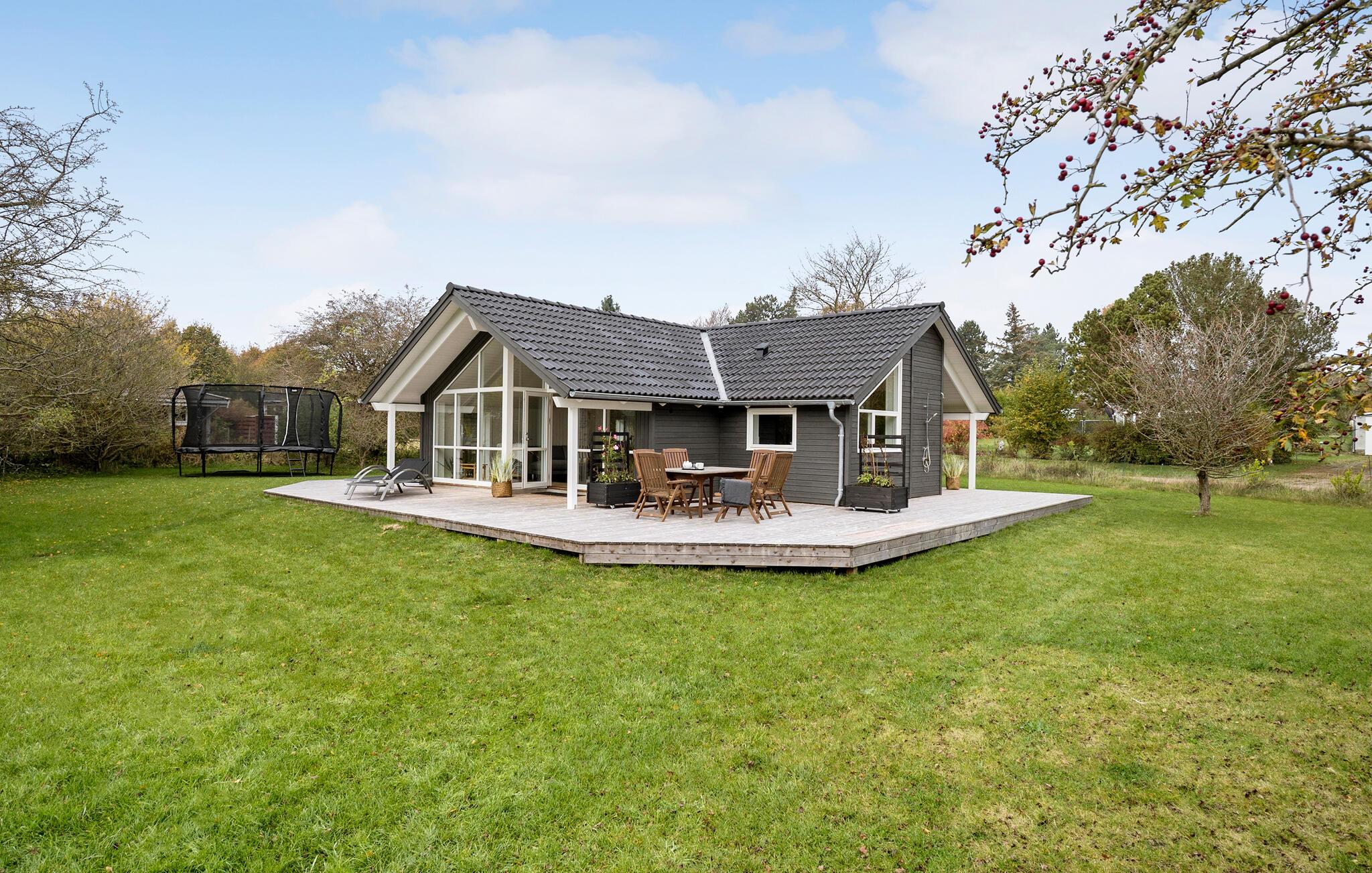 Dette smukke feriehus med store vinduespartier byder på et hyggeligt og indbydende miljø. Den smagfulde indretning og det velovervejede design skaber den perfekte ramme for afslapning og kvalitetstid med familien. Det rummelige og lyse opholdsområde er ideelt til at glemme hverdagen. Den store træterrasse, der omkranser store dele af huset, er perfekt til solbadning, grillmad og fælles måltider i det fri. Imens kan børnene lege og tumle frit i haven.