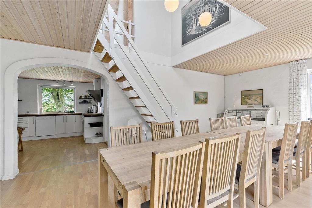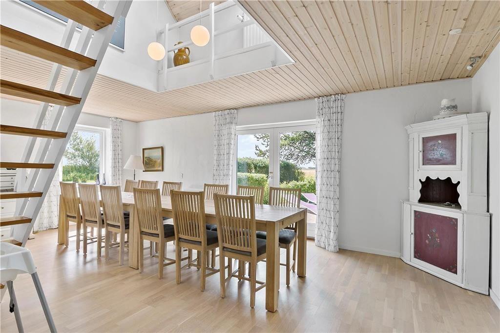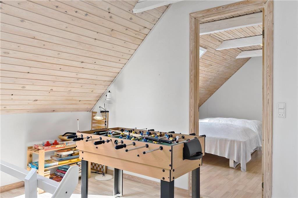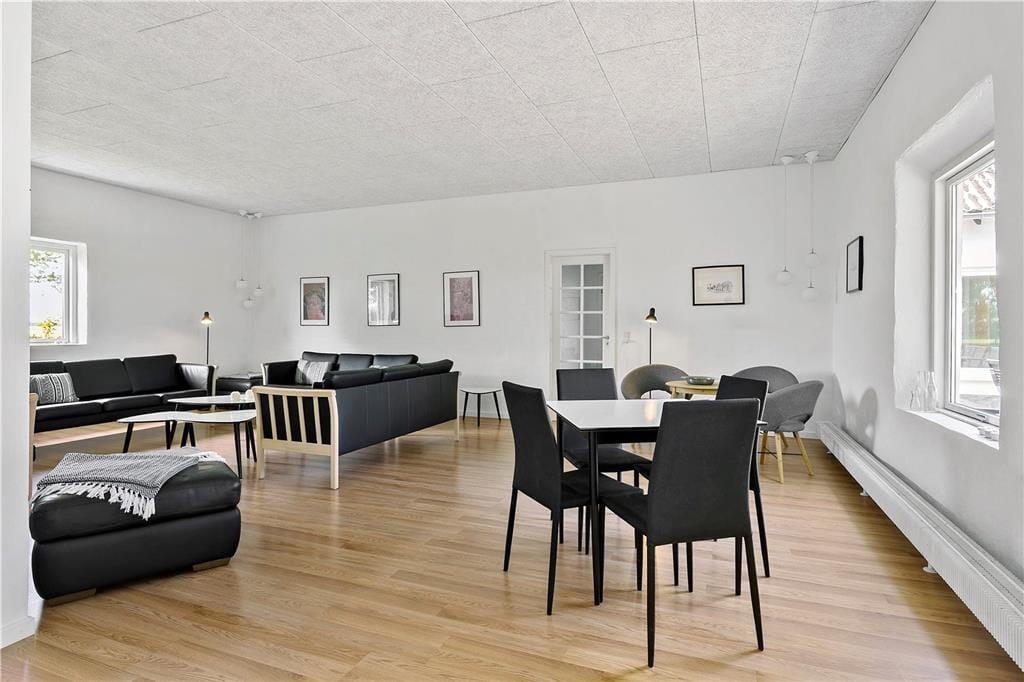 Intet mindre end 385 m2 er fordelt på sommerhusets to etager, og både oppe og nede præsenterer rummene sig på lys og indbydende vis. Takket være de mange kvadratmeter og den formfuldendte indretning kan I nemt invitere et stort selskab med på ferien. Planløsningen byder blandt andet på fem soveværelser og hele tre badeværelser, så 11 personer kan uden problemer samles til dasedage i roligt tempo. Opholdsrum finder I også flere af inden døre: På førstesalen ligger et gennemgangsrum med bordfodbold, mens stueetagen rummer en stor opholdsstue og en ditto spisestue med åben forbindelse til et velindrettet køkken. Det er naturligvis også oplagt at samles i sommerhusets poolafdeling, hvor I kan gå i sauna og plaske i swimmingpoolen, der har målene 7 x 4 x 1,30 meter.